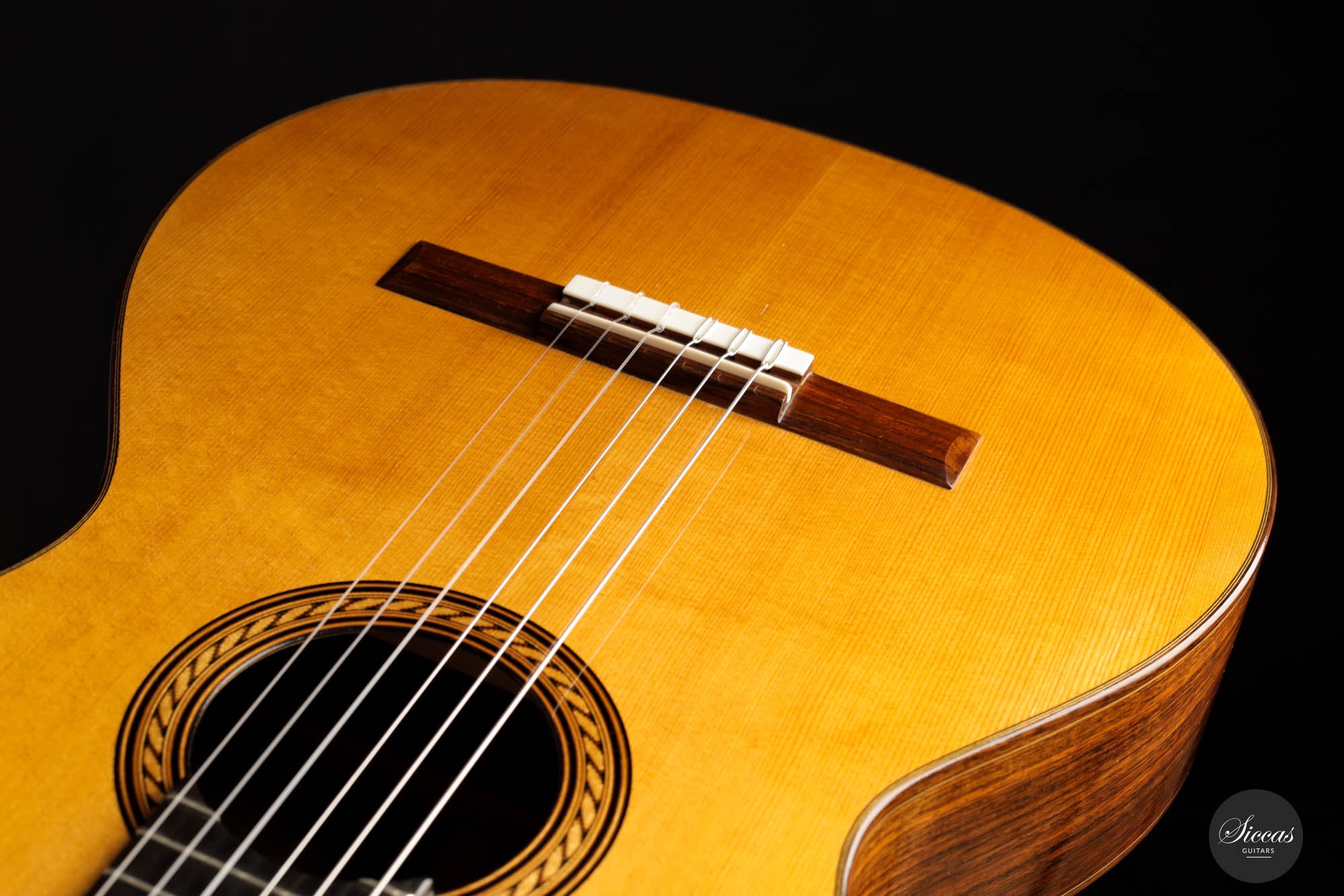 Whether you're serenading an audience or lost in a personal musical reverie, this classical guitar, with its spruce top and Indian rosewood back and sides, promises a journey of sonic delight and timeless elegance. There are some superficial play marks on the instrument but no cracks.