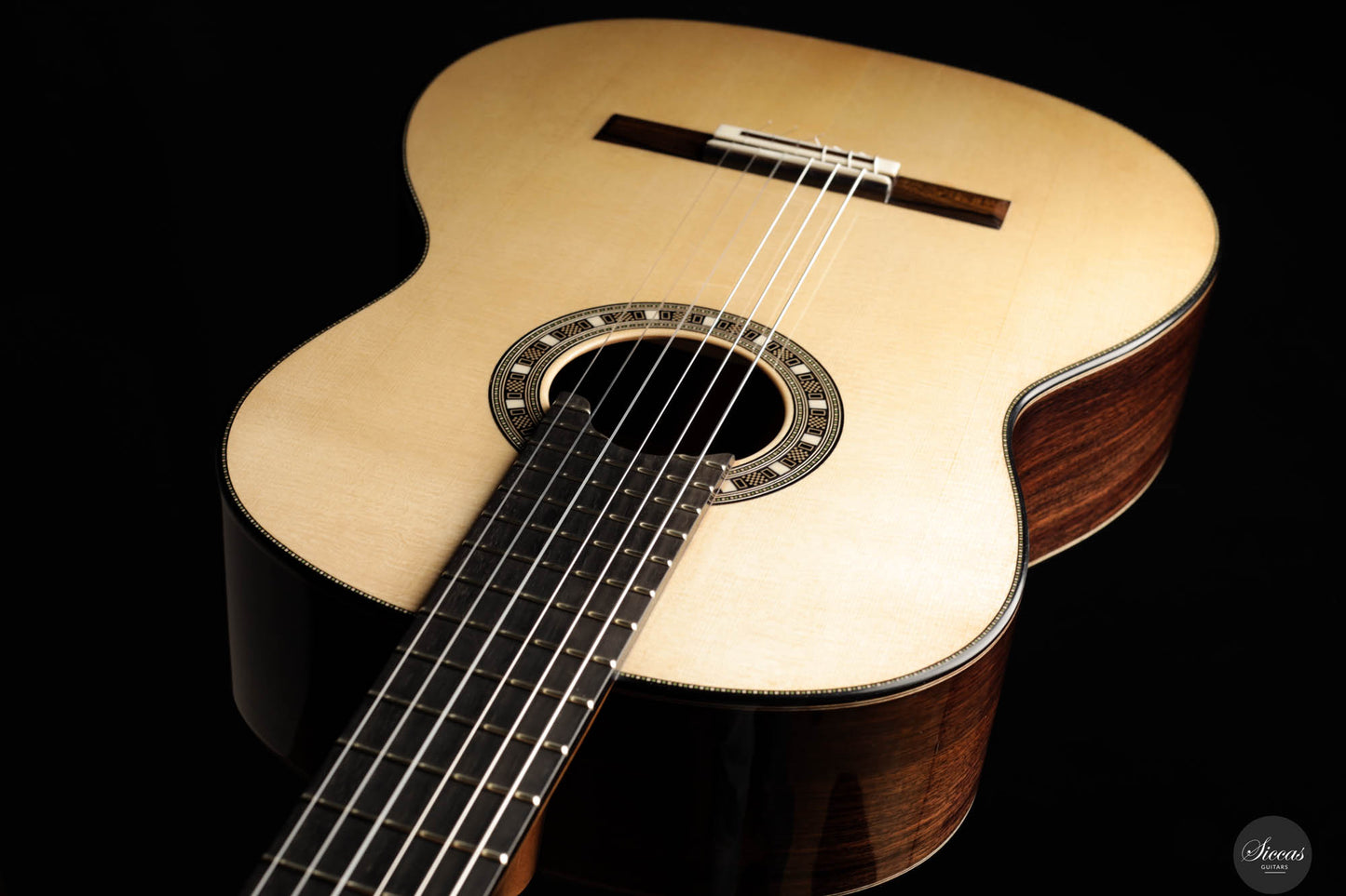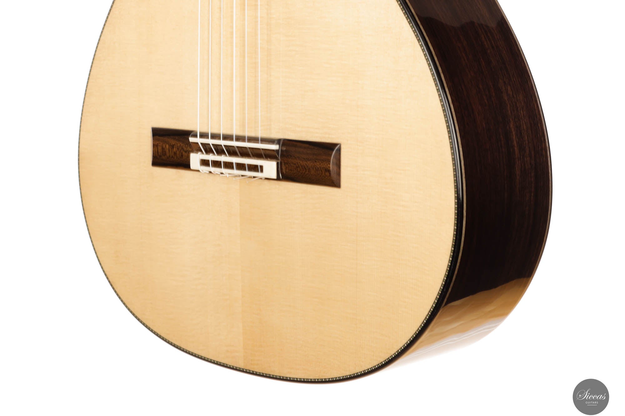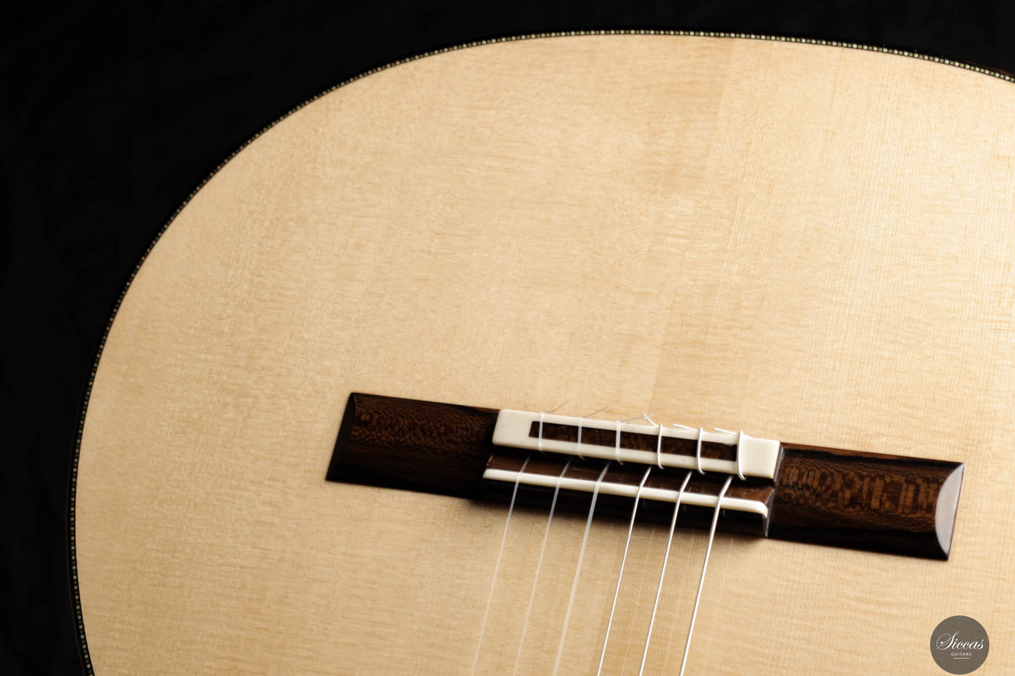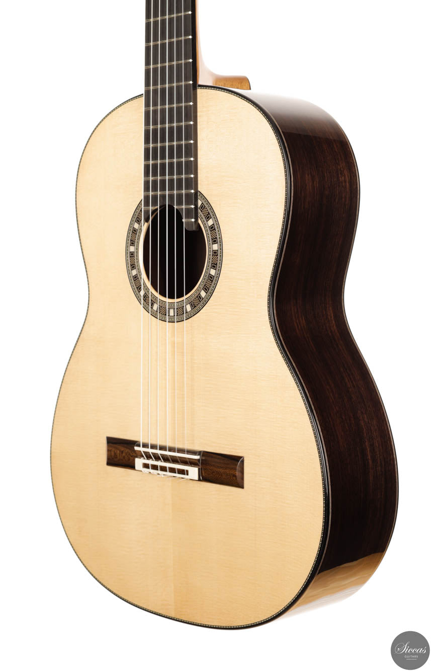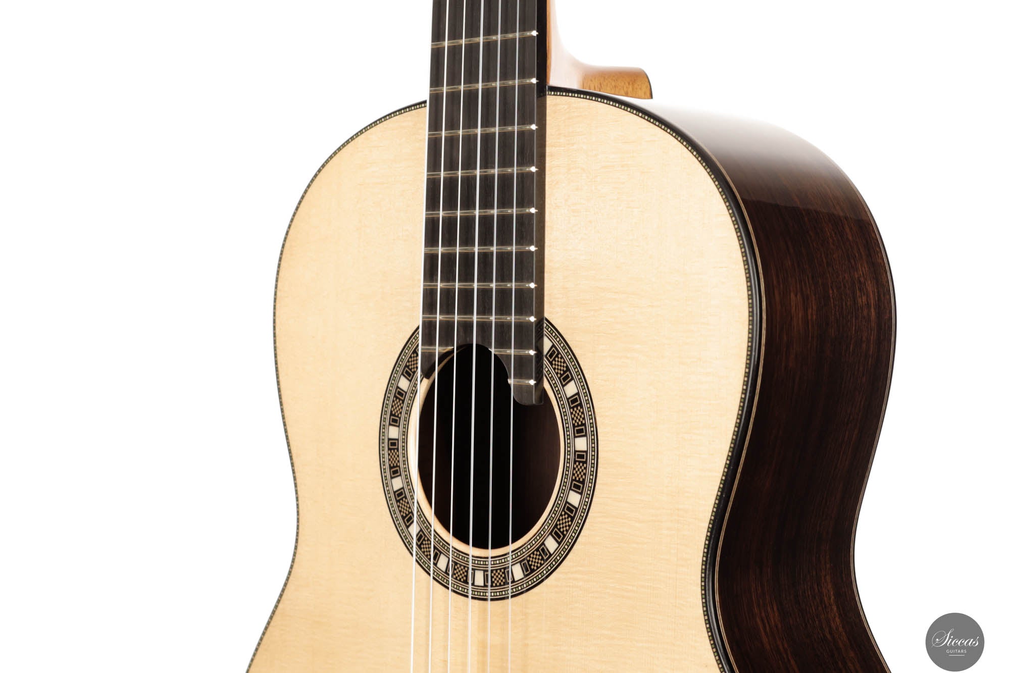 The 2023 Alessandro Perciaccante guitar epitomizes the essence of traditional Spanish guitar craftsmanship, capturing the attention of musicians with its beauty and exceptional sound quality. Meticulously crafted using high-quality materials, this guitar features a spruce soundboard paired with striking Indian rosewood for the back and sides, a combination that produces a rich, harmonically vibrant Spanish sound. The guitar's basses are particularly impressive, offering a deep and resonant quality that enriches its overall sonic depth. In contrast, the trebles are sweet and refined, providing a delightful balance to the robust basses and resulting in a beautifully harmonious sound profile.