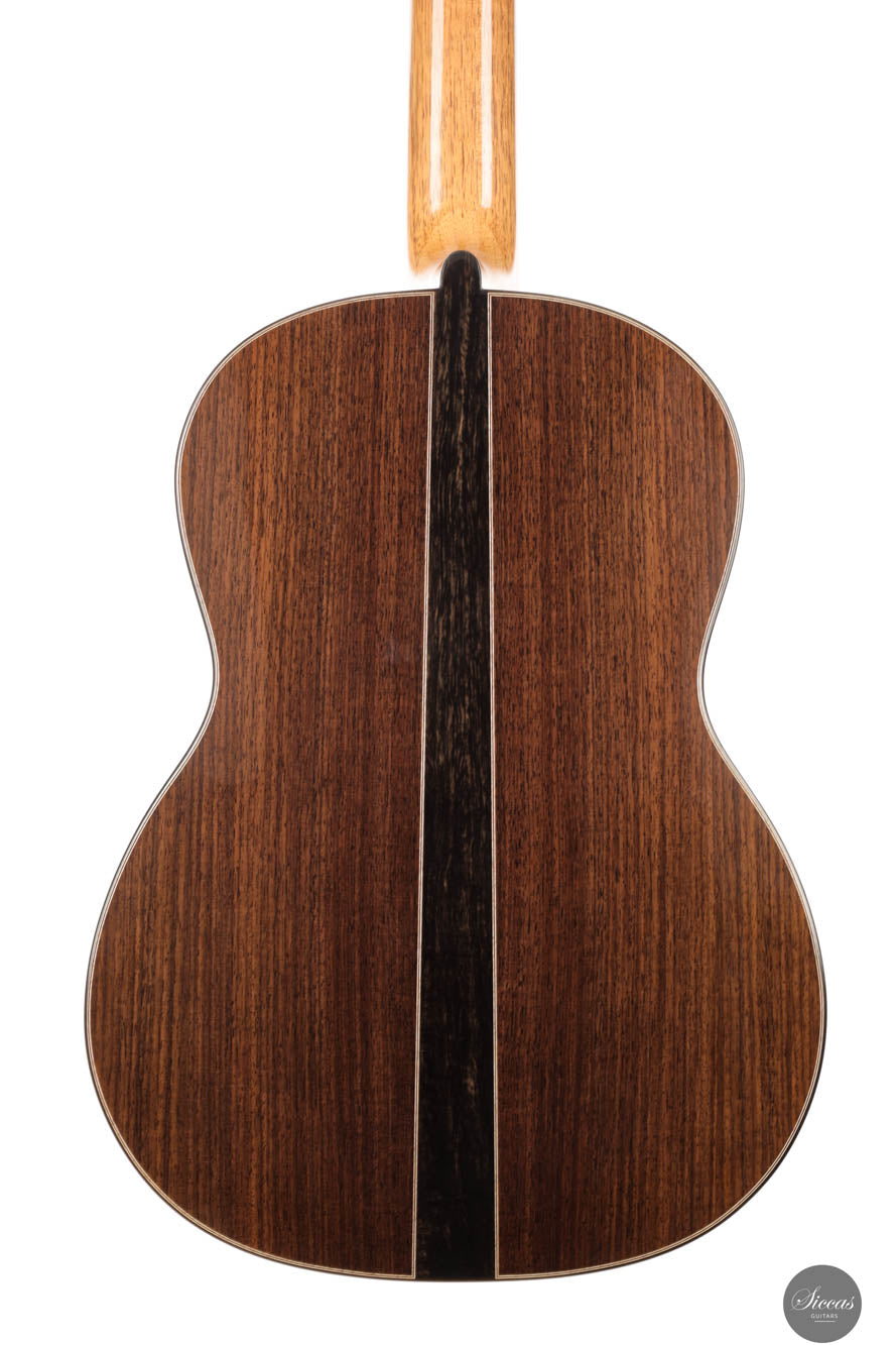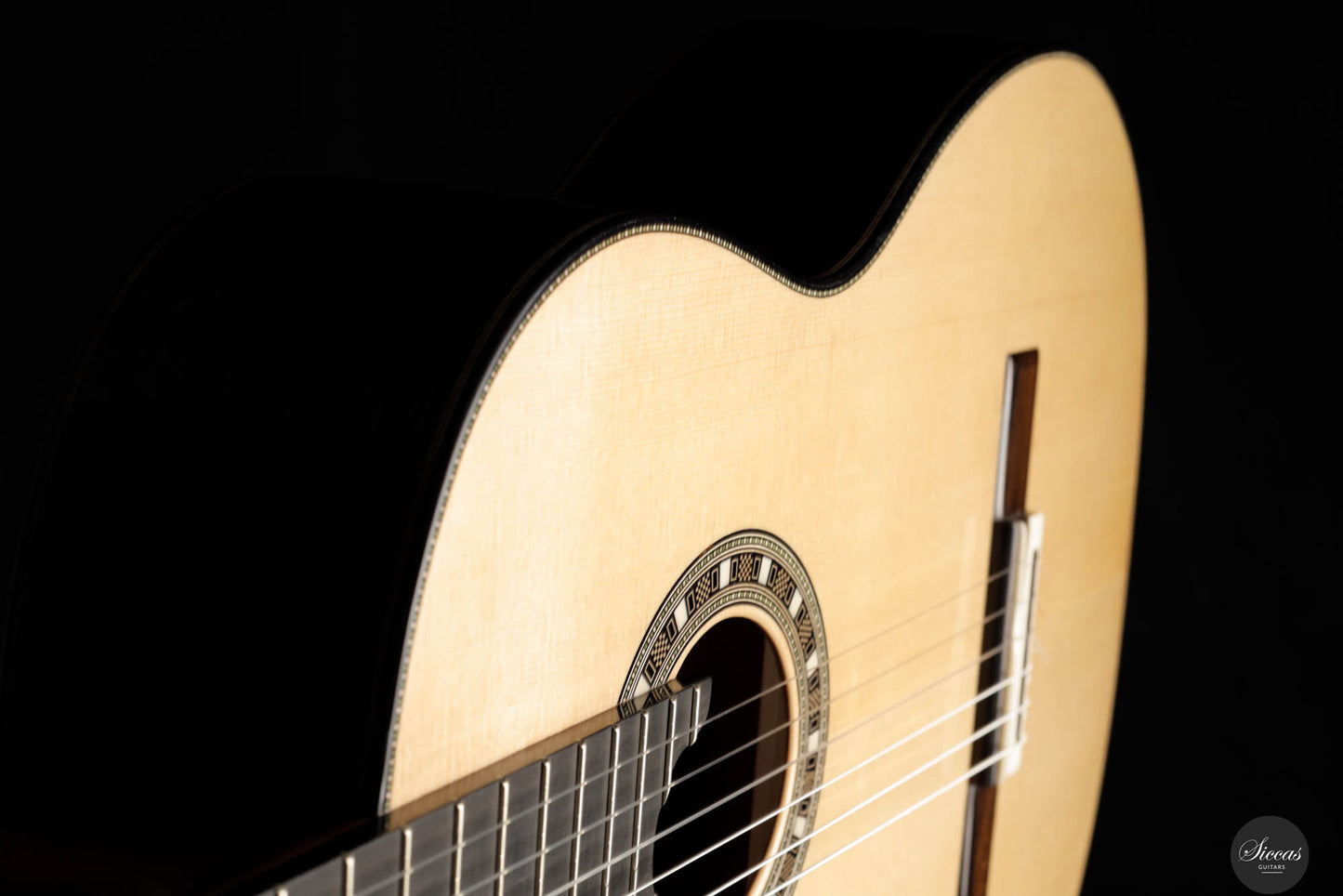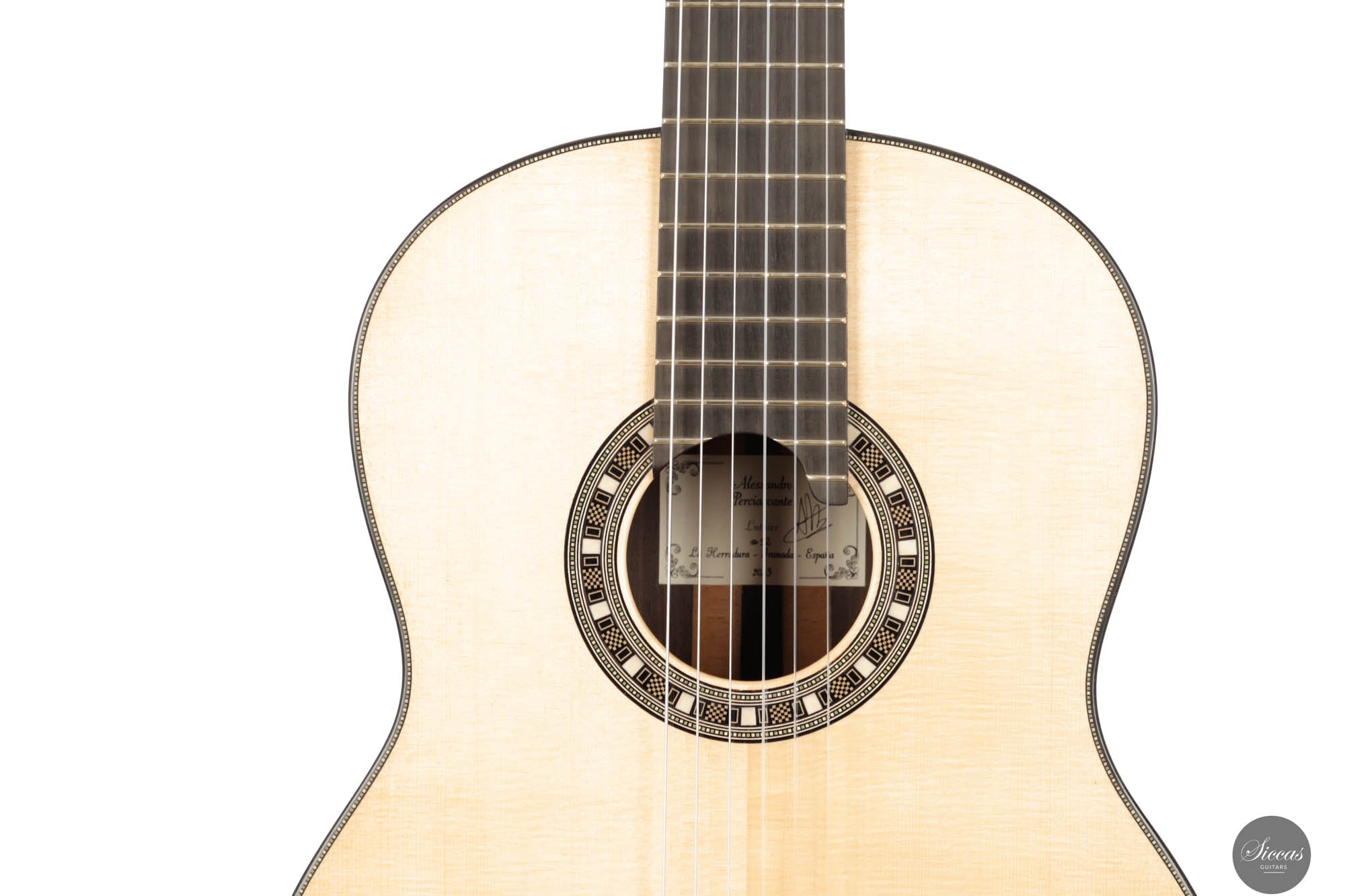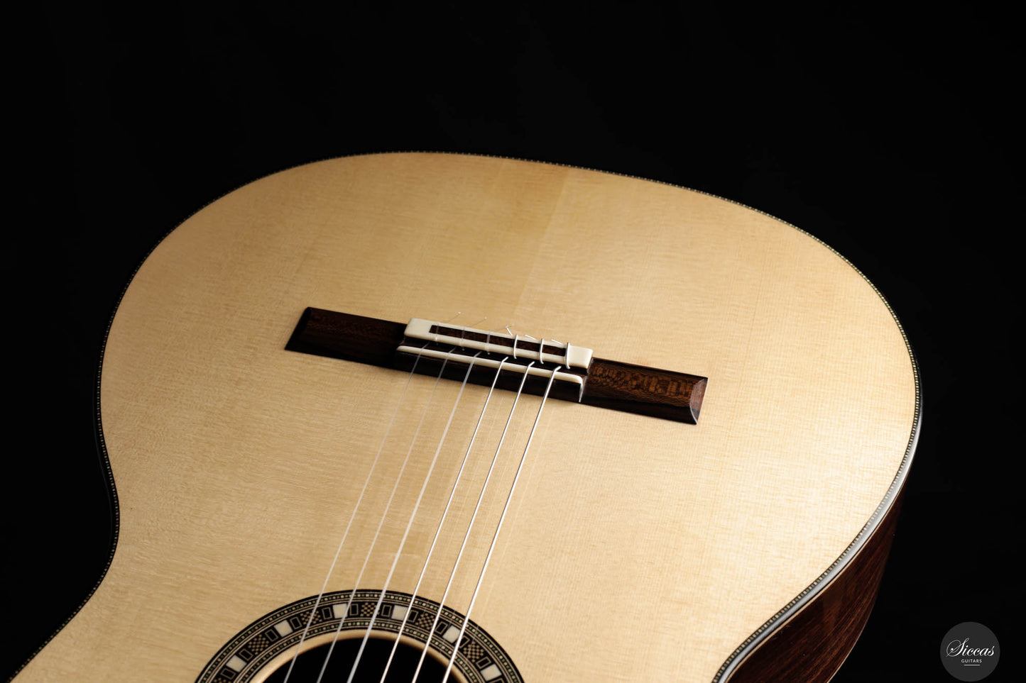 The 2023 Alessandro Perciaccante guitar epitomizes the essence of traditional Spanish guitar craftsmanship, capturing the attention of musicians with its beauty and exceptional sound quality. Meticulously crafted using high-quality materials, this guitar features a spruce soundboard paired with striking Indian rosewood for the back and sides, a combination that produces a rich, harmonically vibrant Spanish sound. The guitar's basses are particularly impressive, offering a deep and resonant quality that enriches its overall sonic depth. In contrast, the trebles are sweet and refined, providing a delightful balance to the robust basses and resulting in a beautifully harmonious sound profile.