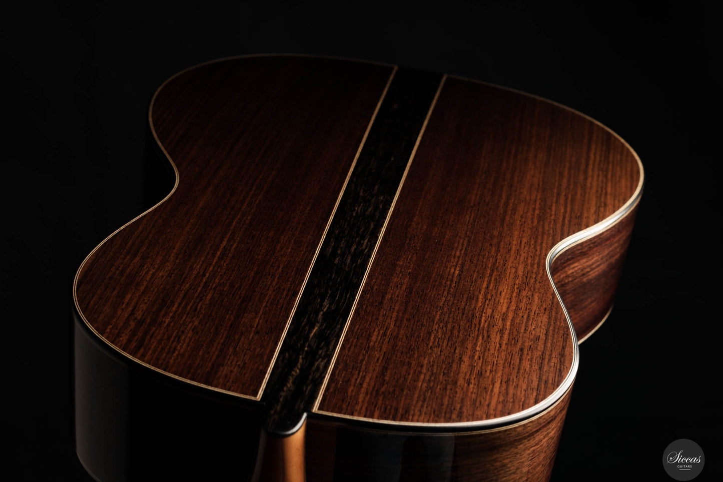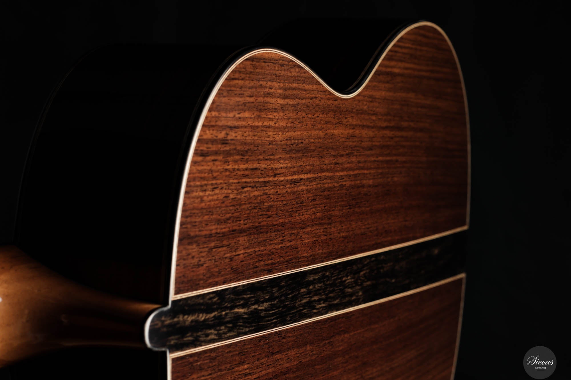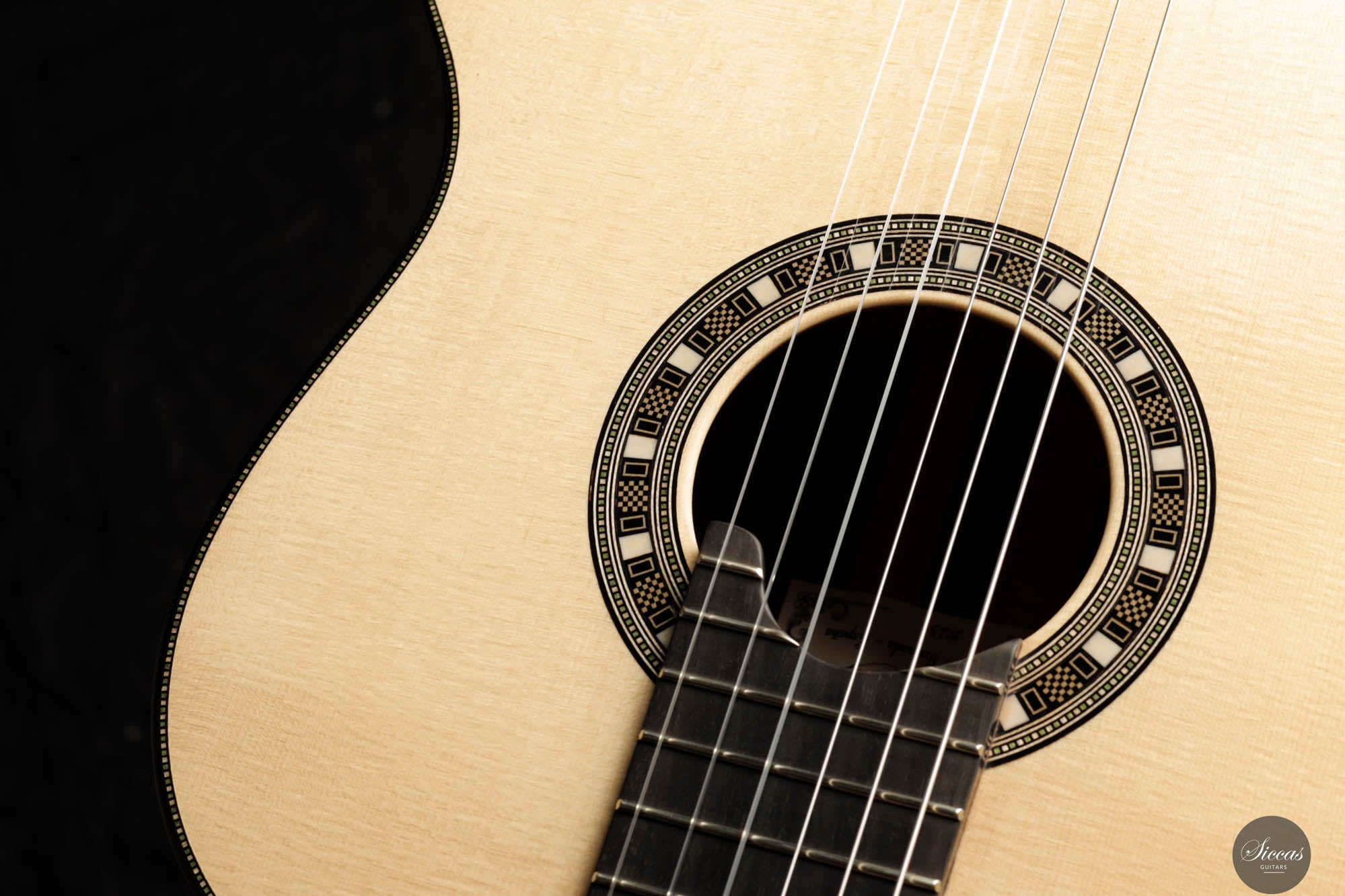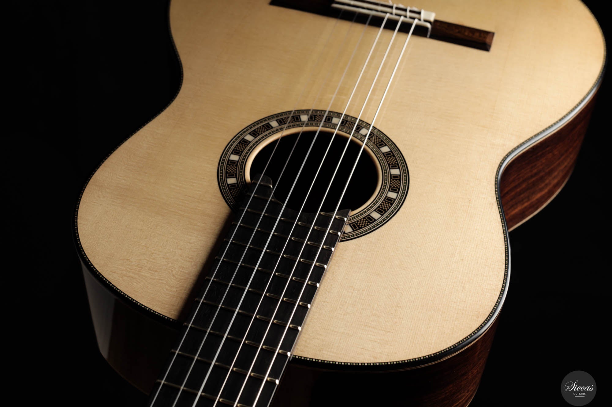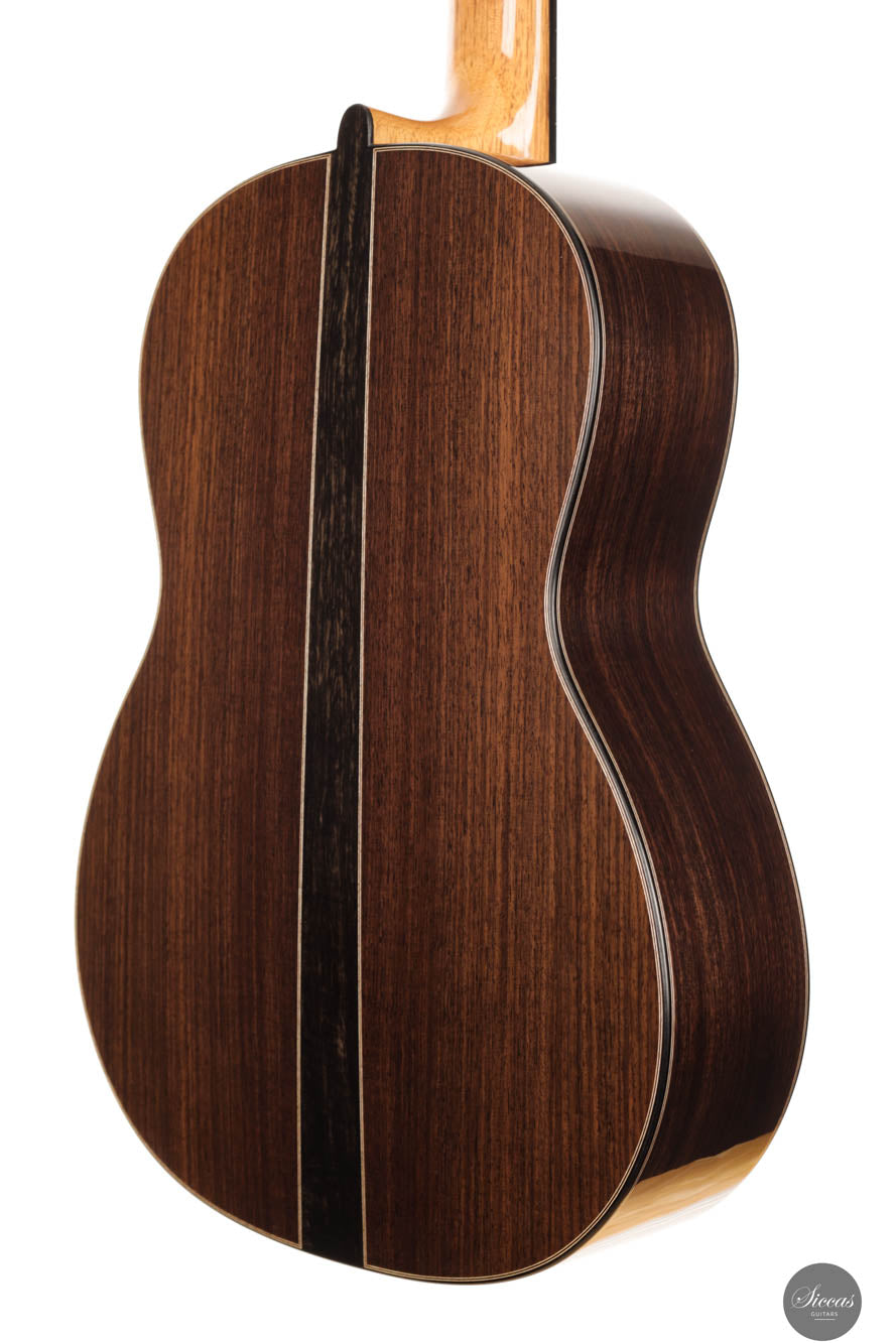 The 2023 Alessandro Perciaccante guitar epitomizes the essence of traditional Spanish guitar craftsmanship, capturing the attention of musicians with its beauty and exceptional sound quality. Meticulously crafted using high-quality materials, this guitar features a spruce soundboard paired with striking Indian rosewood for the back and sides, a combination that produces a rich, harmonically vibrant Spanish sound. The guitar's basses are particularly impressive, offering a deep and resonant quality that enriches its overall sonic depth. In contrast, the trebles are sweet and refined, providing a delightful balance to the robust basses and resulting in a beautifully harmonious sound profile.