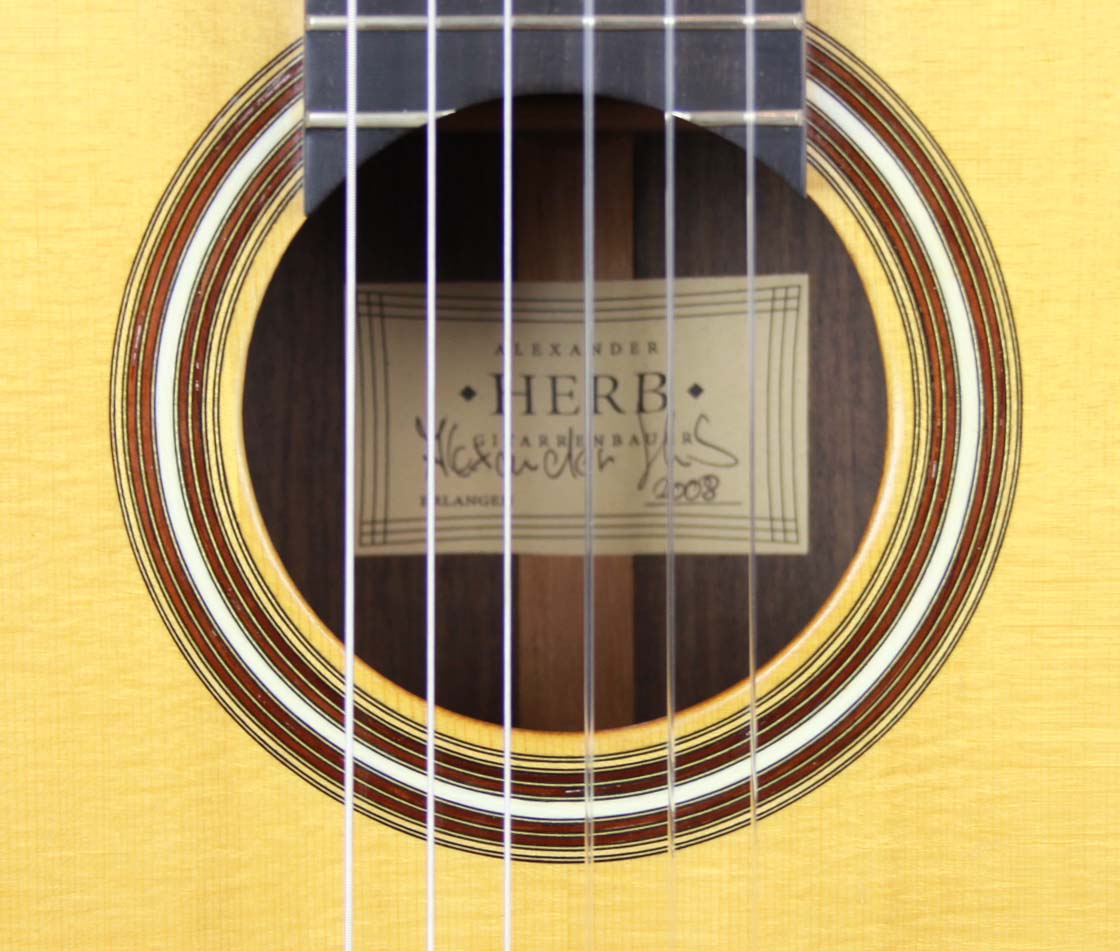 The Herb workshop was founded in 1972 in Erlangen, Germany by Hans Hermann Herb. His son started to work in 2001 as a junior partner after his diploma (Meisterprüfung). Alexander Herb started his apprenticeship at his father's workshop in 1989. This Premium Concert Edition guitar has a AAA spruce top and AAA Indian rosewood back and sides (laminated with maple). The fretboard is elevated and curved which improves playability and gives the player a more direct feeling. The bridge (Indian rosewood) with its 12-hole-drilling fits perfectly into the overall picture of the guitar. The tuning machines are made by Fustero. Comes with a hard case.