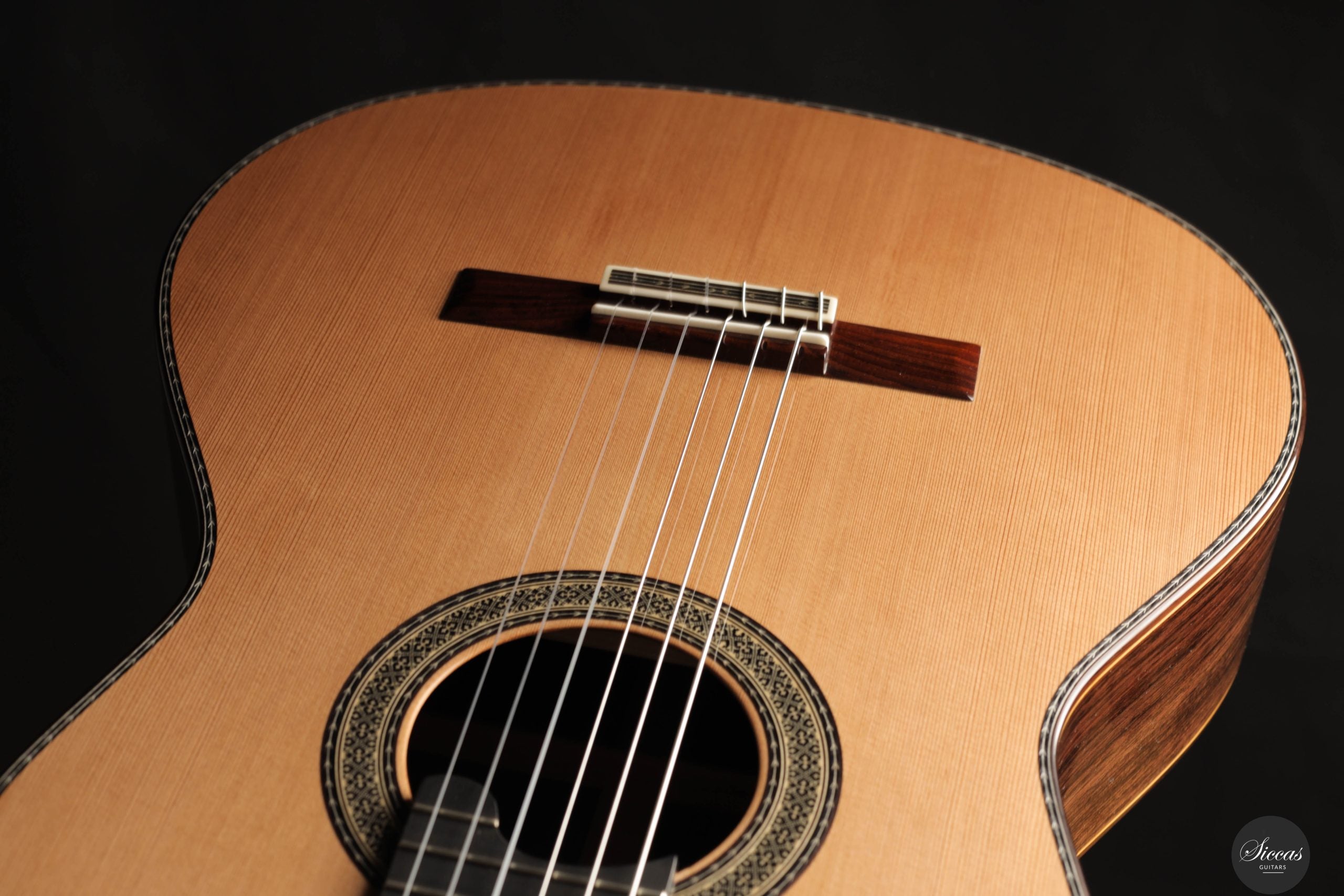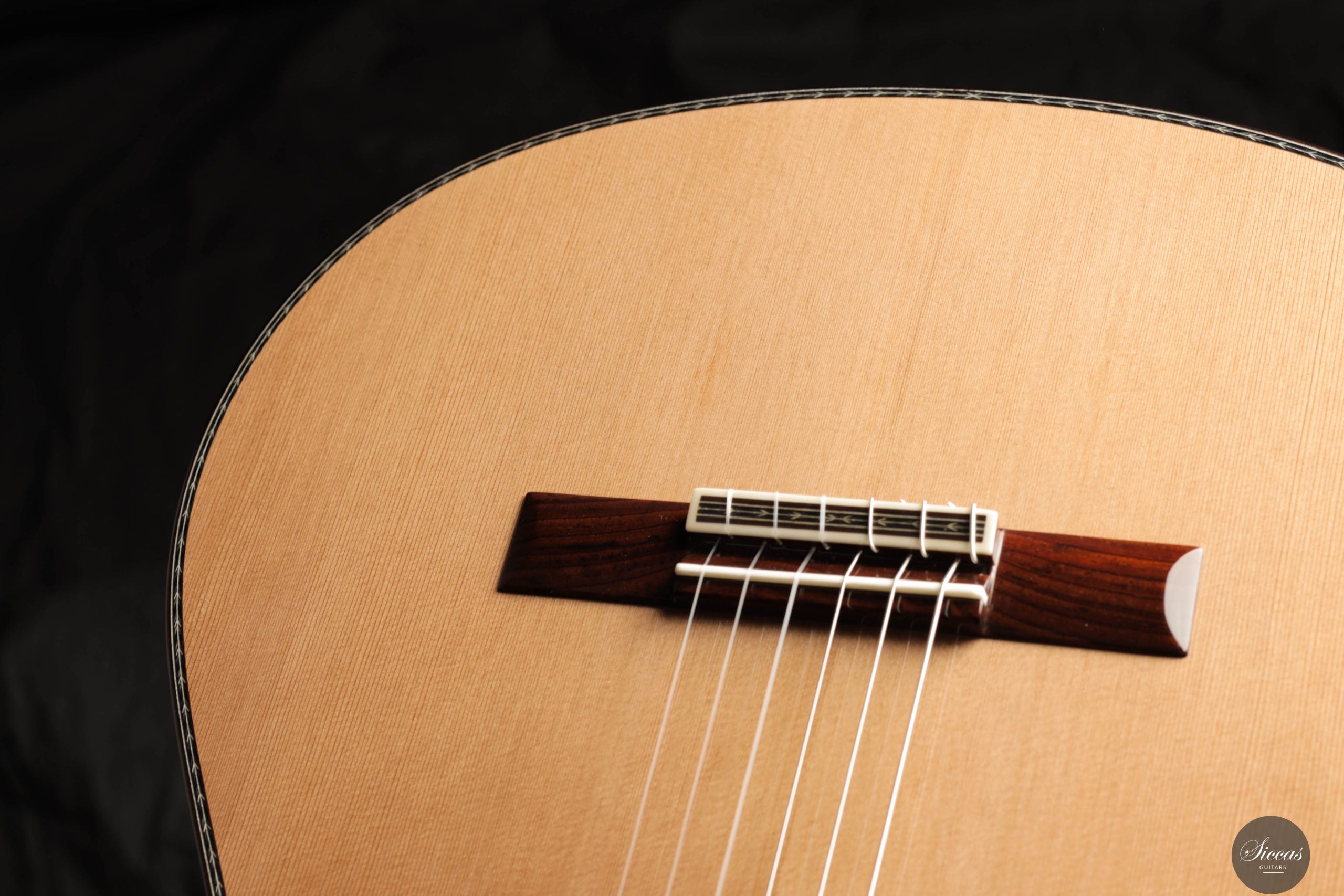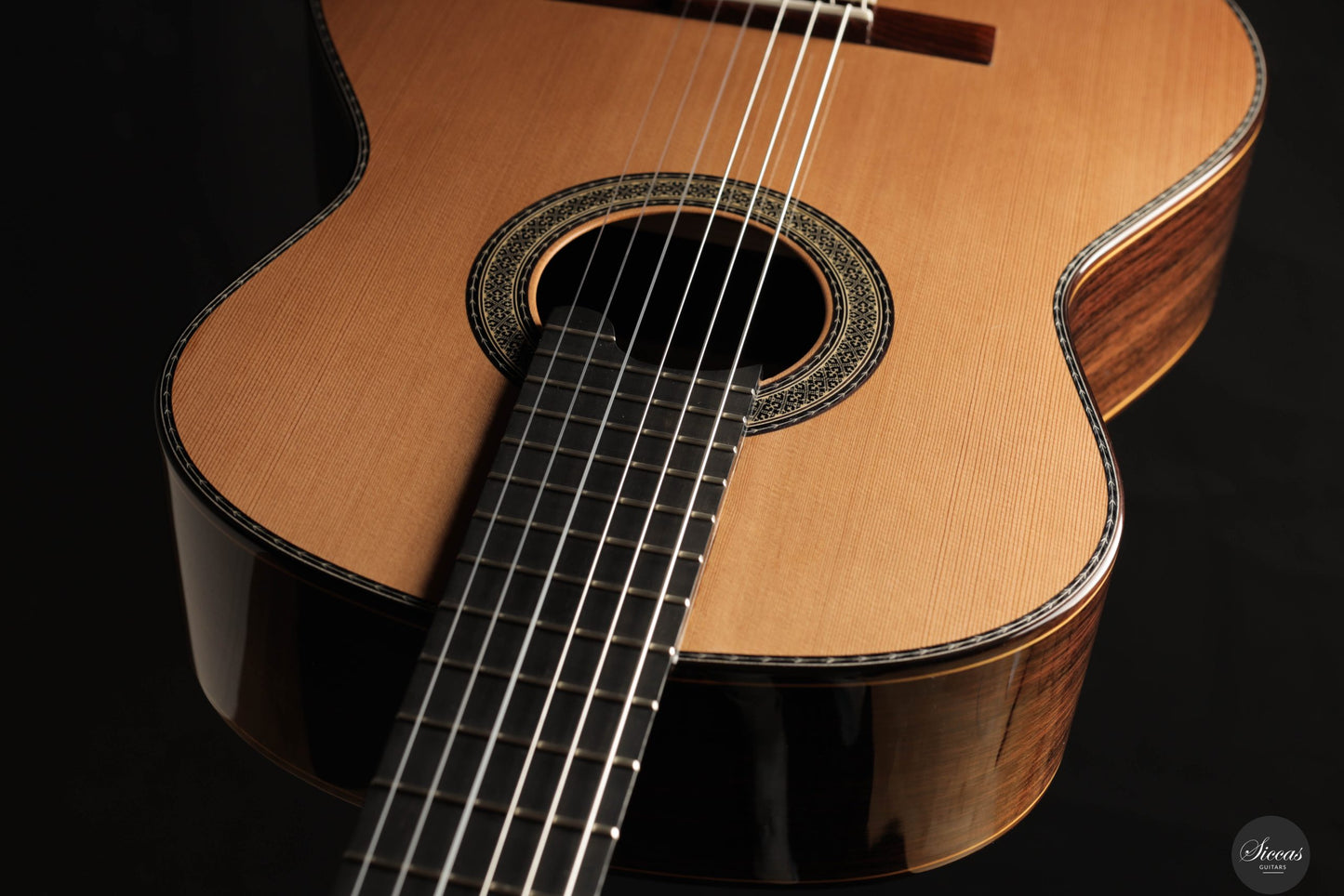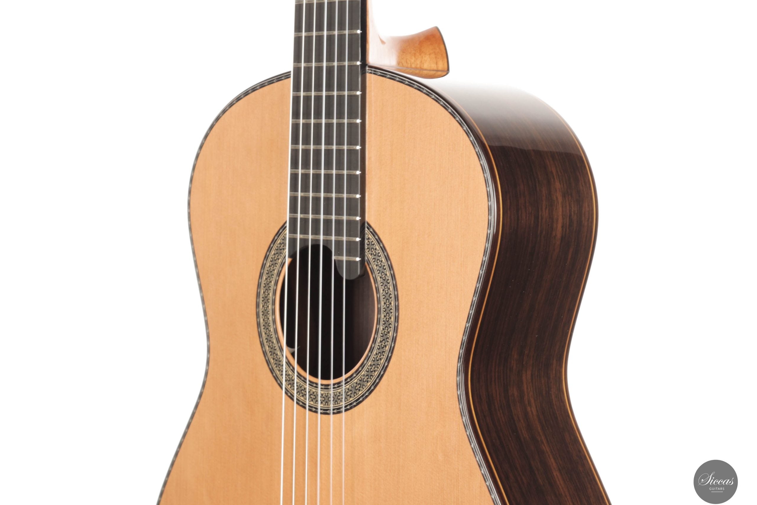 This 2025 Deseada, numbered 240-22, is a special edition built exclusively for Siccas Guitars. It is distinguished by a custom rosette designed specifically for this series, adding a unique visual identity to an already celebrated model. Crafted using traditional Spanish construction techniques, it features a cedar top paired with Indian rosewood back and sides, offering a warm, rich tonal character with clear projection and excellent balance across the registers.