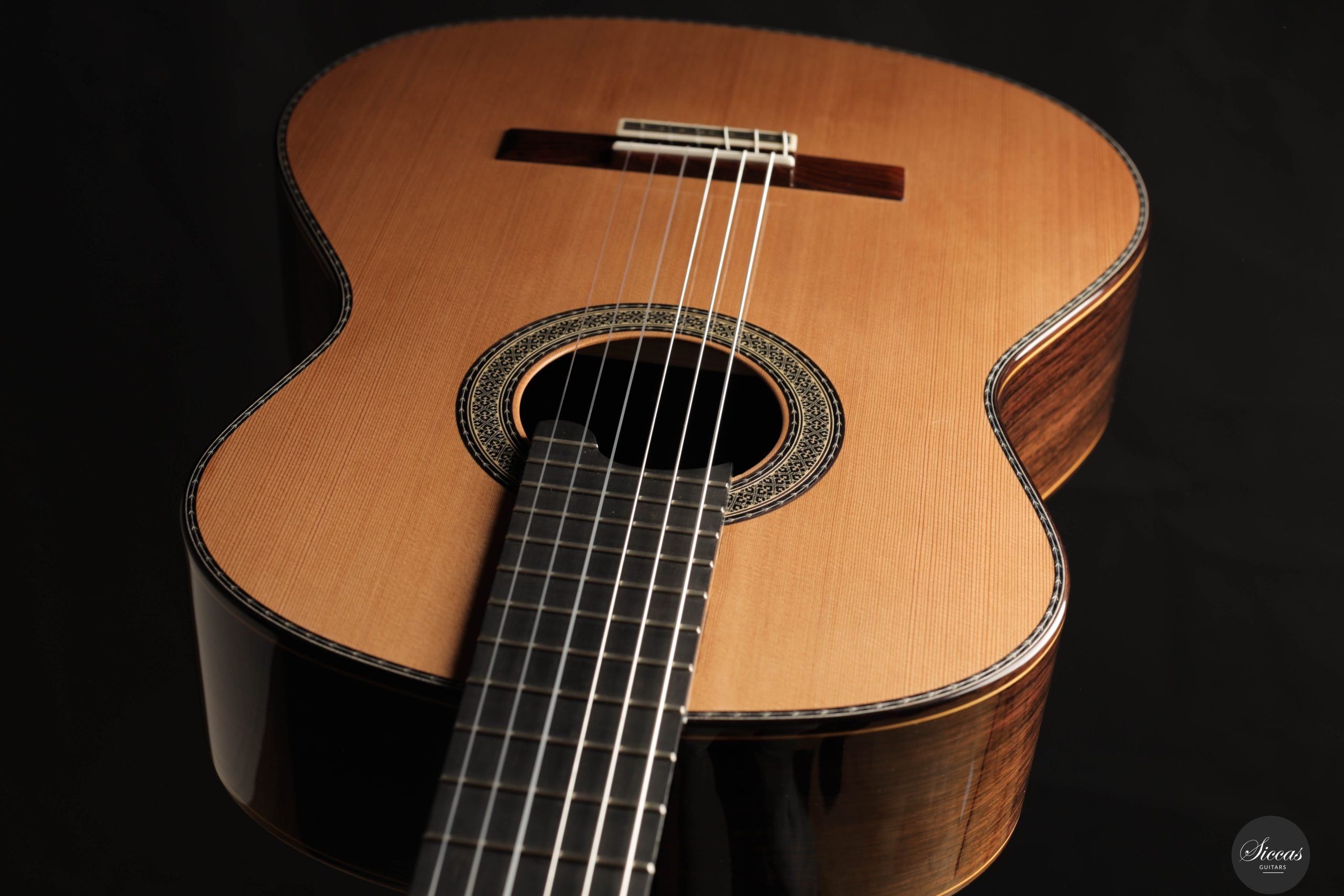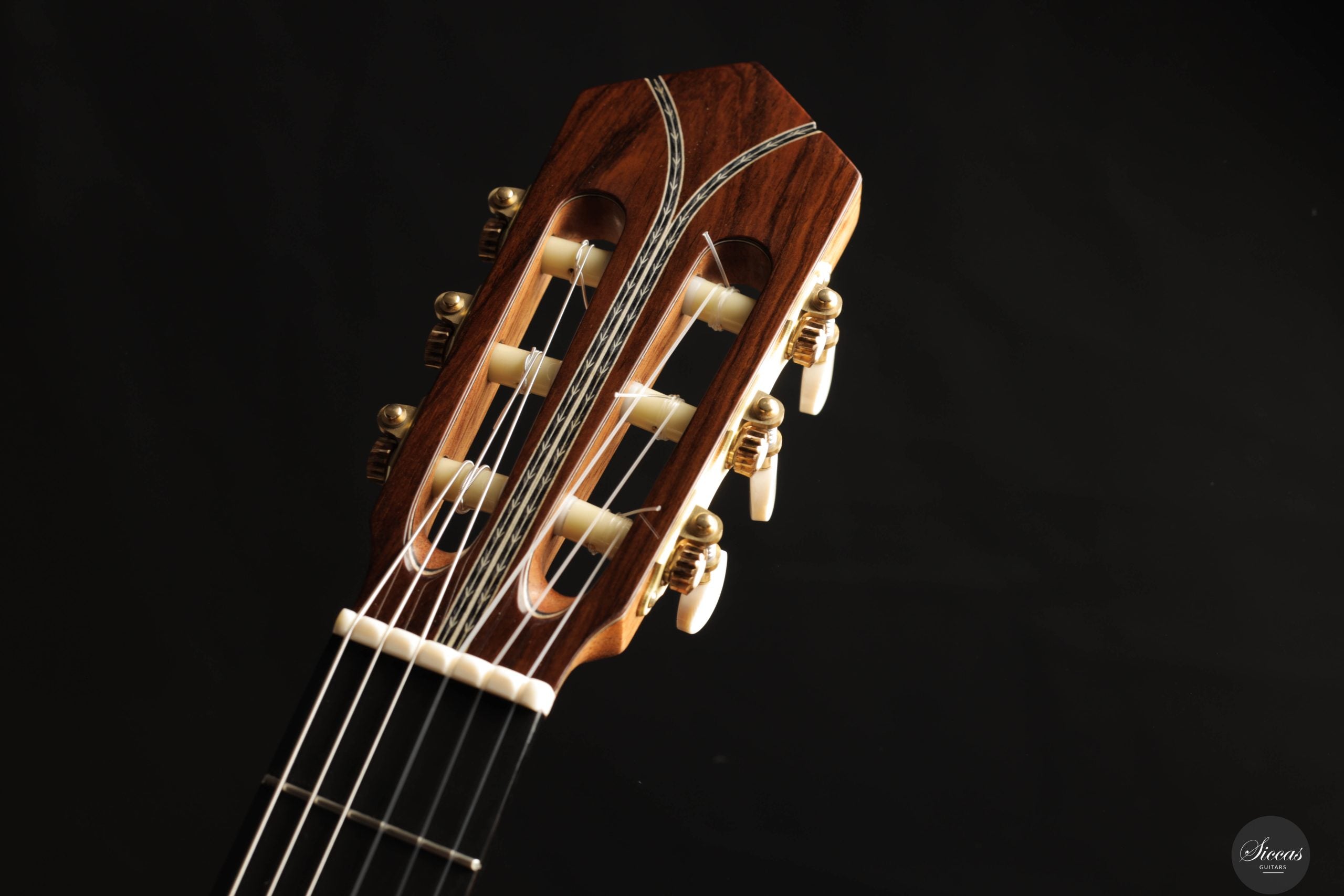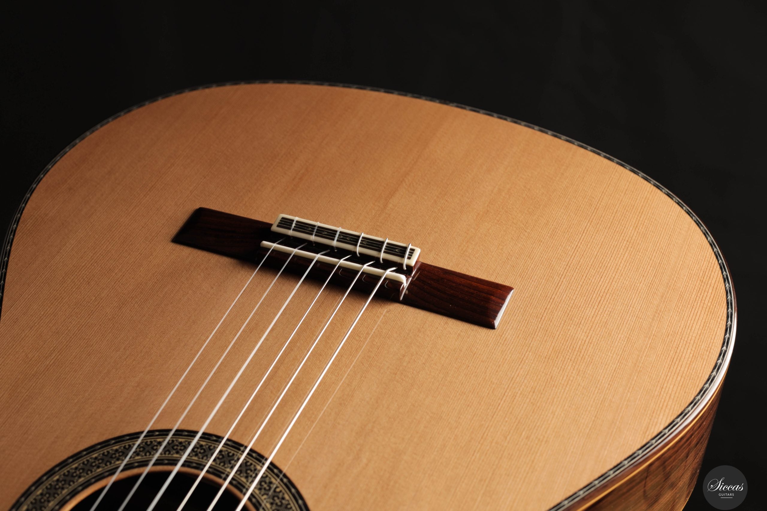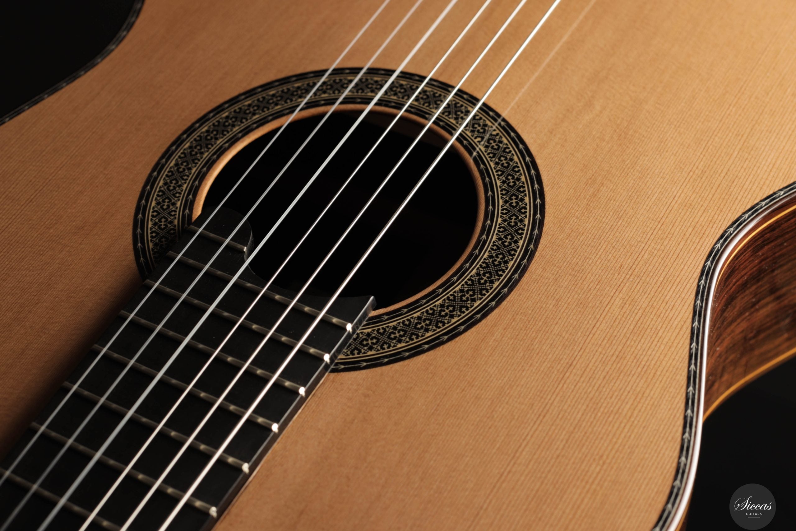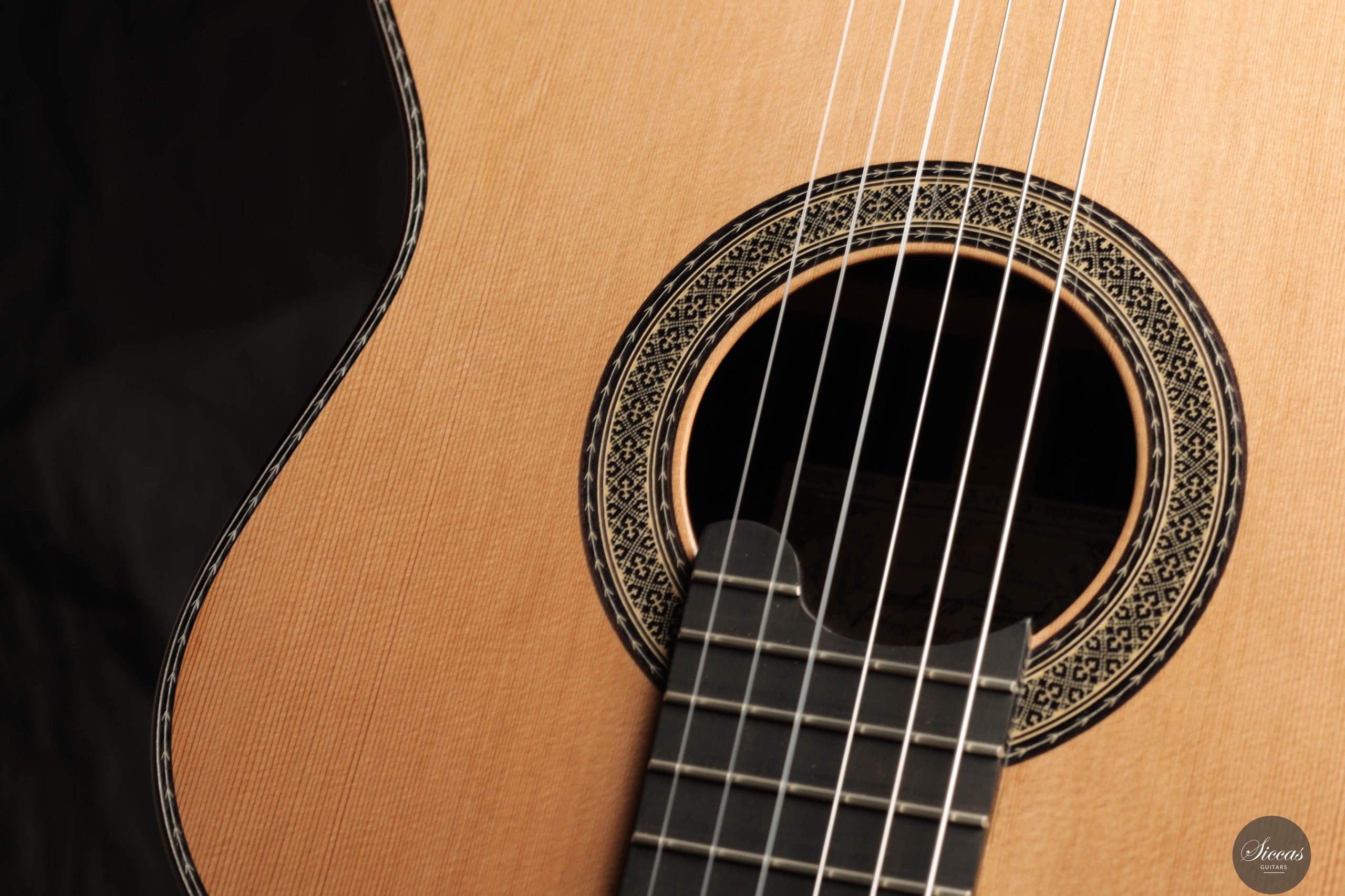 This 2025 Deseada, numbered 240-22, is a special edition built exclusively for Siccas Guitars. It is distinguished by a custom rosette designed specifically for this series, adding a unique visual identity to an already celebrated model. Crafted using traditional Spanish construction techniques, it features a cedar top paired with Indian rosewood back and sides, offering a warm, rich tonal character with clear projection and excellent balance across the registers.