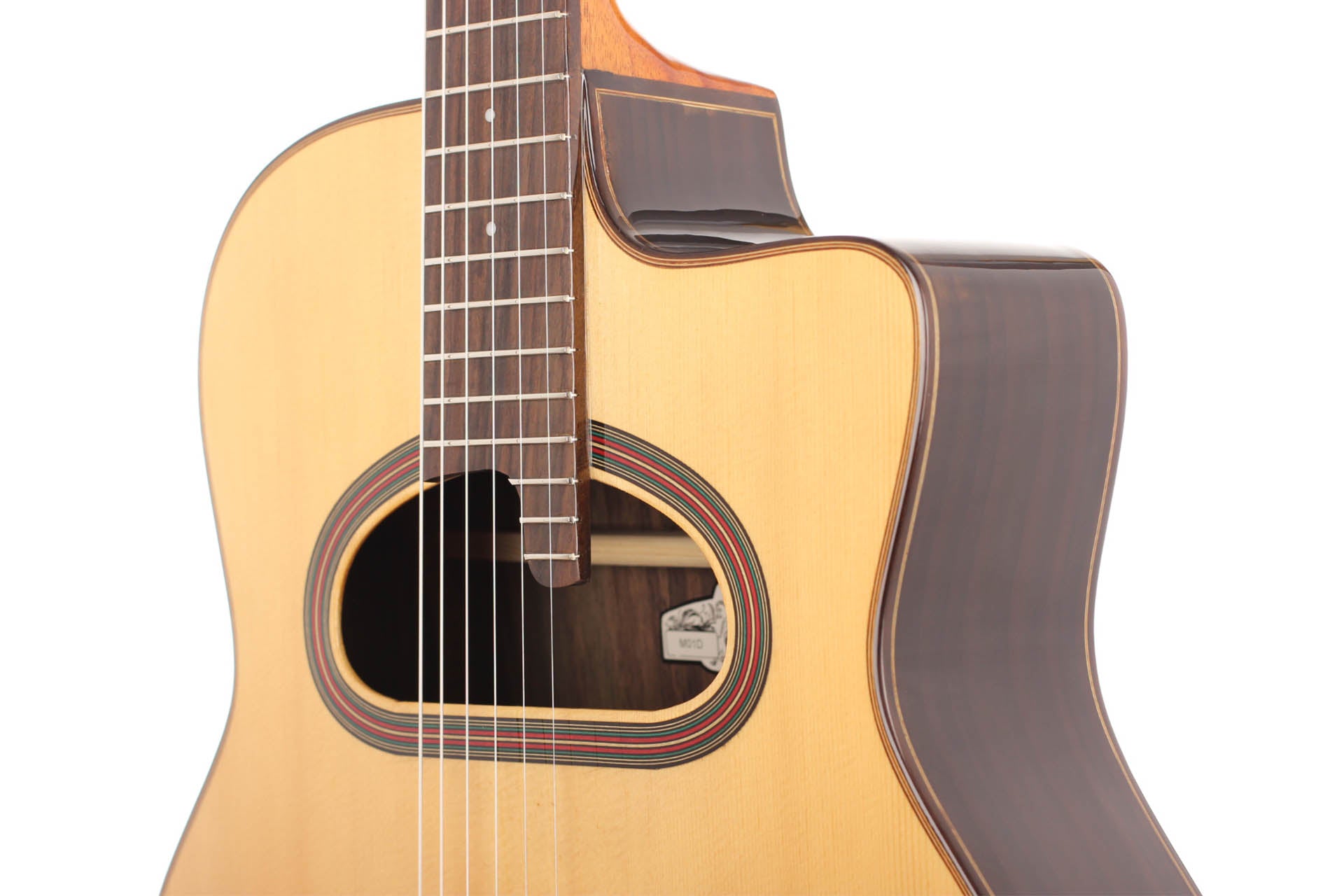 The Selmer-Style guitars by Altamira are fine instruments with an authentic sound and a great value for money. Due to their modern C-Shape neck they are also very comfortable to play. This Altamira M01D Maccaferri style gypsy jazz guitar has a d-sound-hole and a high gloss finish. Quite traditional in sound with a rich and hearty tone. Only the best woods were chosen to make this guitar: Finest German Spruce and very fine laminated Indian rosewood for back and sides.