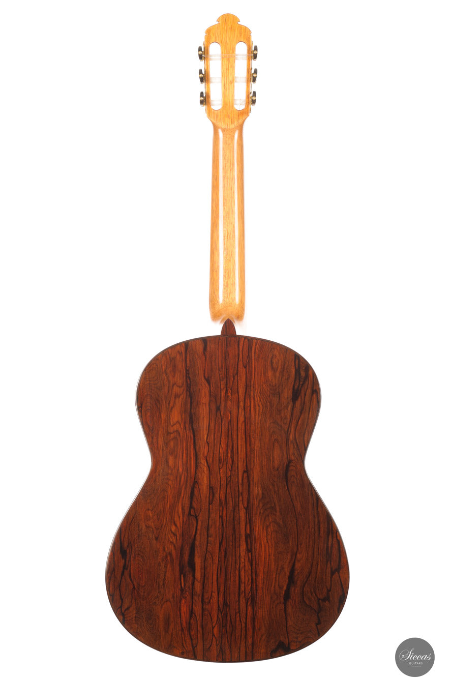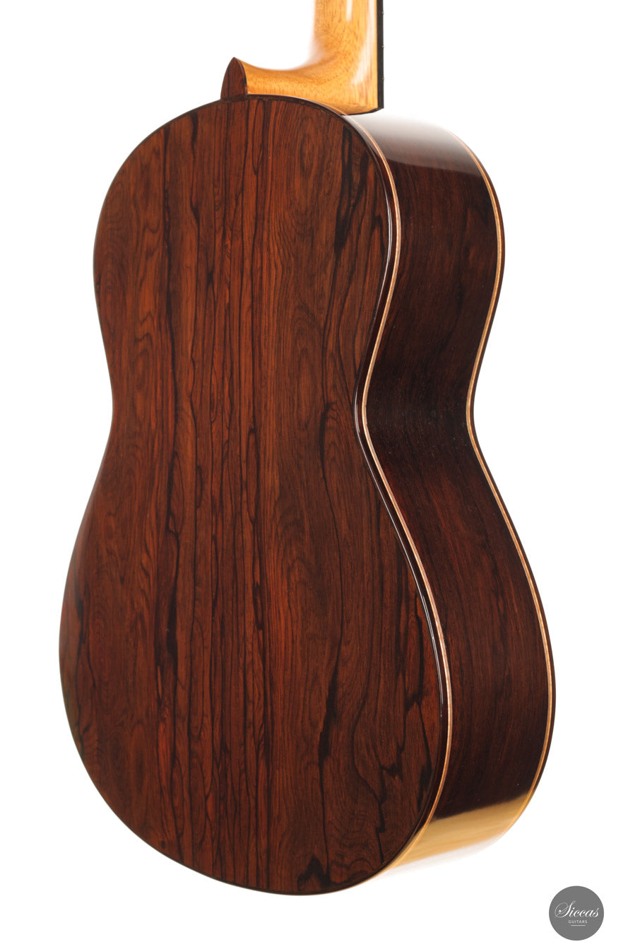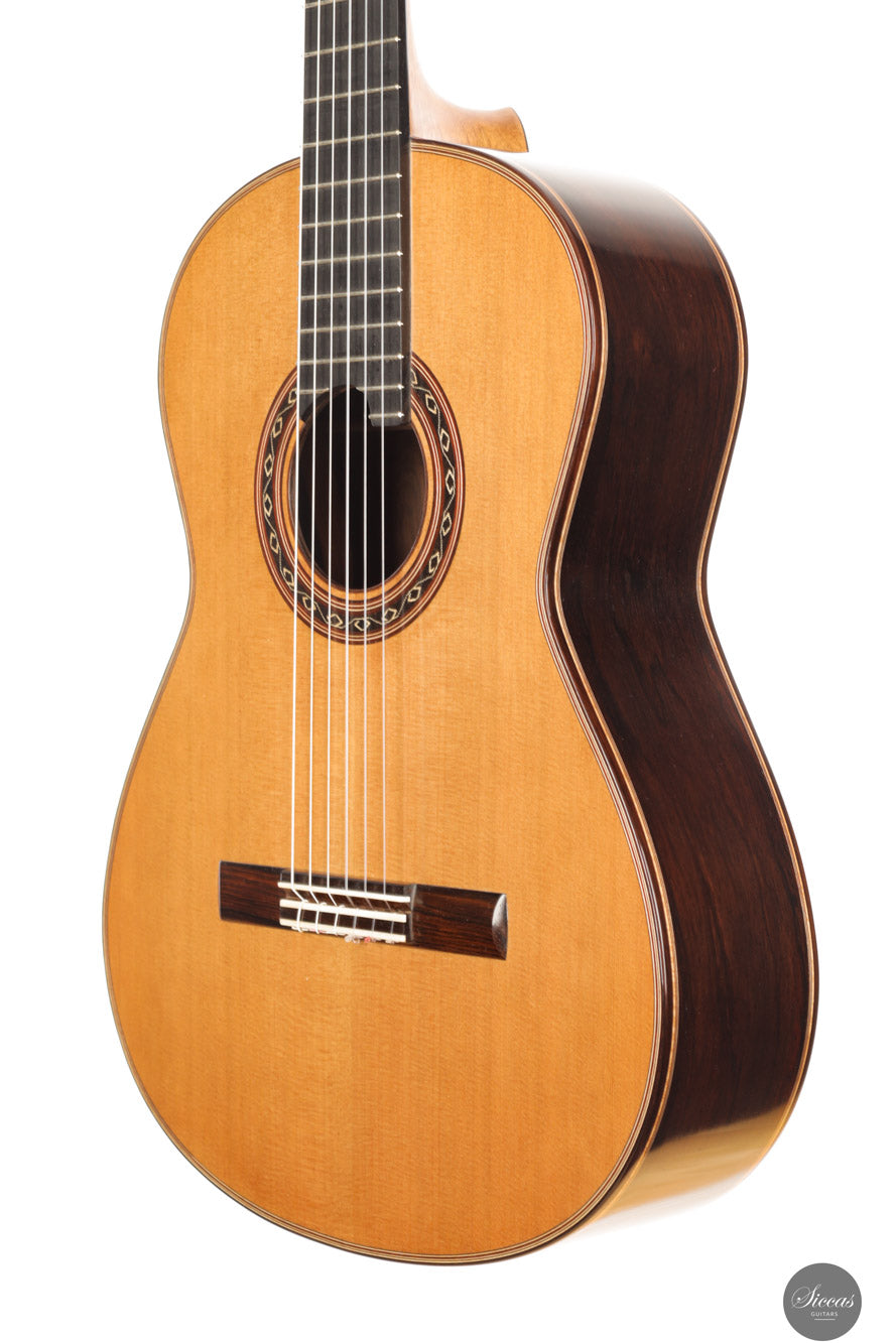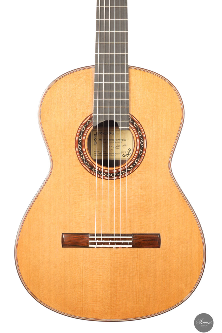 The 2025 Ana Espinosa guitar reflects the refined tradition of the Granada school, crafted with a cedar top for warmth and roundness of tone and cocobolo back and sides that add projection and depth. Its sound combines focused basses with a clear, lyrical midrange, achieving excellent balance and responsiveness across all registers. Built in the traditional Spanish style and finished with French polish, it showcases elegant craftsmanship aimed at the professional stage. With a 640 mm scale length, this instrument offers enhanced comfort while preserving clarity, power and tonal presence for expressive performance.