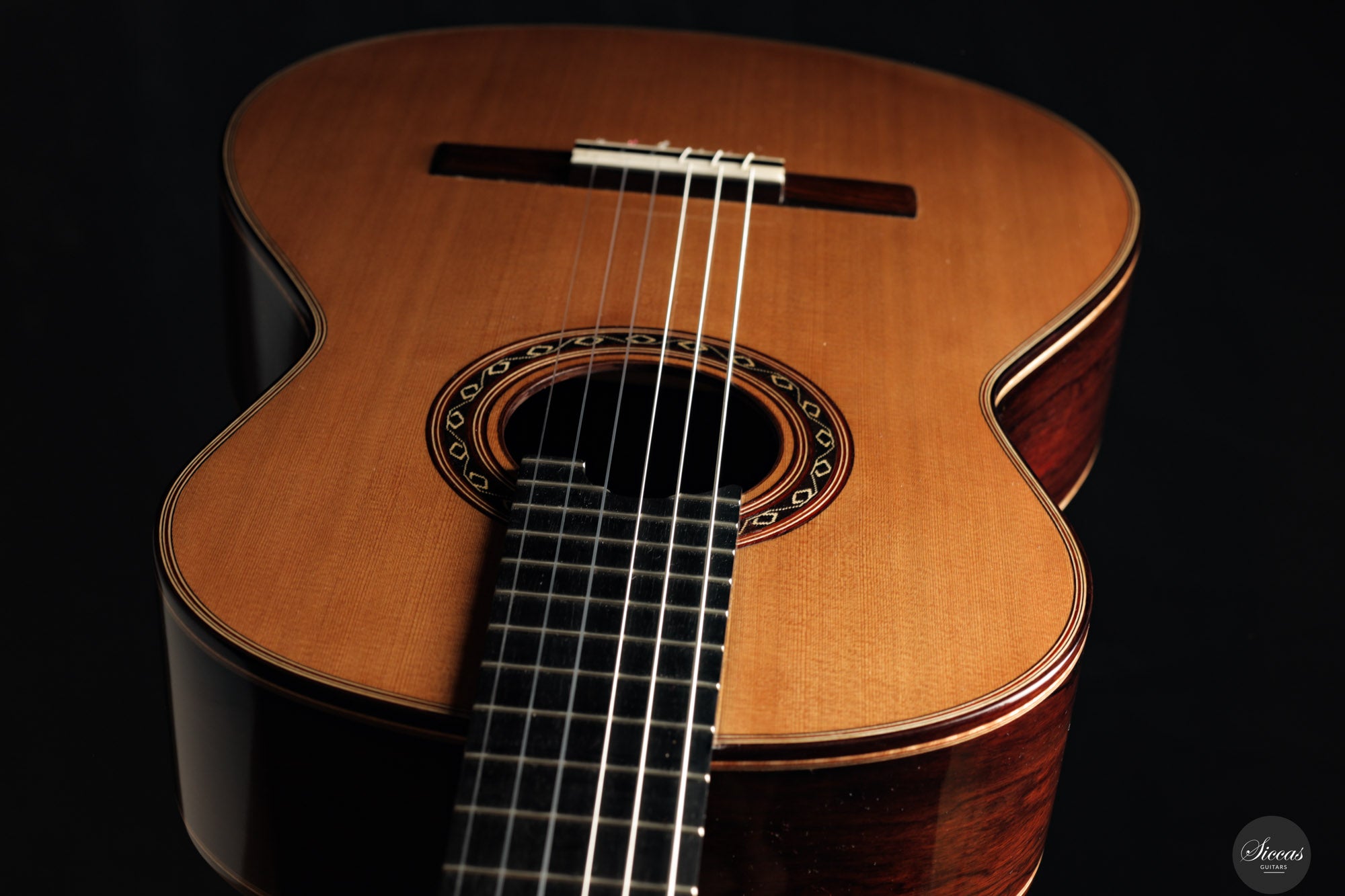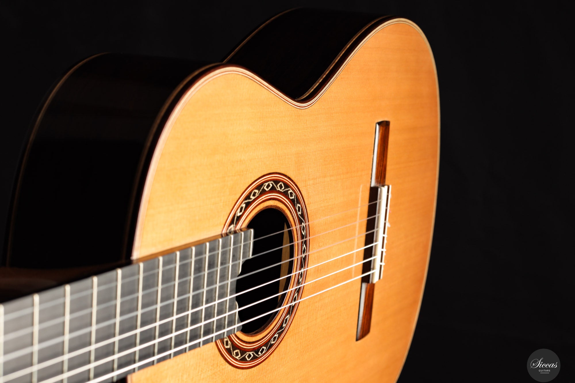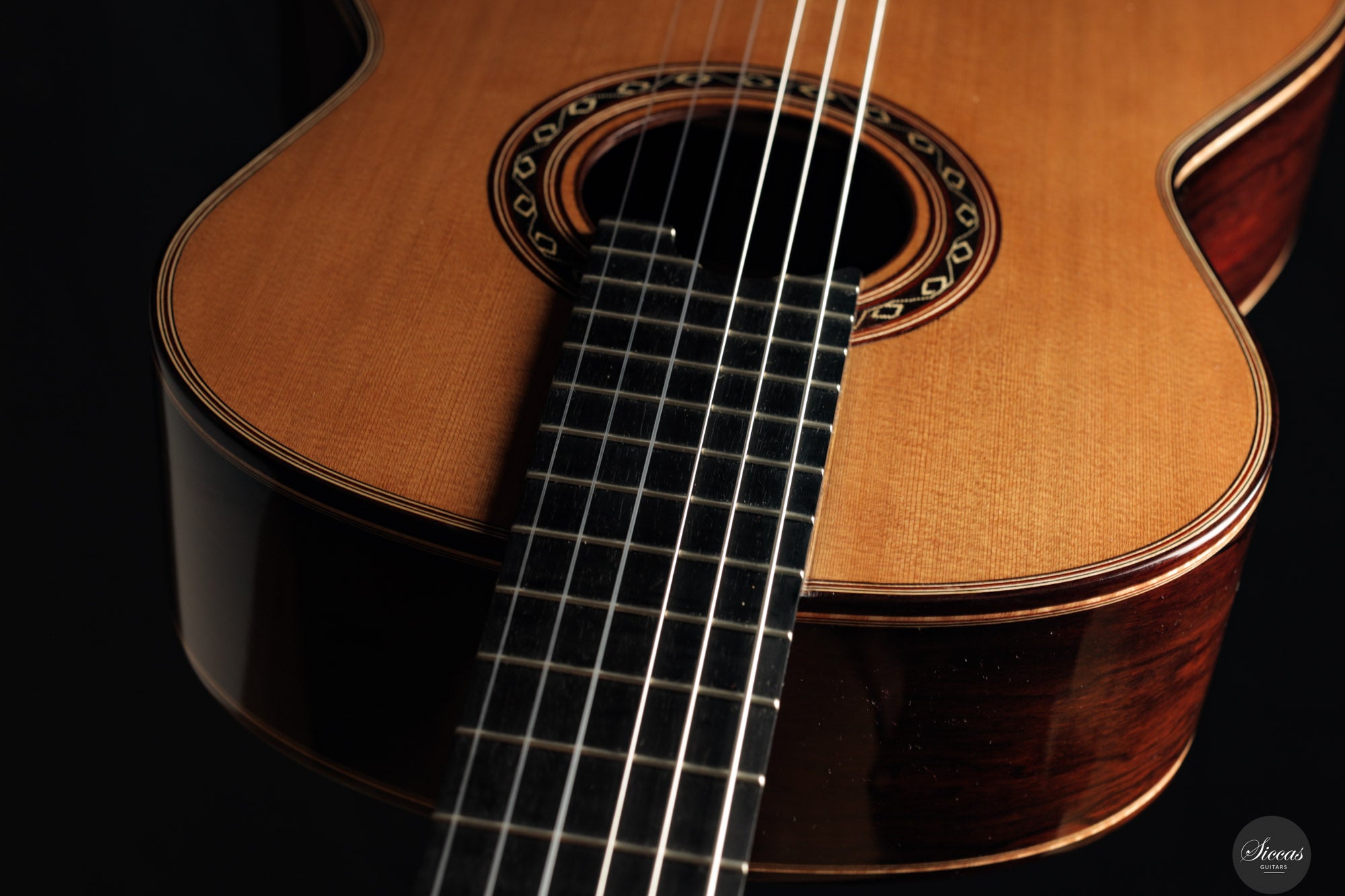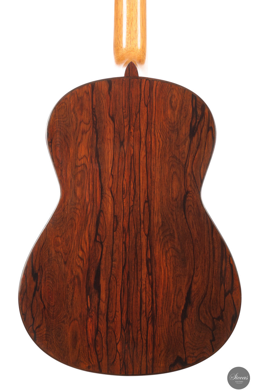 The 2025 Ana Espinosa guitar reflects the refined tradition of the Granada school, crafted with a cedar top for warmth and roundness of tone and cocobolo back and sides that add projection and depth. Its sound combines focused basses with a clear, lyrical midrange, achieving excellent balance and responsiveness across all registers. Built in the traditional Spanish style and finished with French polish, it showcases elegant craftsmanship aimed at the professional stage. With a 640 mm scale length, this instrument offers enhanced comfort while preserving clarity, power and tonal presence for expressive performance.