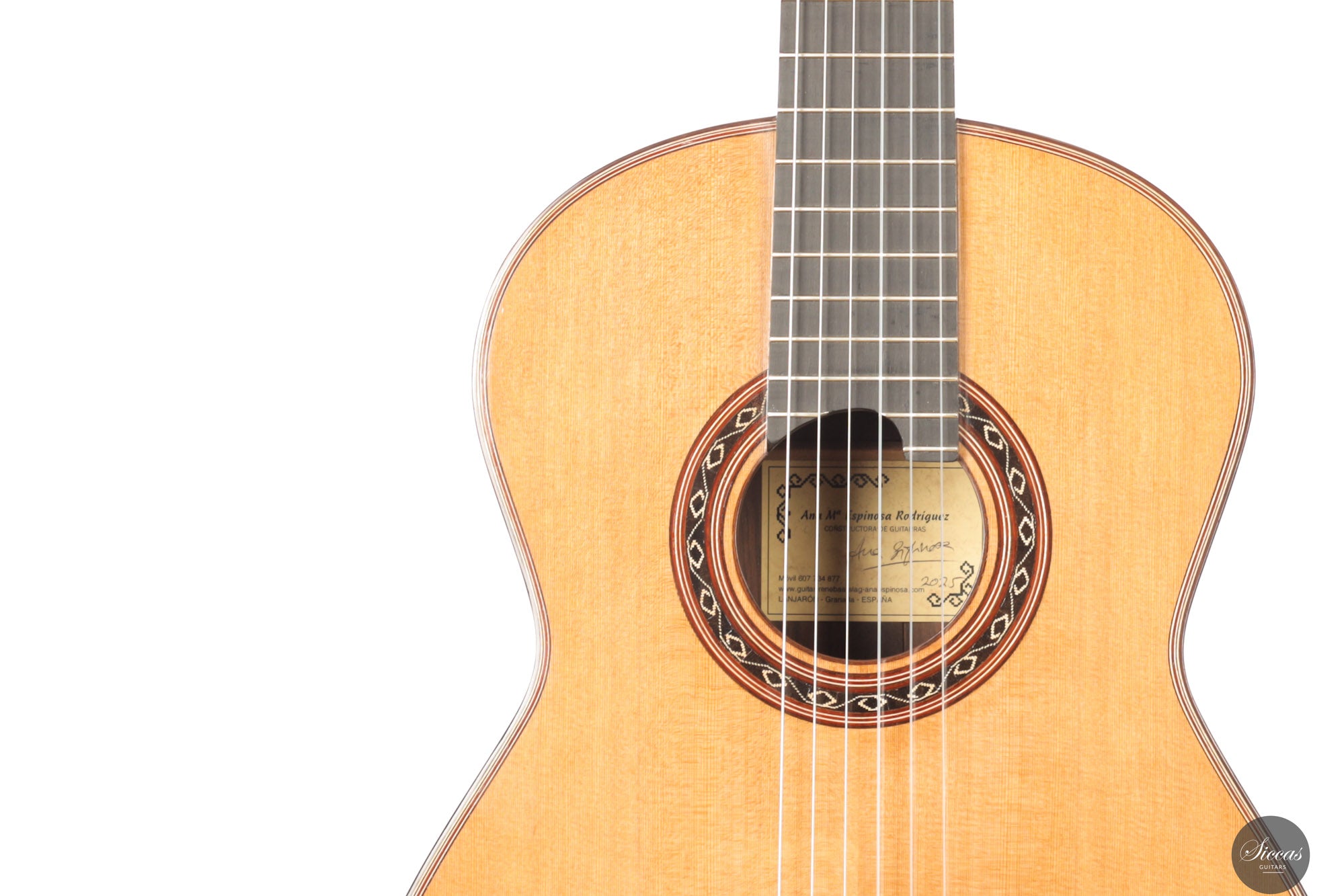 Ana Maria Espinosa Rodríguez began her guitarmaking career in 1996 under the mentorship of René Baarslag. Her initial focus on the Antonio de Torres model led her to conduct extensive physical and acoustic analyses, forming the foundation for a personal model that reflects both her research and Baarslag’s deep expertise. Espinosa Rodríguez’s guitars are known for their expressive tonal qualities and graceful aesthetics, consistently featuring high power and strong projection. These attributes contribute to a responsive instrument that supports effortless and nuanced performances. Each guitar is marked by her distinctive headstock and rosette design, built from carefully selected woods and finished to the highest standard.