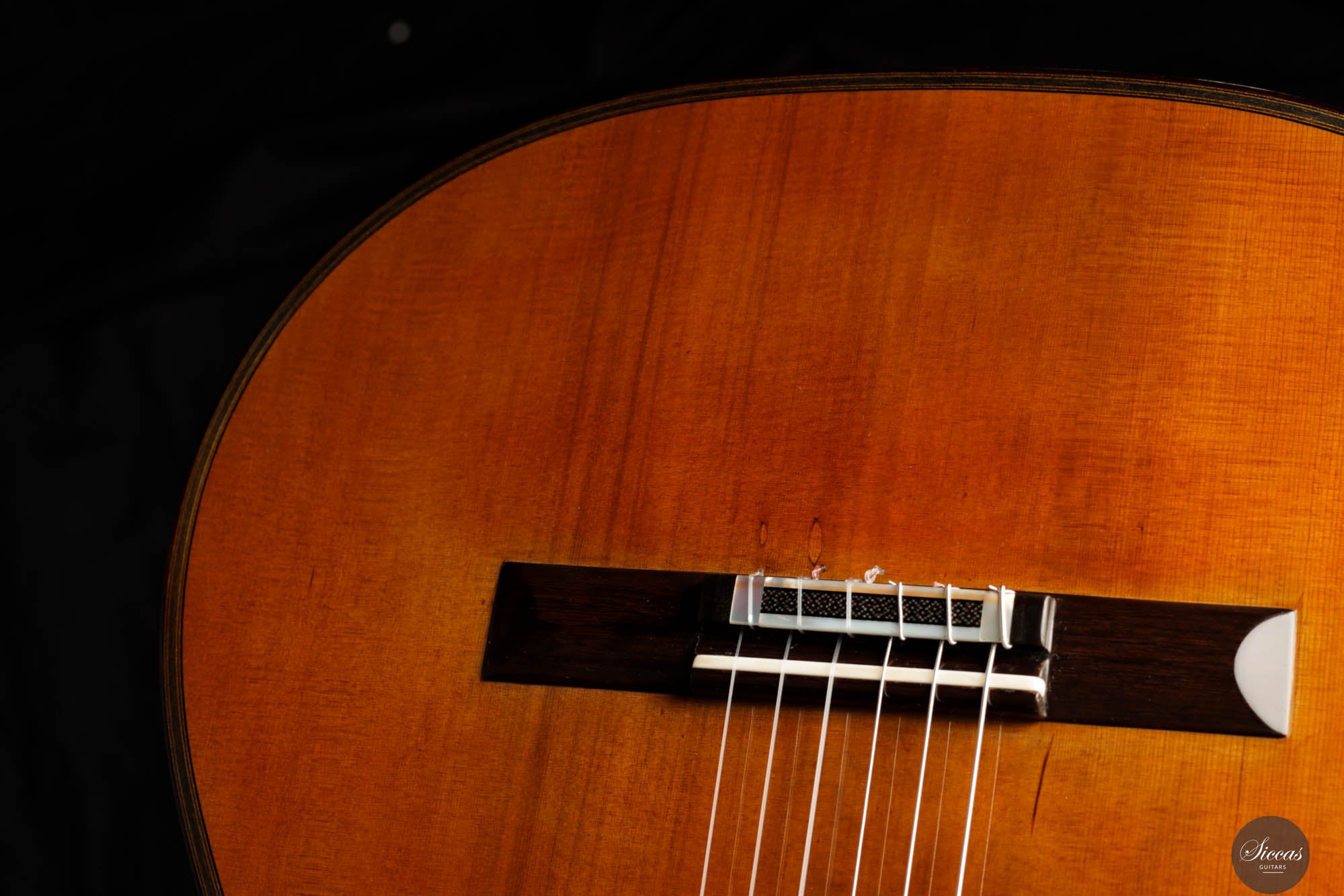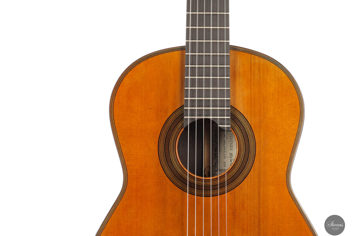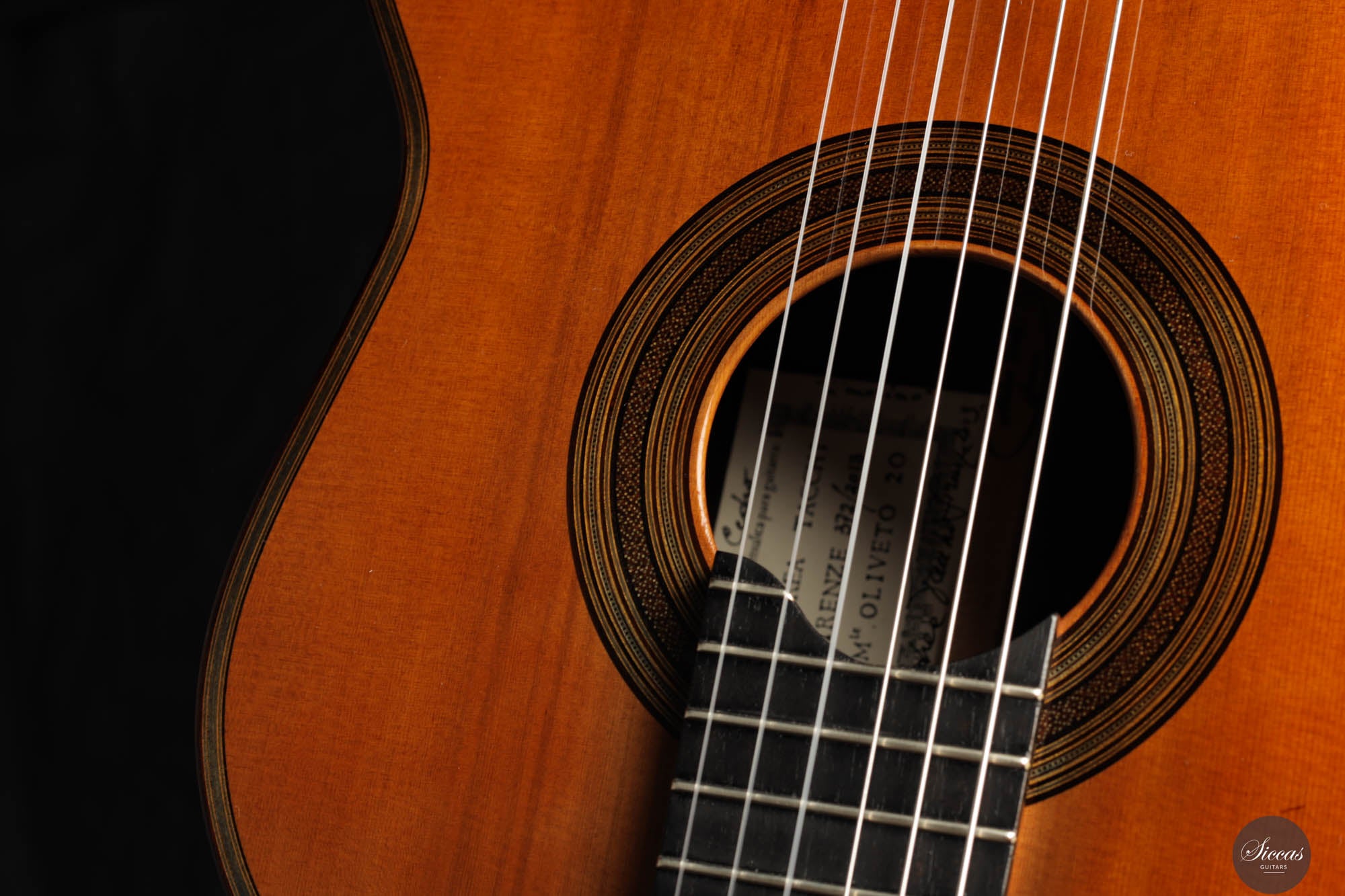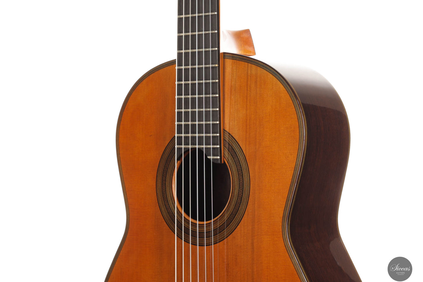 The tone of the Tacchi Coclea guitar is exceptionally rich and mature, characterized by a warm, romantic quality that is both singing and captivating. Despite being a preloved instrument, the guitar is in very good condition, exhibiting only minor signs of use. The soundboard has been repolished to bring out the beautiful grain of the cedar top, and a small hairline crack, located next to the lower bout, on the right side, has been professionally repaired to avoid any problems in the future.