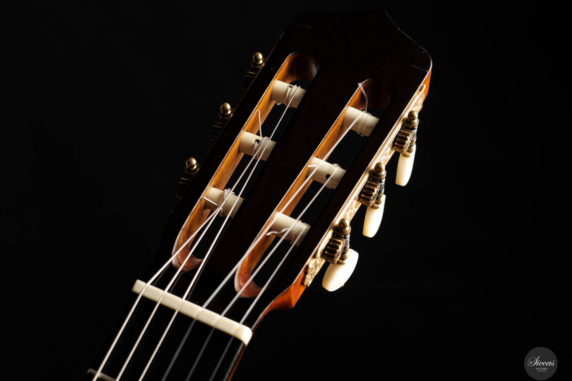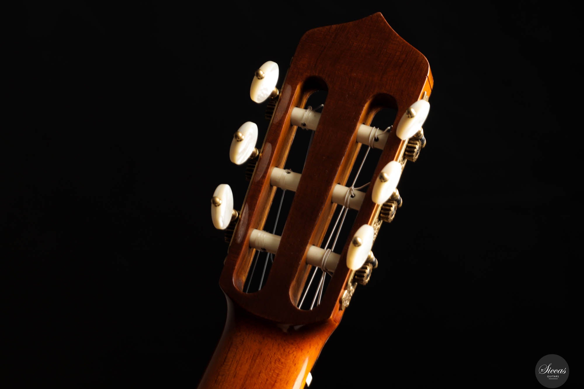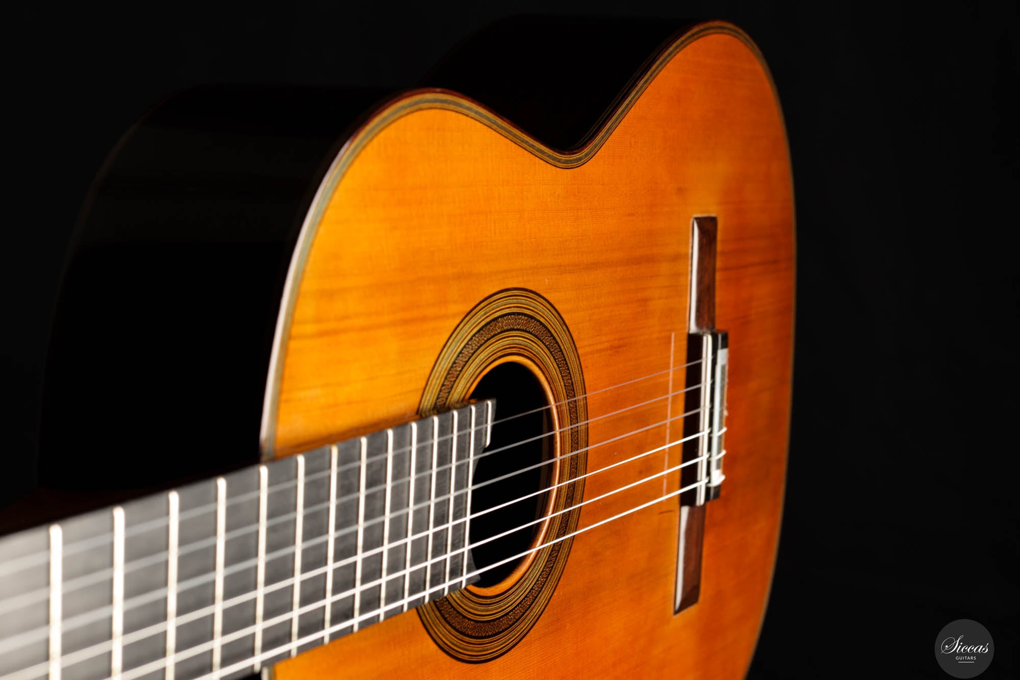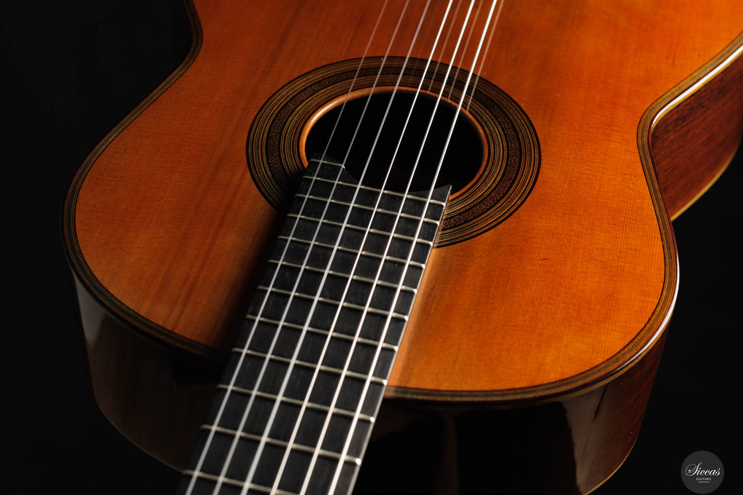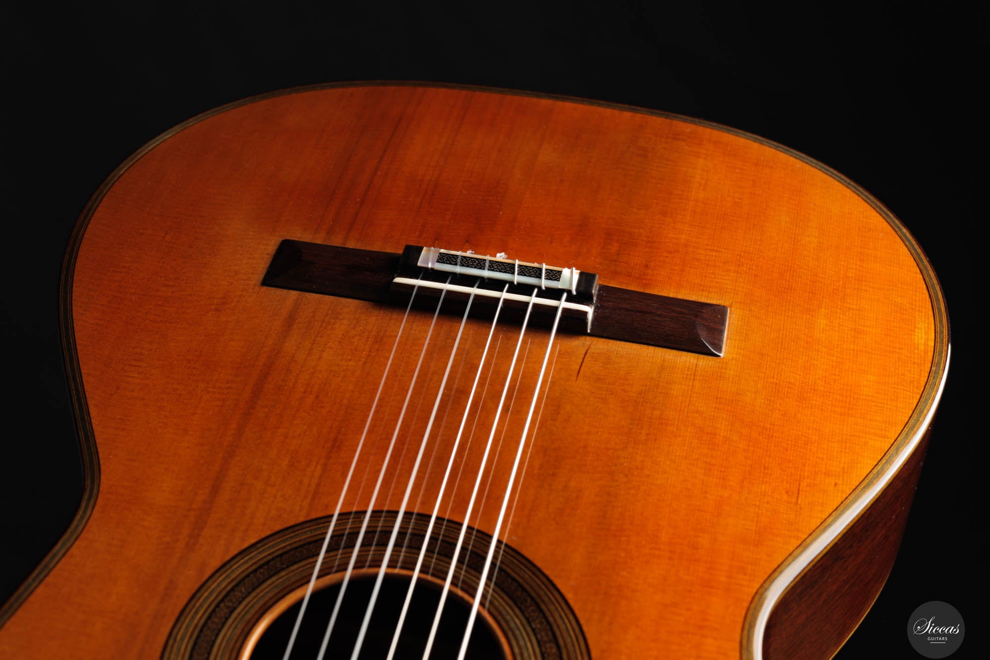 The tone of the Tacchi Coclea guitar is exceptionally rich and mature, characterized by a warm, romantic quality that is both singing and captivating. Despite being a preloved instrument, the guitar is in very good condition, exhibiting only minor signs of use. The soundboard has been repolished to bring out the beautiful grain of the cedar top, and a small hairline crack, located next to the lower bout, on the right side, has been professionally repaired to avoid any problems in the future.
