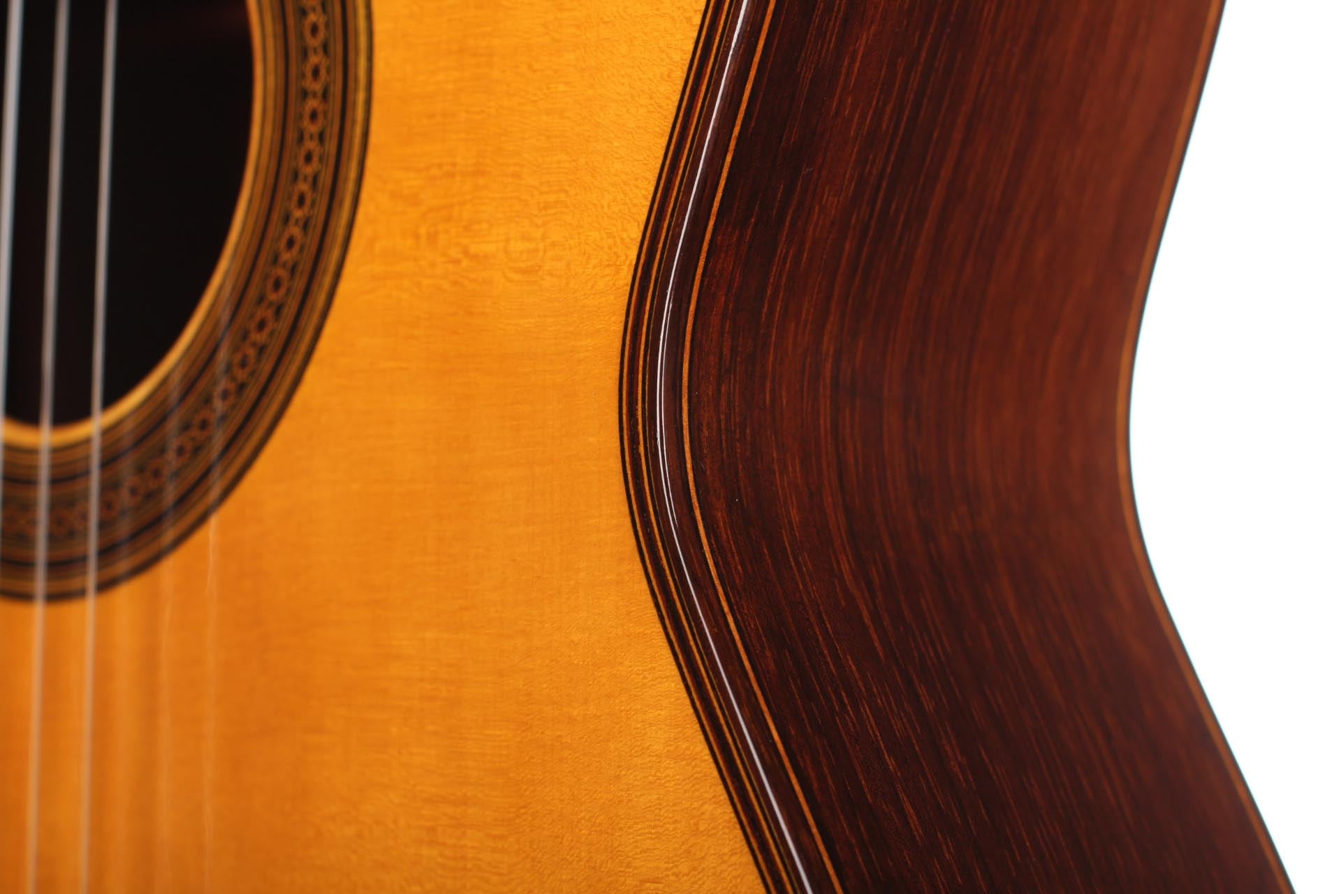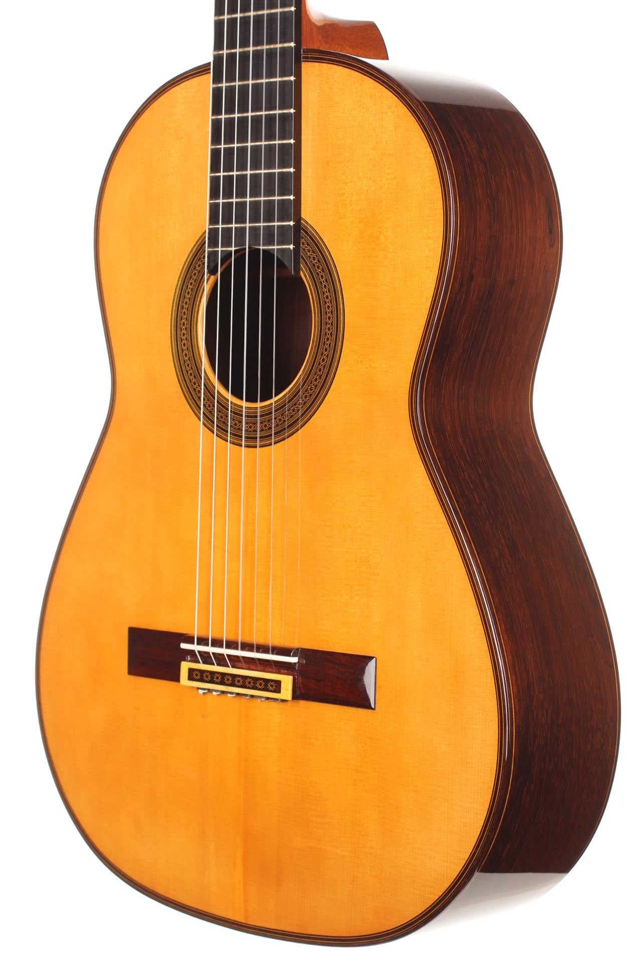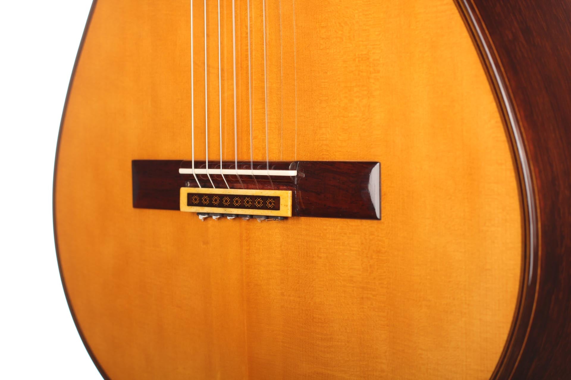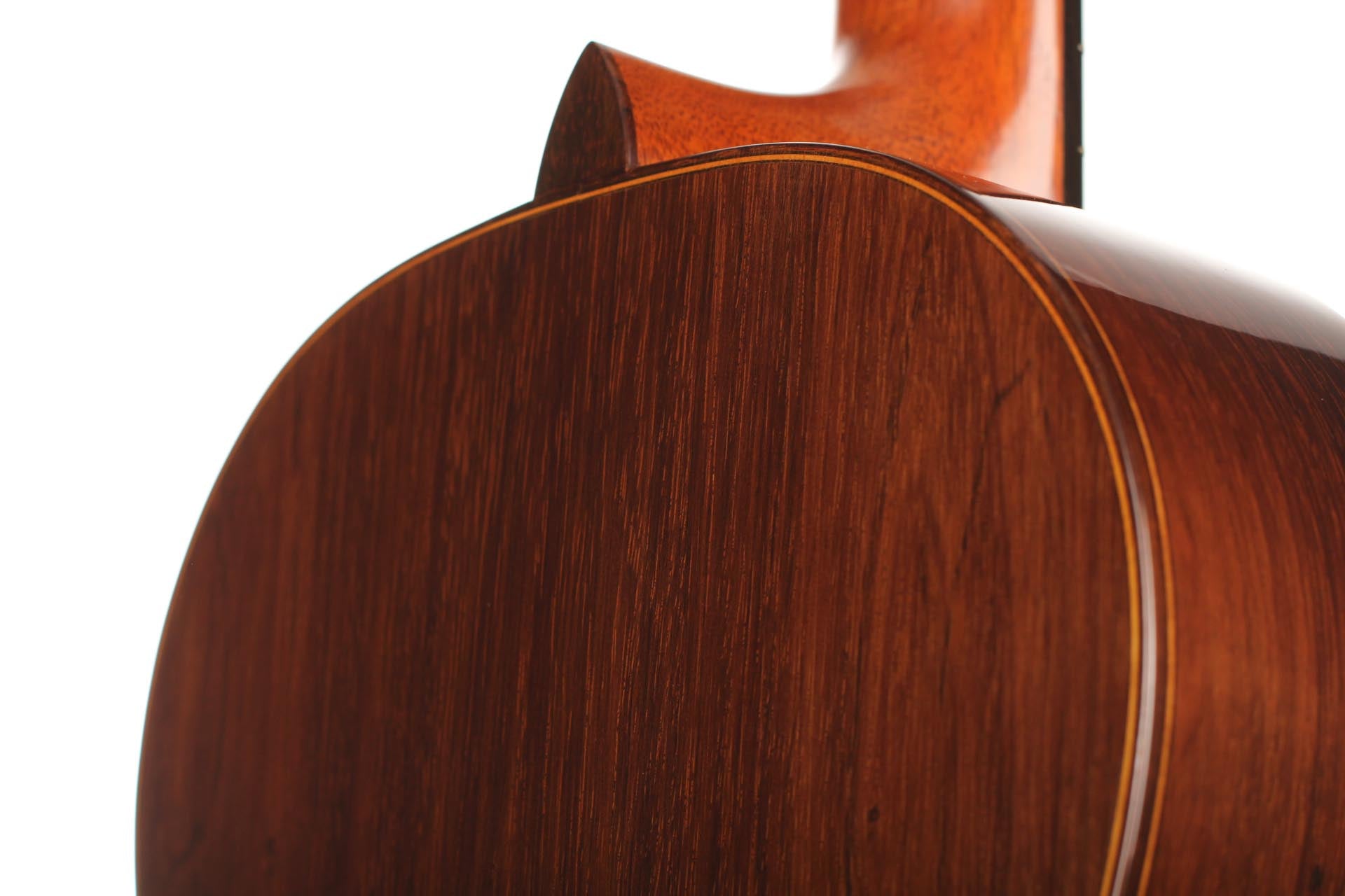 This particular guitar expresses with success both aesthetic and sound qualities that characterise Robert Bouchet’s priceless instruments. It is a light weighted concert guitar with the finest CITES-certified Brazilian rosewood quality and perfectly quarter saw spruce. It is worth pointing out that nowadays, such a beautiful dark and beautiful Brazilian rosewood log is very hard to find. The table is French-varnished with original warm-coloured shellac. It is equipped of very high-quality Rogers tuners. The guitar has only a very few playing marks and no structural issue. As the mid-century guitars of Robert Bouchet, it is a very responsive instrument with great tone contrast possibilities. The charming sound is very refined, rich and delicate. It is a very complete guitar with a very high level on every aspect expected from a concert guitar: quality of tone, sustain, sympathetic resonances, contrast and balance and power. This is a rare and outstanding instrument in every aspect of sound and aesthetics. A hard-shell case is included.