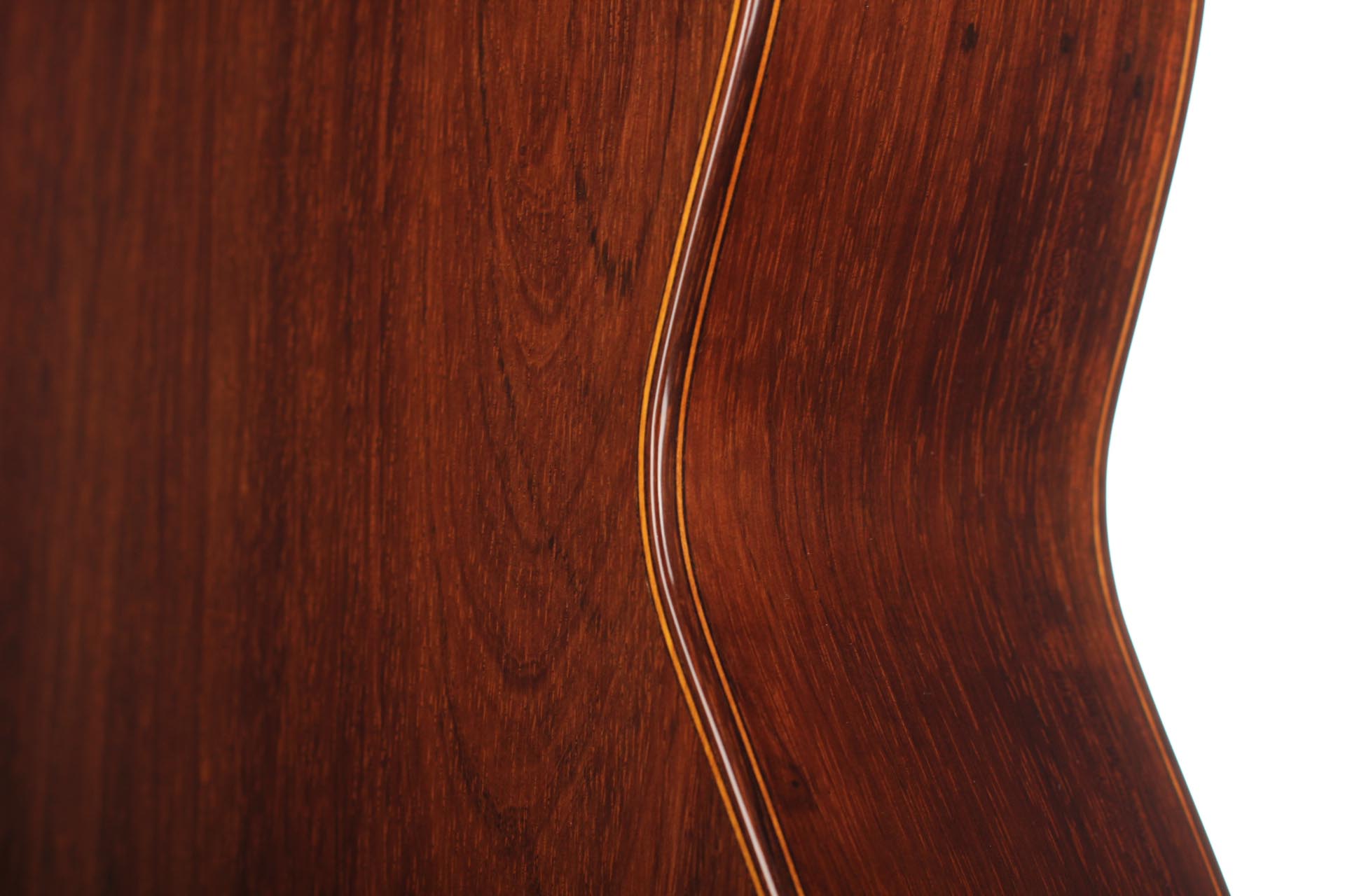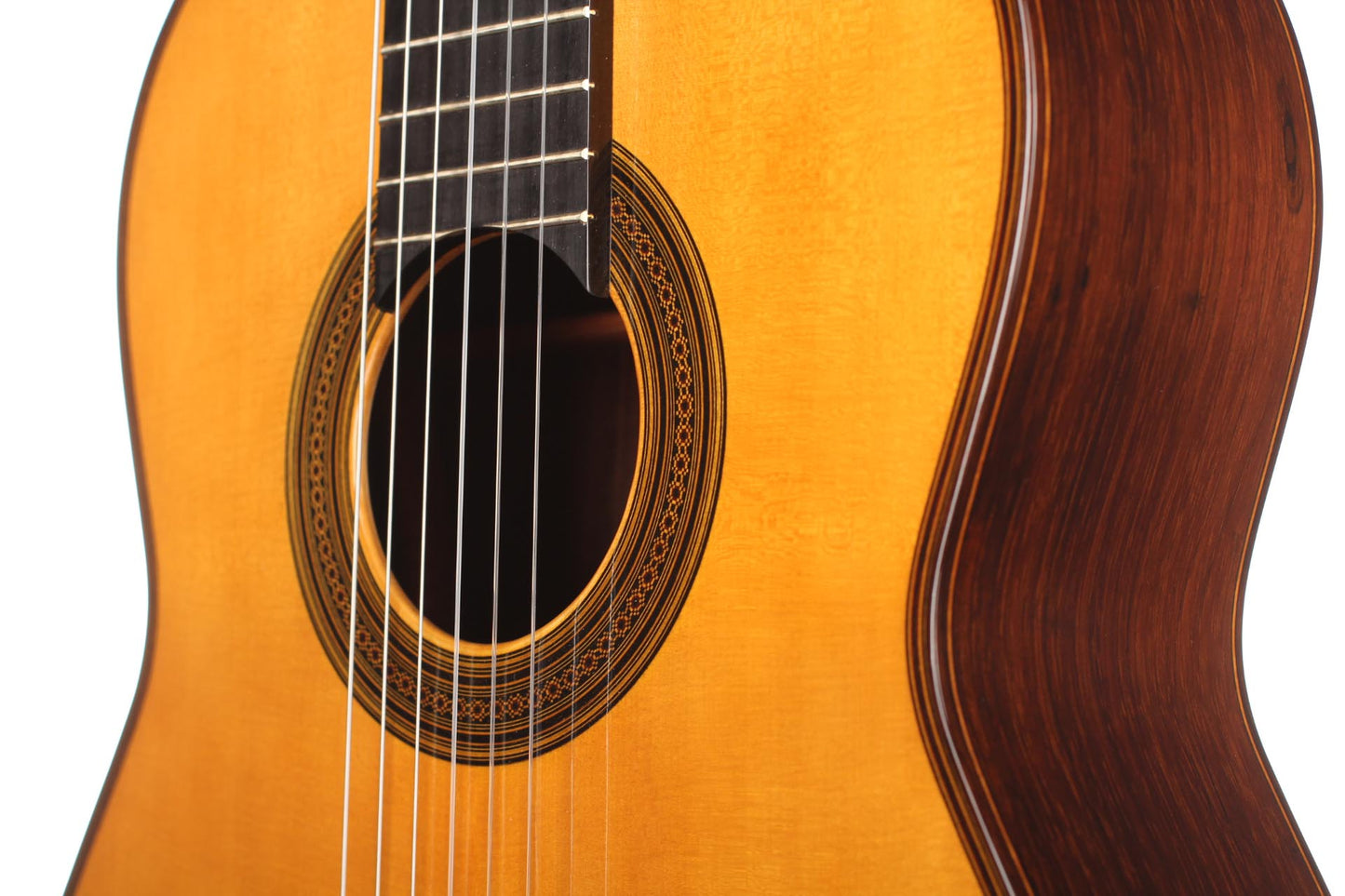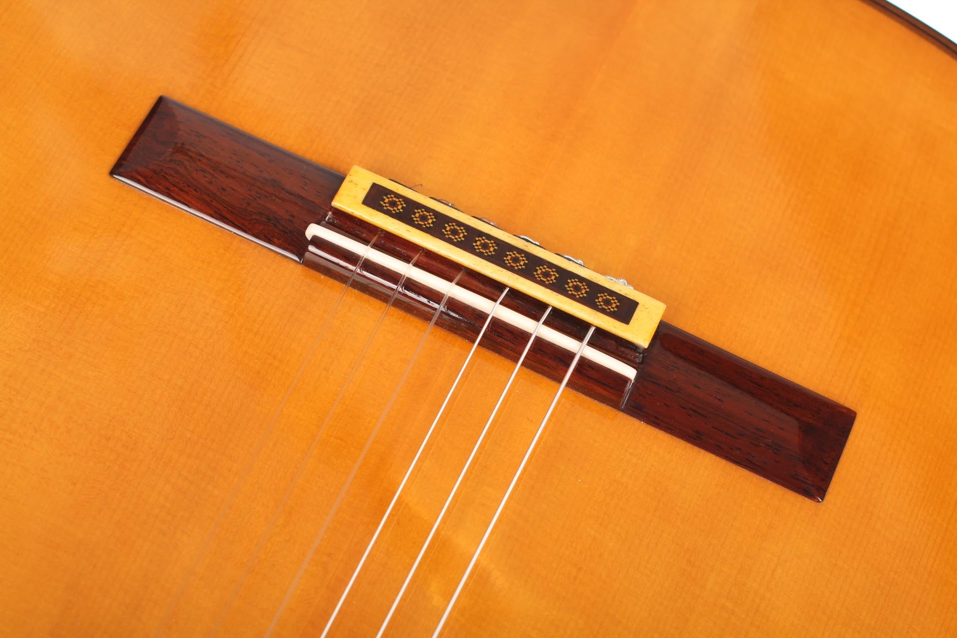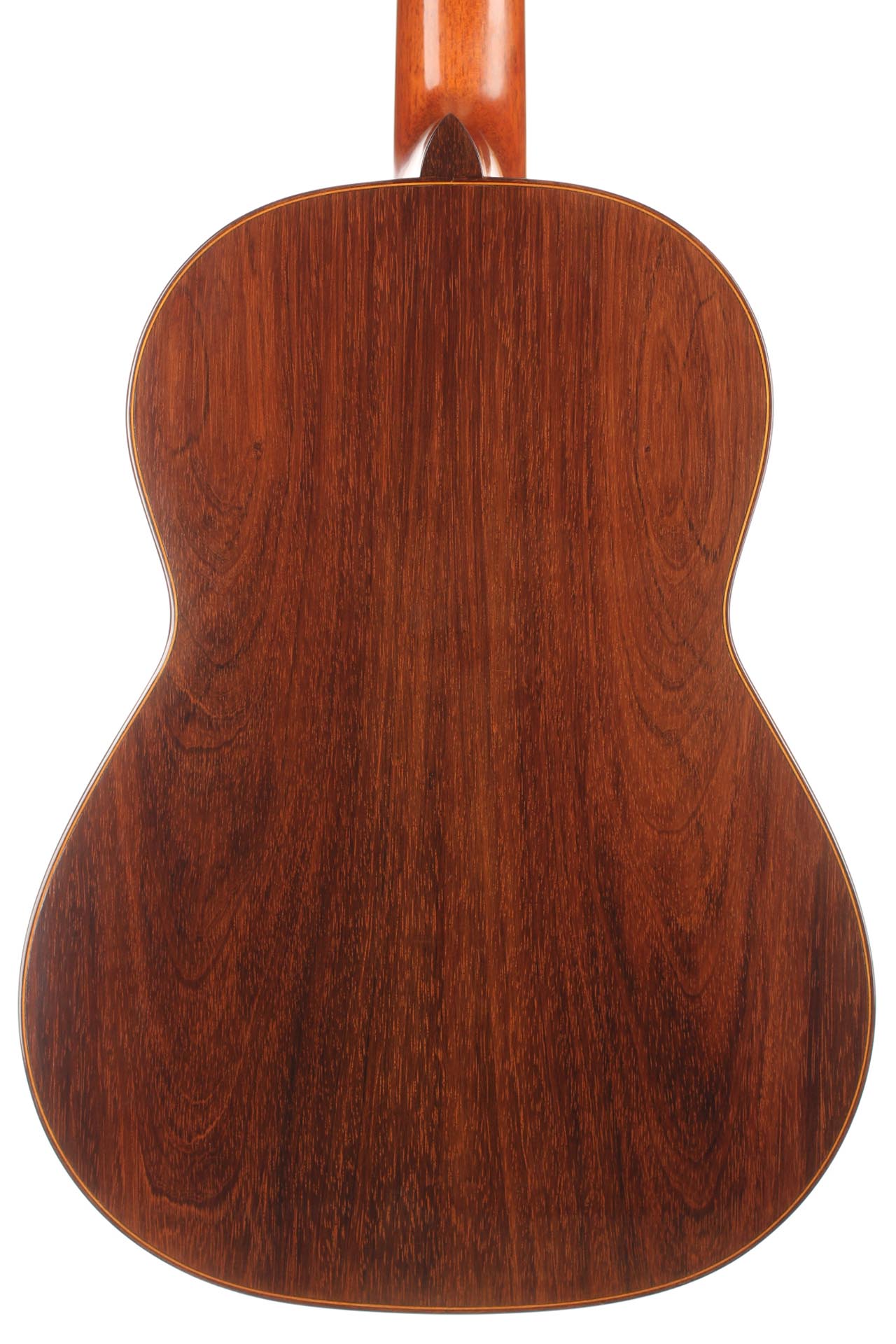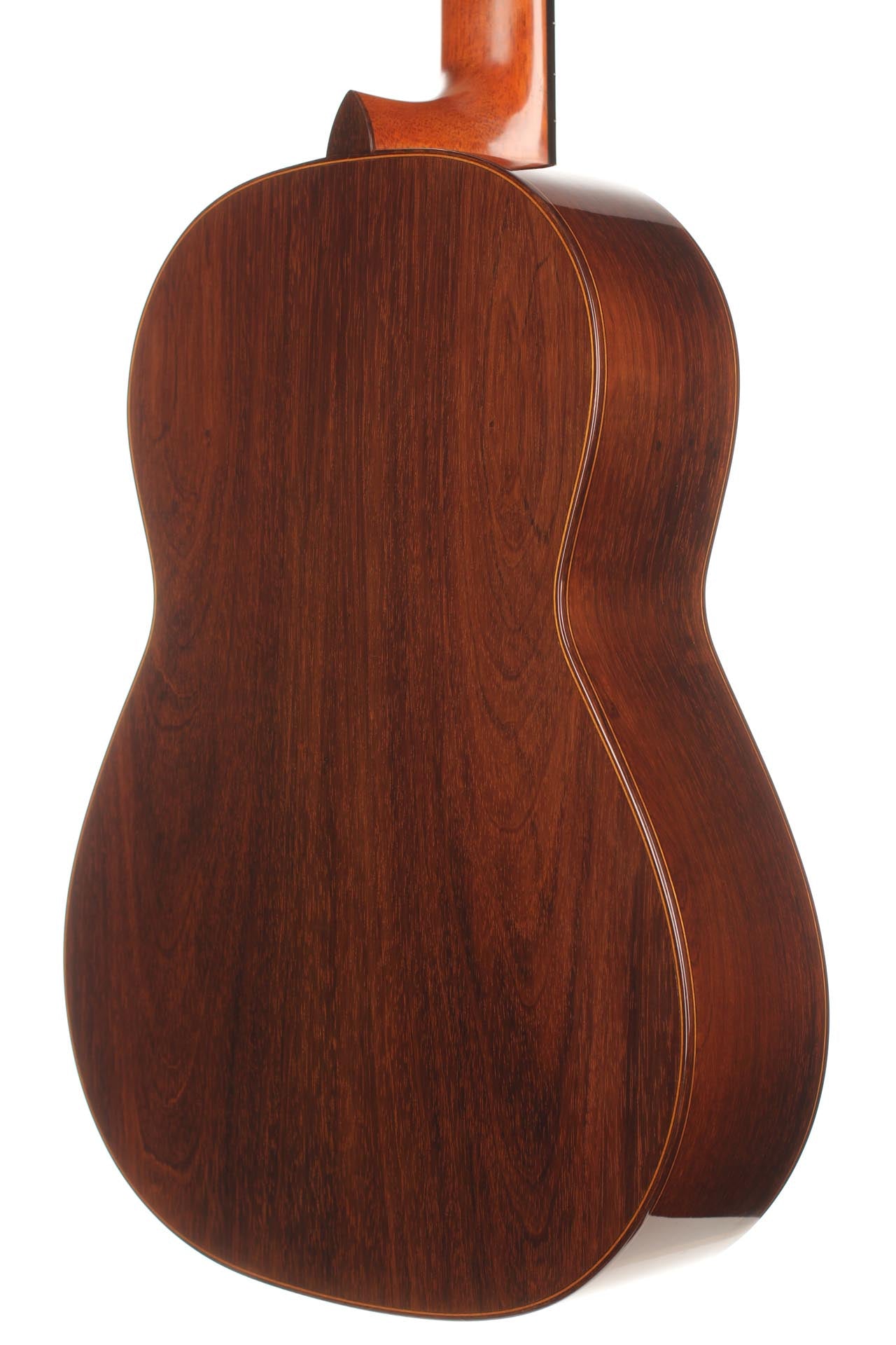 This particular guitar expresses with success both aesthetic and sound qualities that characterise Robert Bouchet’s priceless instruments. It is a light weighted concert guitar with the finest CITES-certified Brazilian rosewood quality and perfectly quarter saw spruce. It is worth pointing out that nowadays, such a beautiful dark and beautiful Brazilian rosewood log is very hard to find. The table is French-varnished with original warm-coloured shellac. It is equipped of very high-quality Rogers tuners. The guitar has only a very few playing marks and no structural issue. As the mid-century guitars of Robert Bouchet, it is a very responsive instrument with great tone contrast possibilities. The charming sound is very refined, rich and delicate. It is a very complete guitar with a very high level on every aspect expected from a concert guitar: quality of tone, sustain, sympathetic resonances, contrast and balance and power. This is a rare and outstanding instrument in every aspect of sound and aesthetics. A hard-shell case is included.