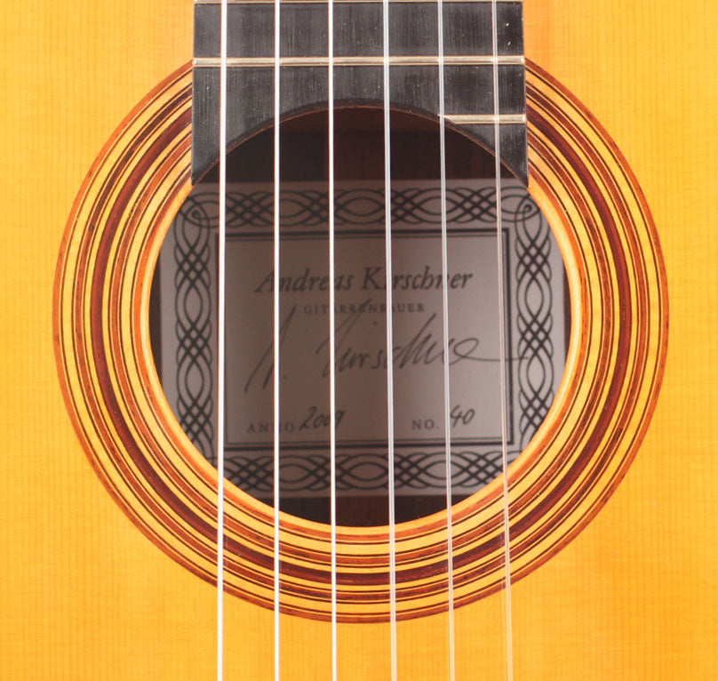 This is a very fine Andreas Kirschner guitar with spruce top, made in 2009. Andreas' guitars are professional level classical concert instruments that are comfortable to play. This guitar is built with an elevated fingerboard which not only changes the way that strings pull on the board, giving a firm and positive attack, but it also makes playing in the upper register more comfortable. But also the shape of the neck and the thickness of the fingerboard make it easy to play. Another feature is the soundport in the upper bout sides near the heel that increases the air flow through the body which lets the soundboard move more freely. These hole not only increase the presence of the sound for the player but also add to the volume, clarity, openness and depth for the listener. Back and sides are made of well matured Indian rosewood. The spruce of the top is seasoned at least 15 years and has also a French-polish. The tone is very rich and combined with clarity. Overall condition is very good condition. The tuners are made by Graf. Comes with a Hiscox Pro II case.