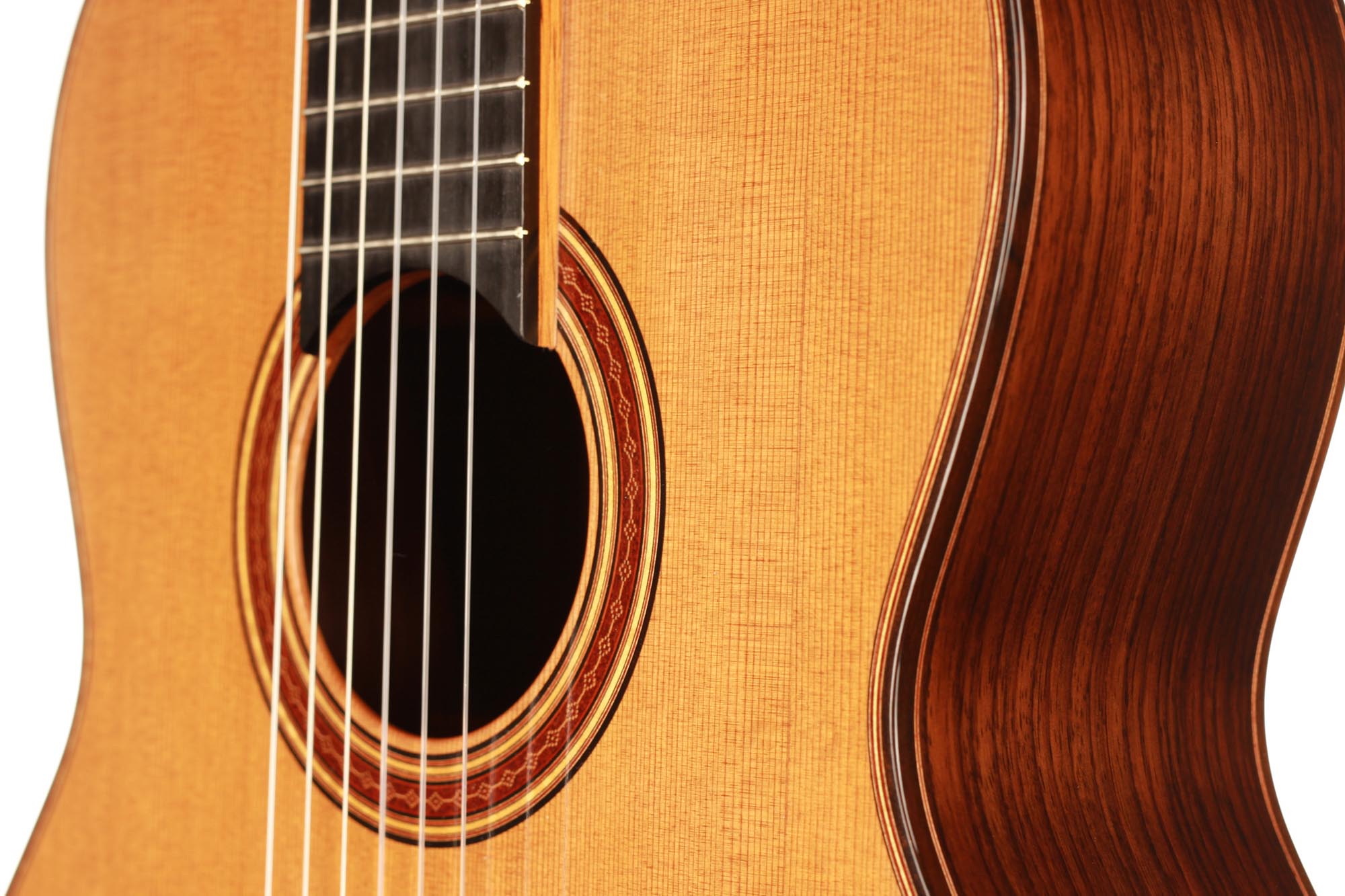 This 2018 cedar double-top guitar came directly from A. Kirschner’s workshop. Only a few notes are enough to identify the incredible tone qualities of this guitar. It has rich developing overtones and great volume. The sustain is nice and consistent all over the registers, making this guitar a very balanced instrument. The richness of colour is very impressive and minimal right-hand motion open whole new possibilities. Scheller tuners are insuring a very stable tune and show that all the details of this guitar were really brought to the best level.