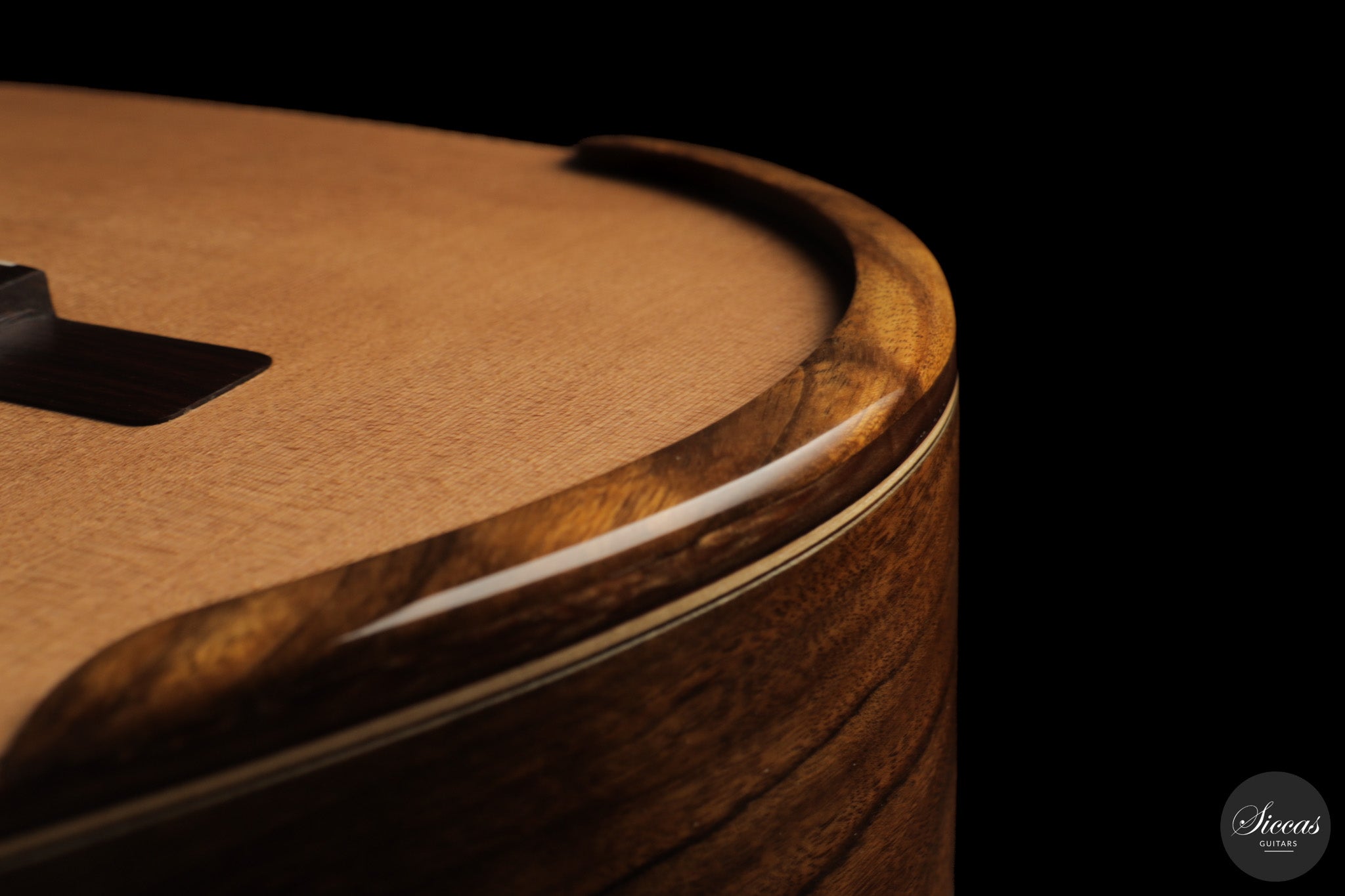 The visual conception is equally deliberate. The Indian rosewood bridge, the bindings, and the rosette are coordinated in colour and form, giving the instrument a unified appearance. The epoxy resin bindings are cast directly onto the body, adding an individual and coherent visual identity, while the ergonomic armrest contributes to comfort in extended playing. Handmade Pagos tuners complete an instrument whose design is guided by function, but never indifferent to refinement.