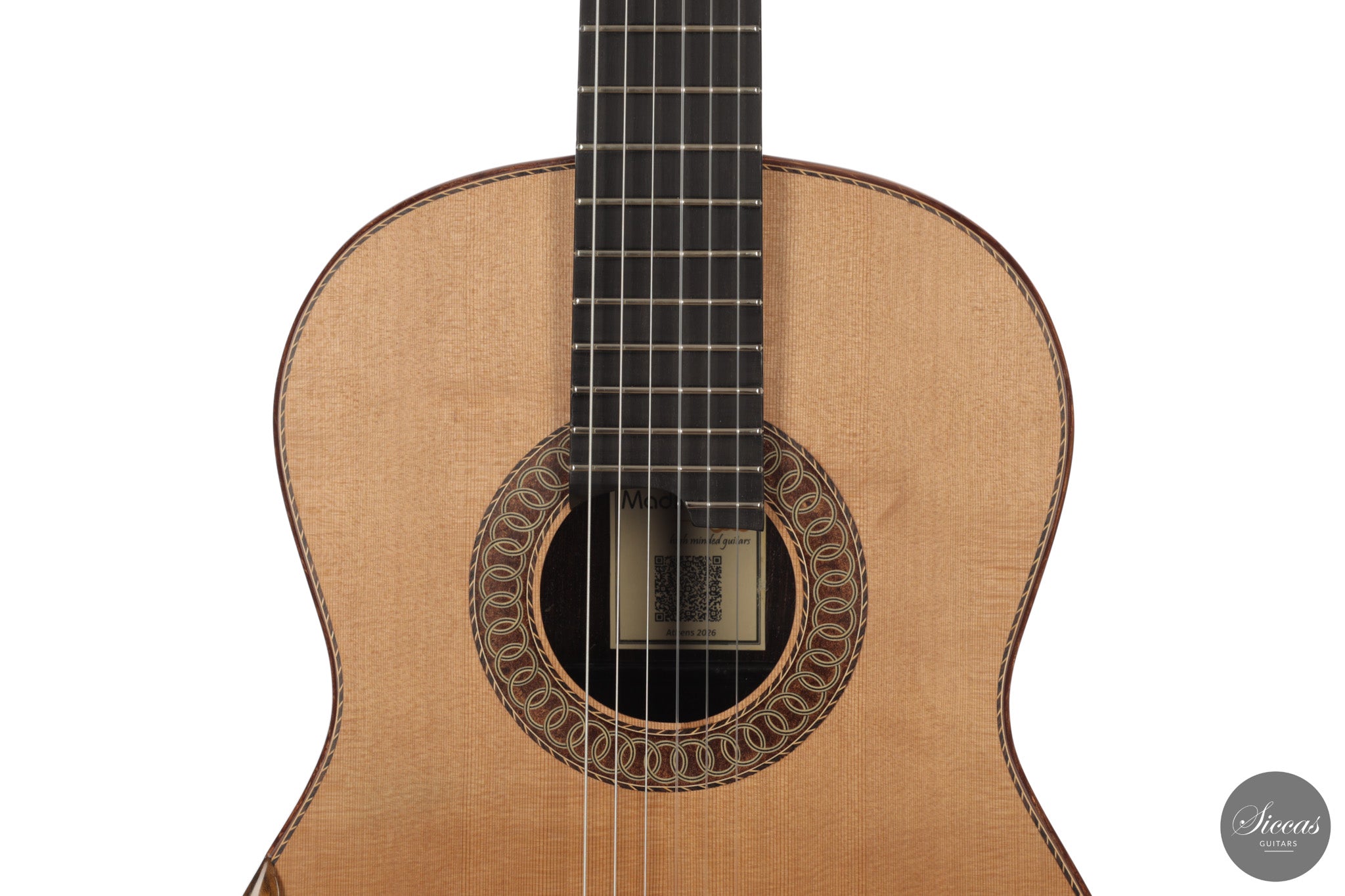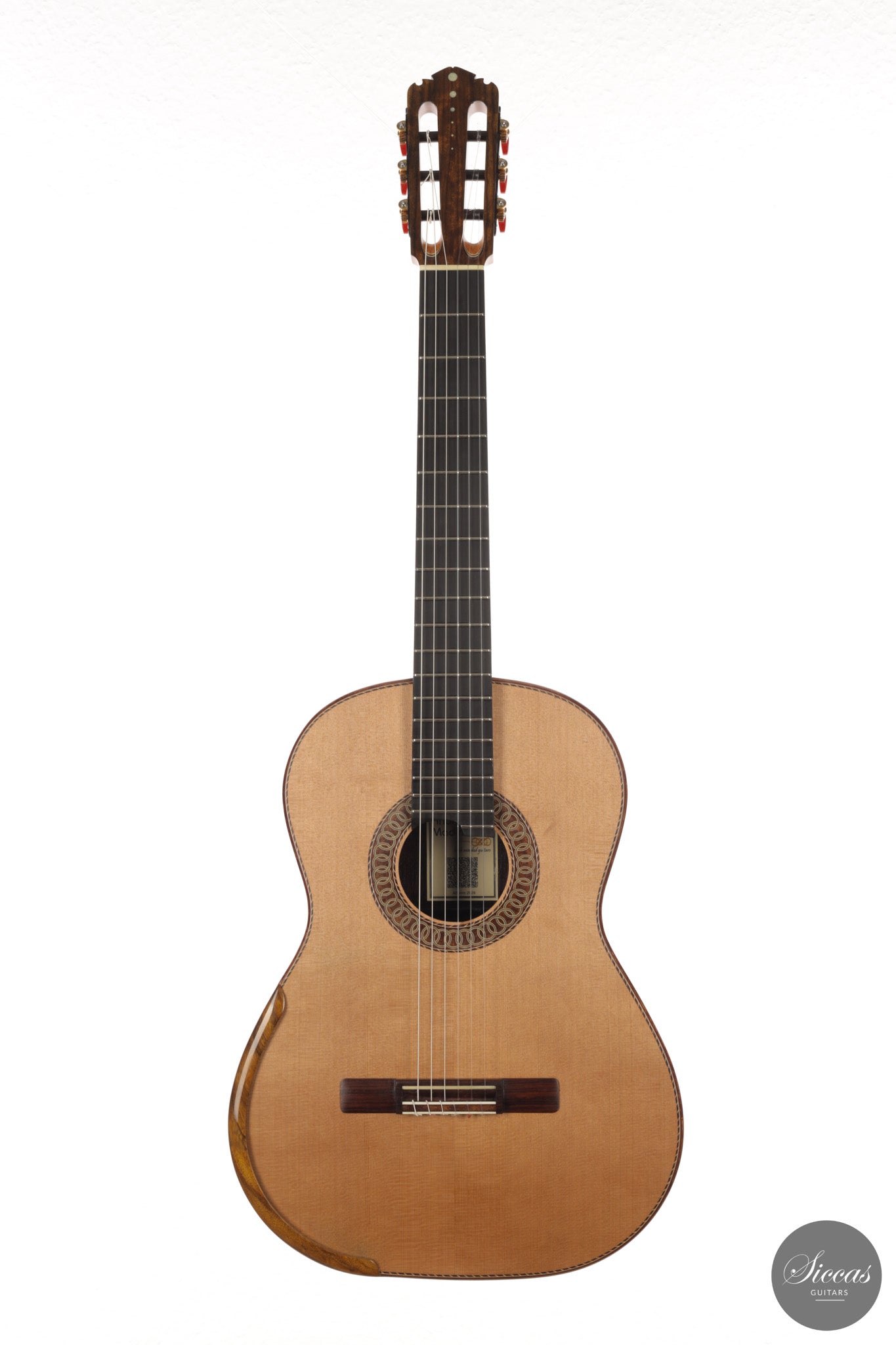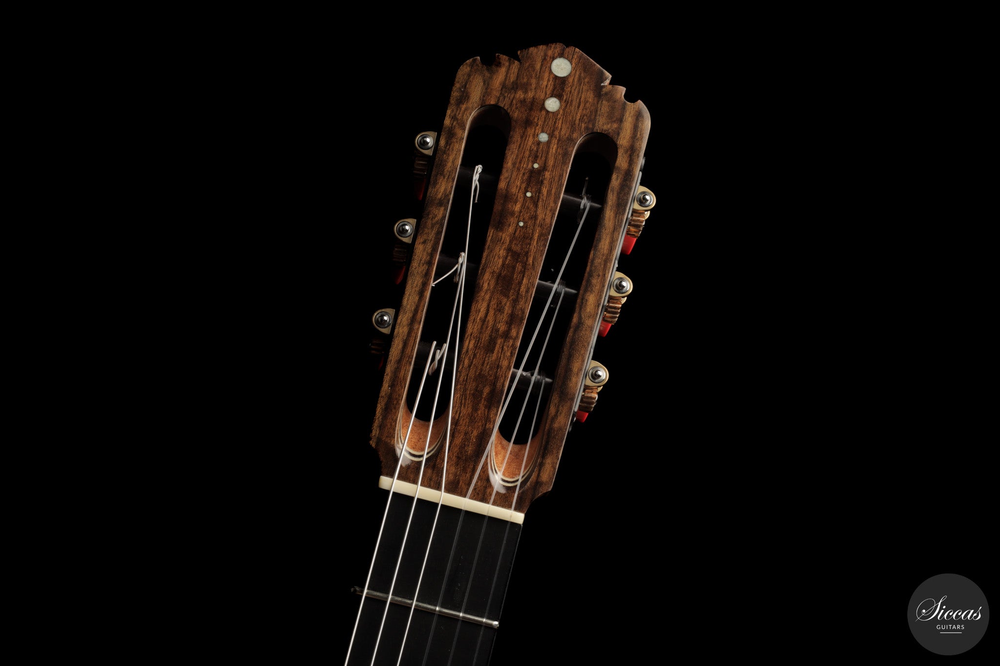 A central aspect of the construction is the internal frame developed with Charalampos Koumridis. According to the maker, this patent protected system is intended to reinforce projection, sustain, and the lower register. In playing, the result is a guitar that responds quickly, carries easily, and remains stable under changes of colour and pressure. It offers substantial dynamic capacity without losing clarity, which makes it well suited to both large scale concert literature and more contemporary playing techniques that require immediacy and control.