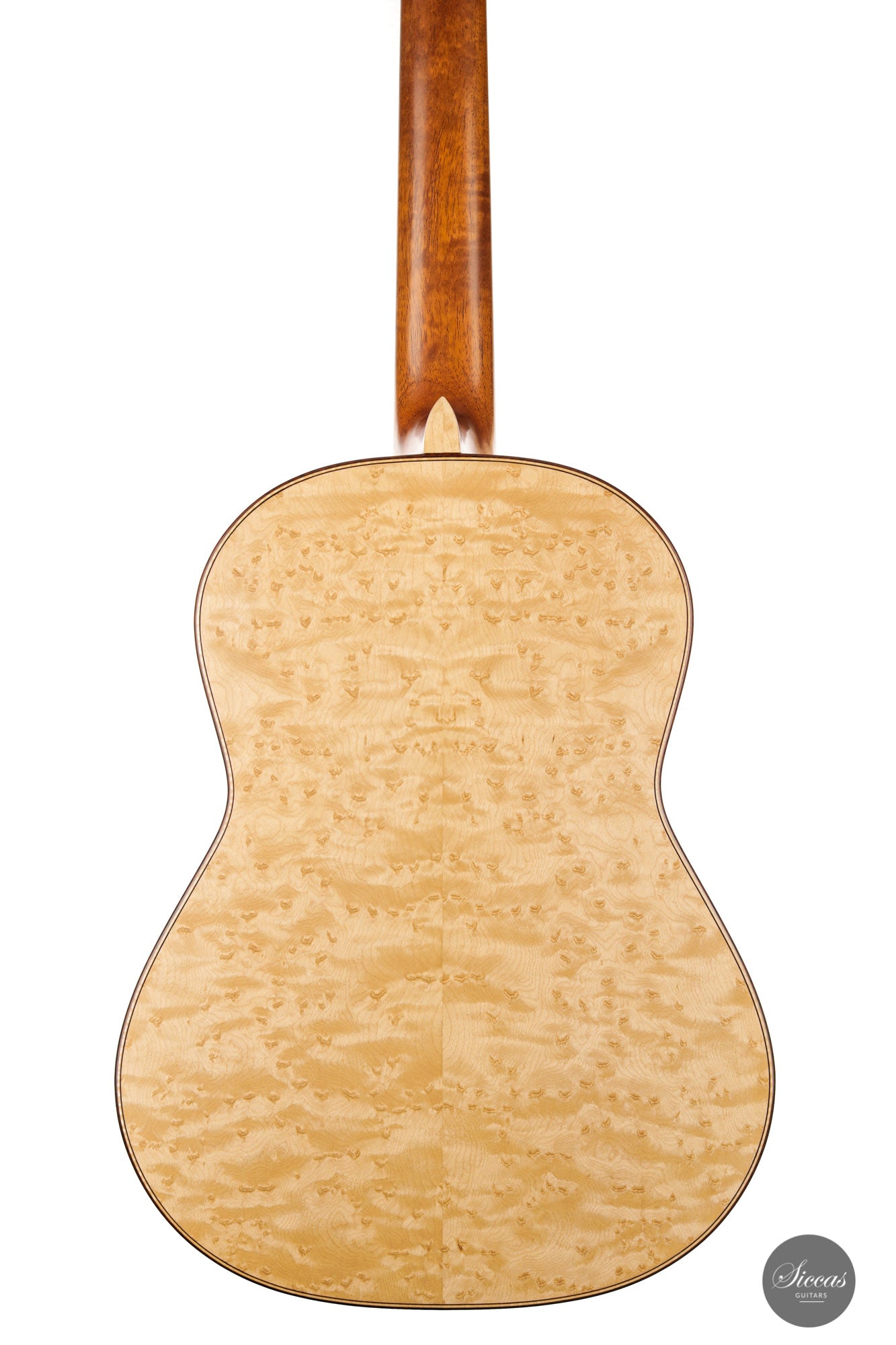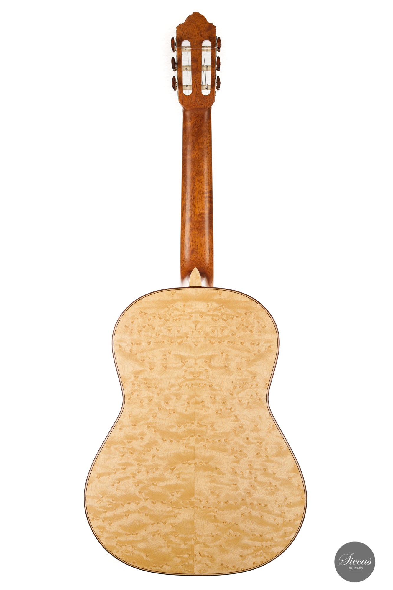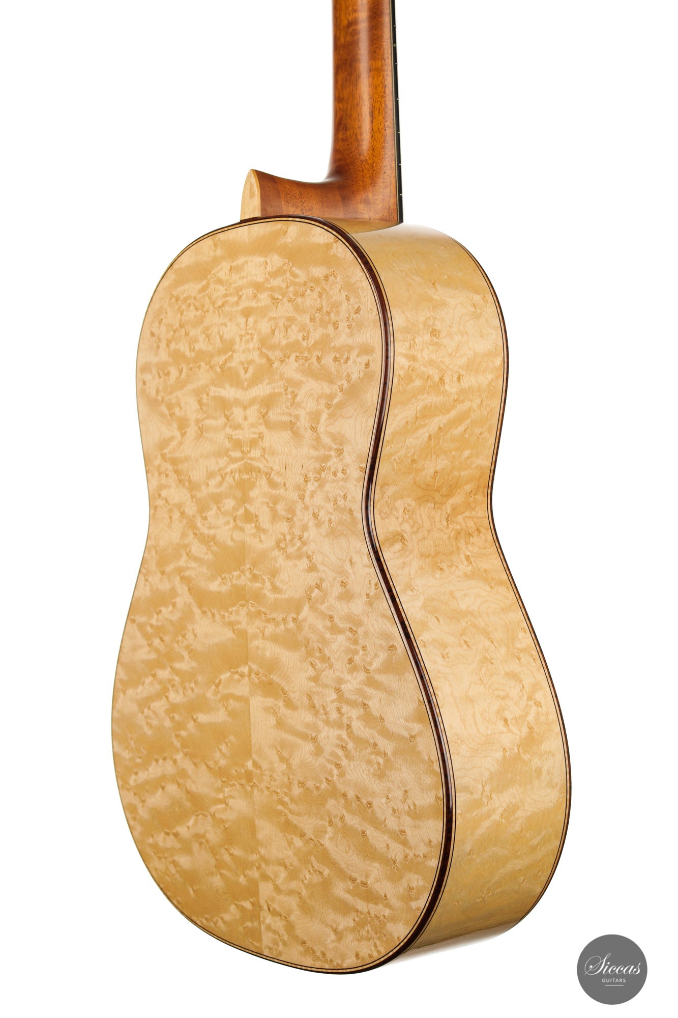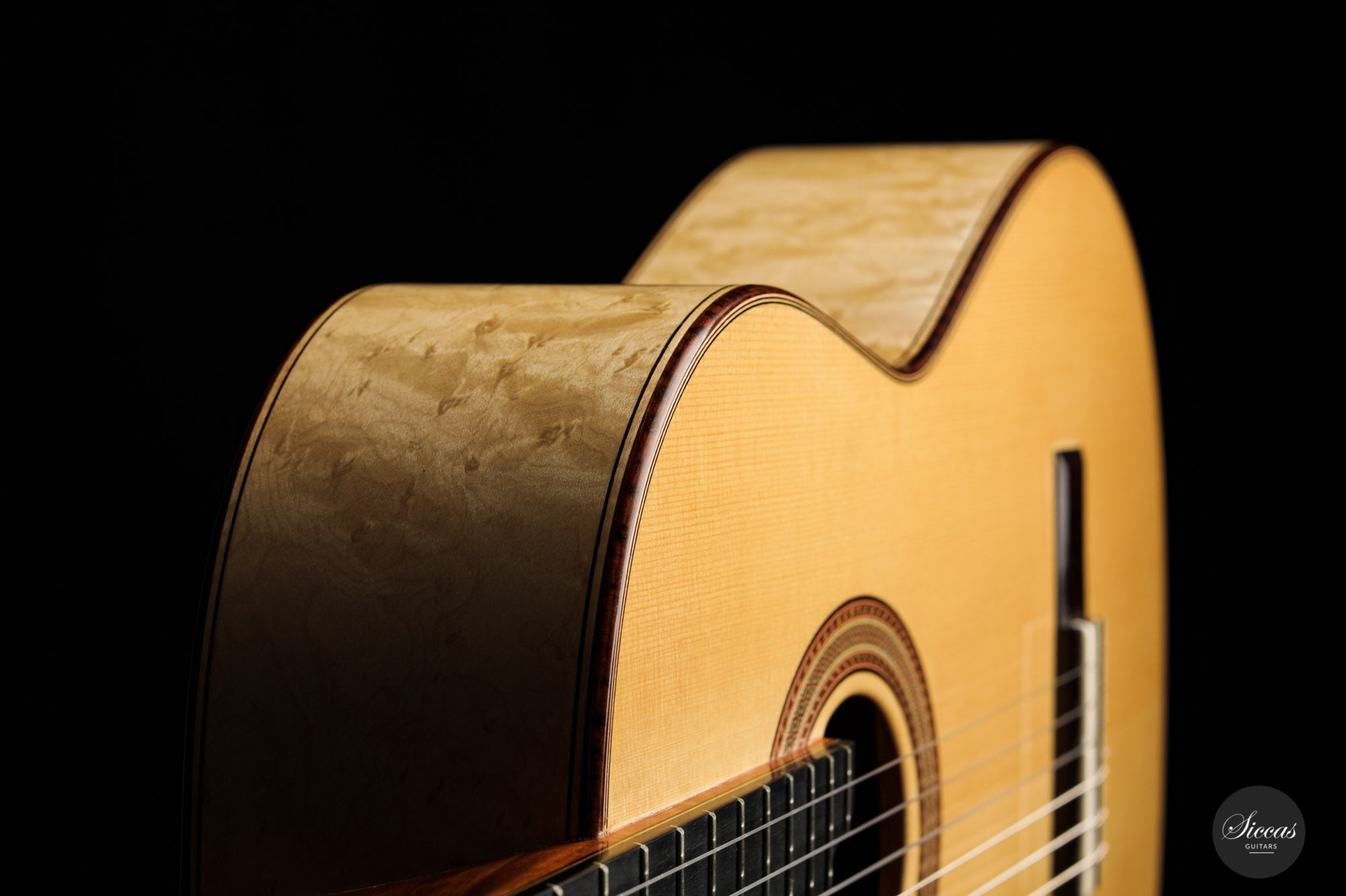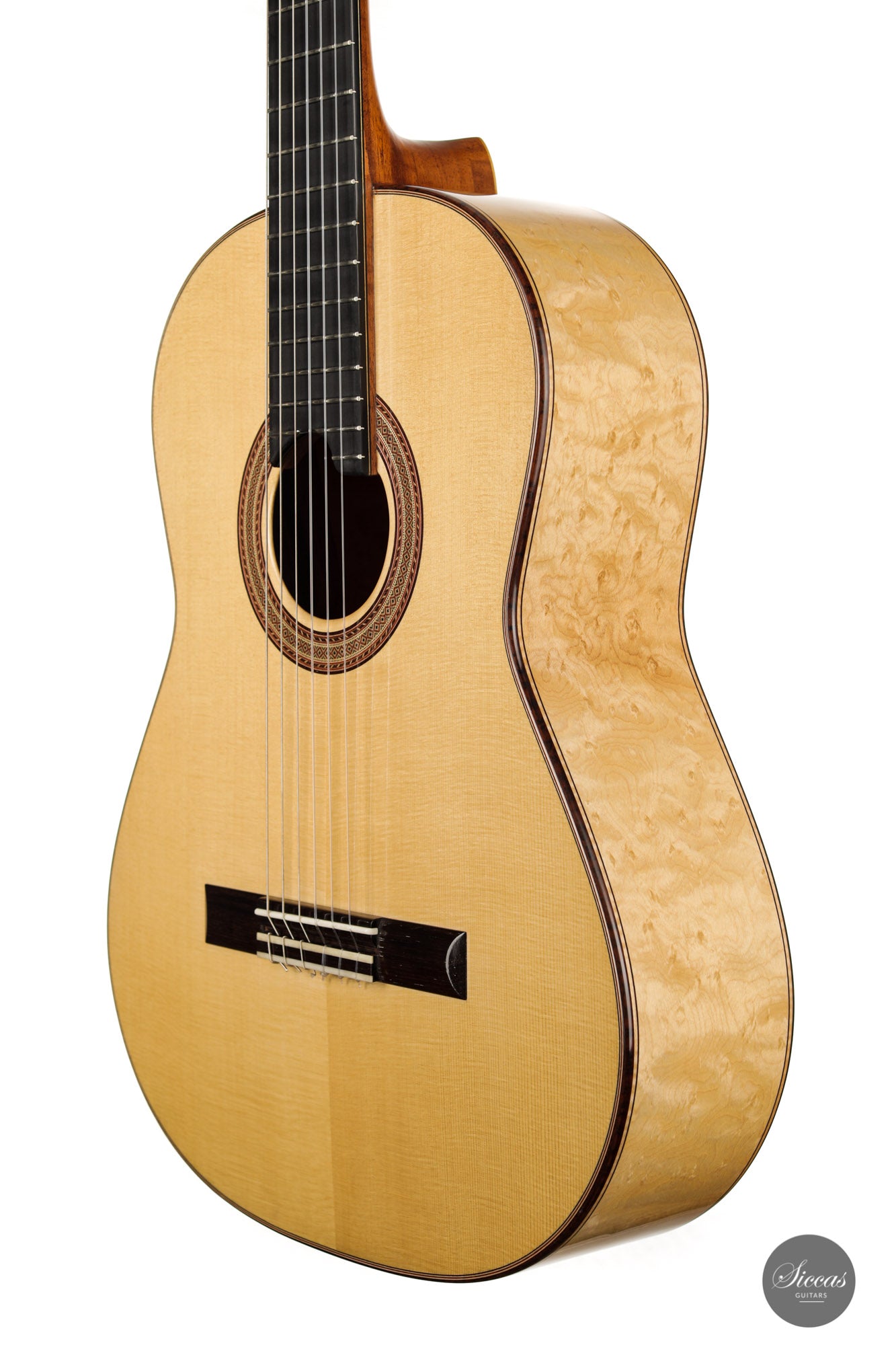 What an interesting guitar, featuring a back and sides made of beautiful birdseye maple. This wood, which was frequently used among luthiers of romantic guitars in the XIXth century and was later also highly appreciated by the father of the classical guitar, Antonio de Torres, is in demand again and enjoys growing popularity on the stages of international competitions and concert halls. The particular clarity and transparency of its tone, together with its excellent aesthetic qualities, make it a truly attractive tonewood.