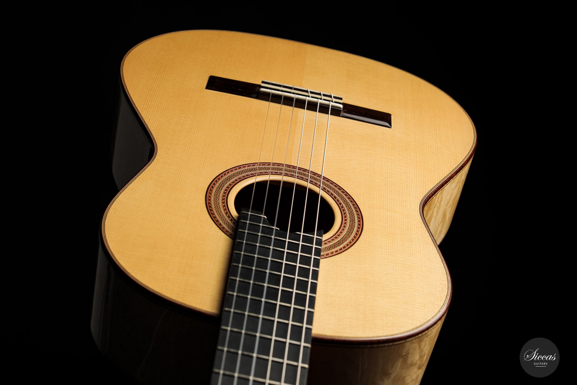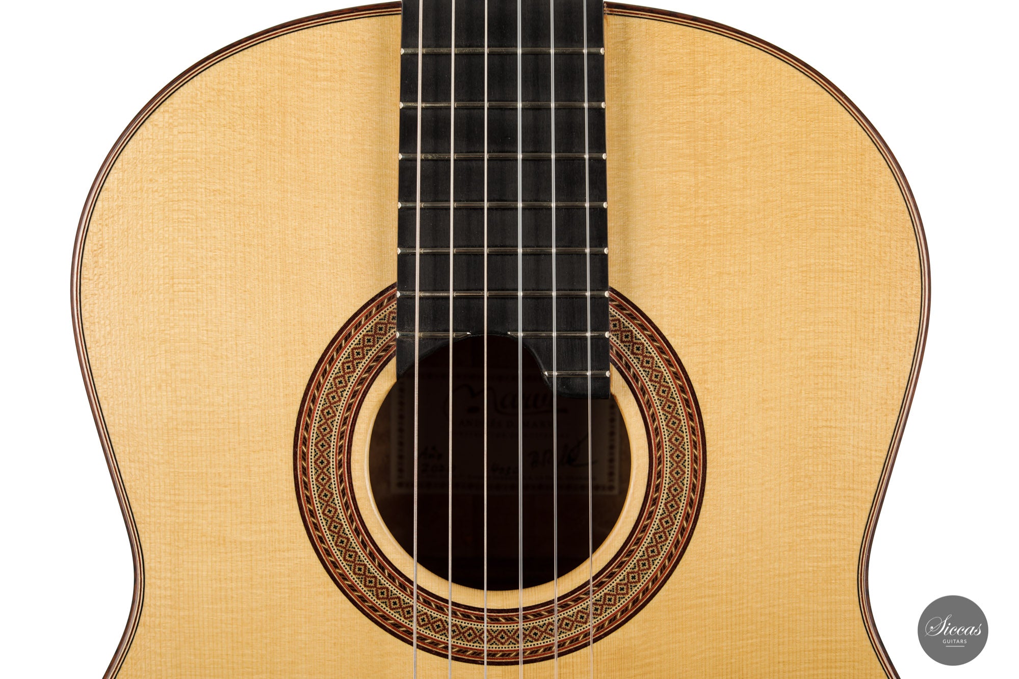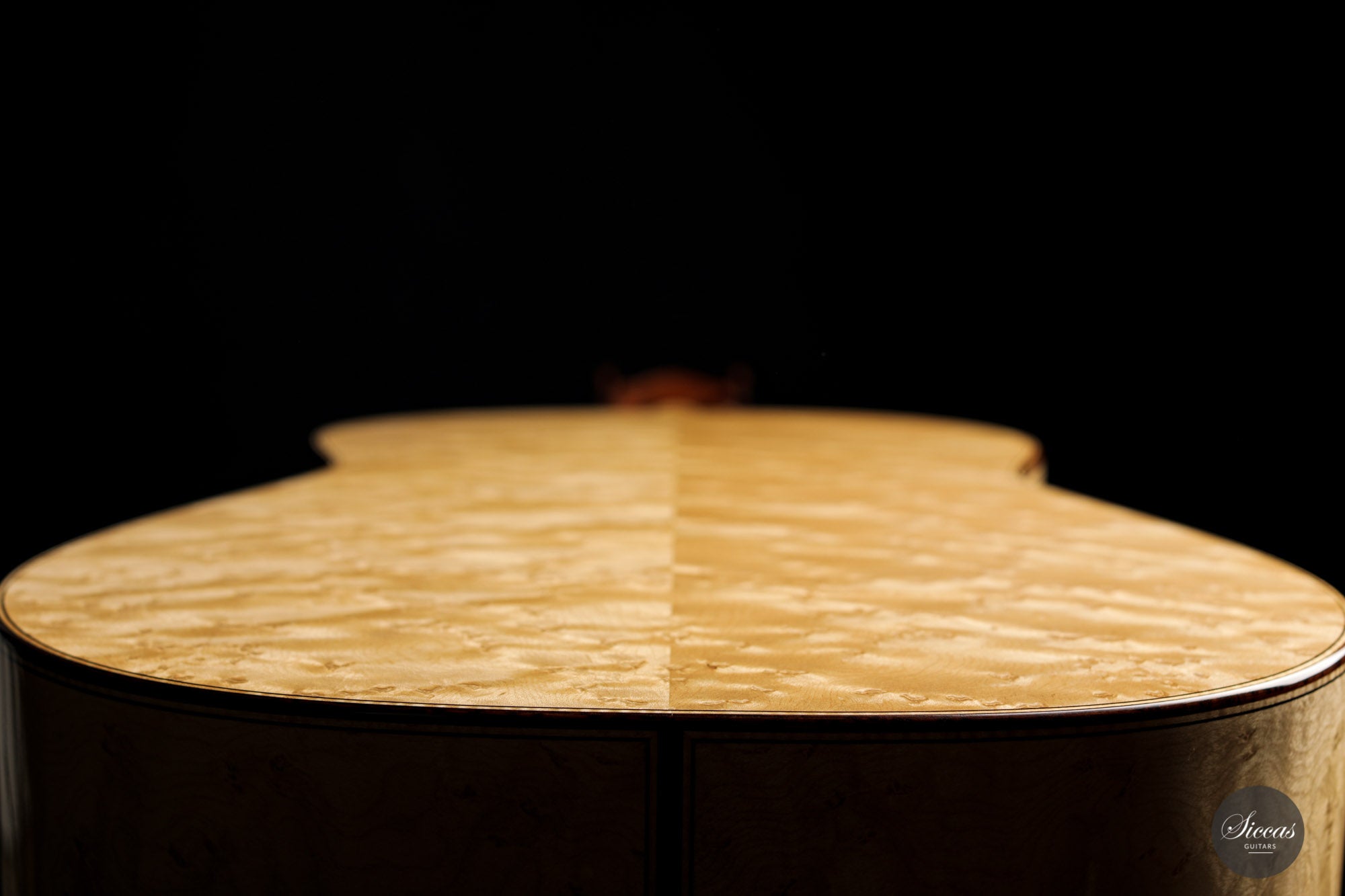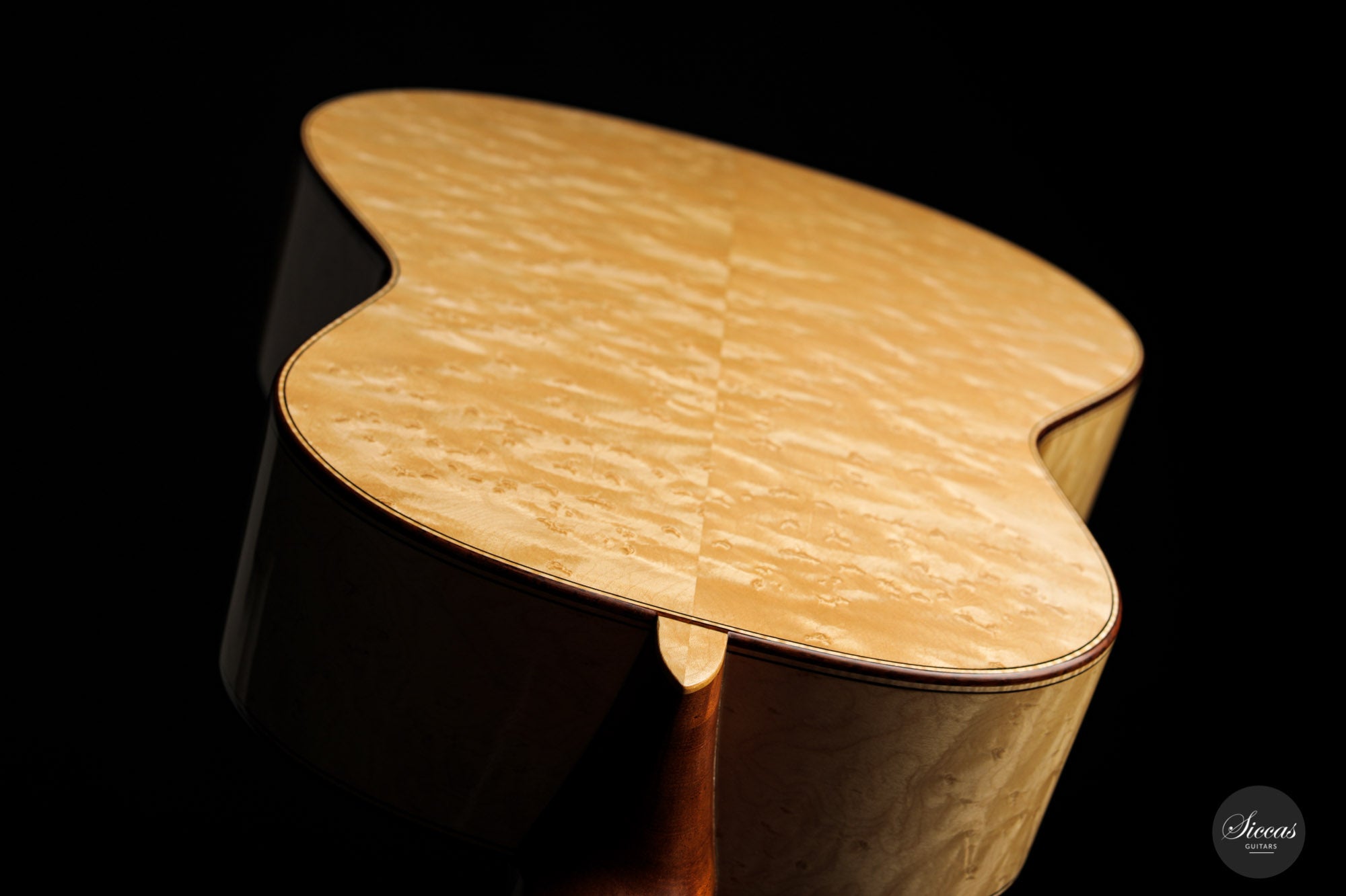 What an interesting guitar, featuring a back and sides made of beautiful birdseye maple. This wood, which was frequently used among luthiers of romantic guitars in the XIXth century and was later also highly appreciated by the father of the classical guitar, Antonio de Torres, is in demand again and enjoys growing popularity on the stages of international competitions and concert halls. The particular clarity and transparency of its tone, together with its excellent aesthetic qualities, make it a truly attractive tonewood.