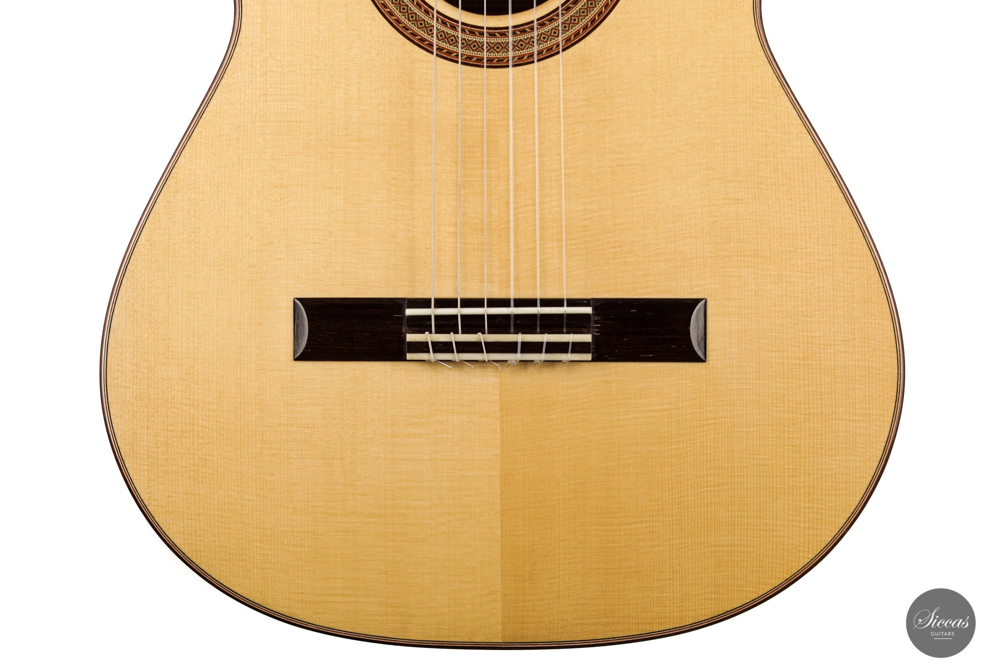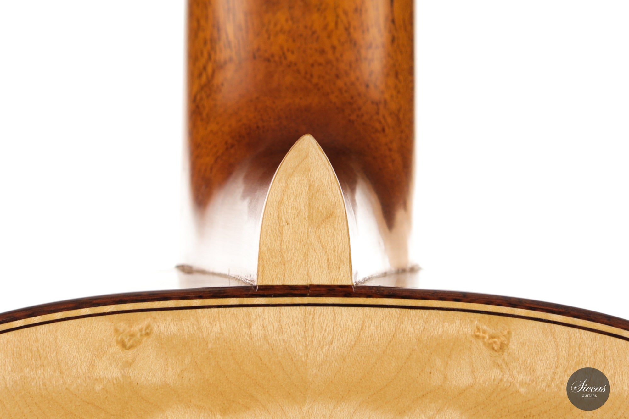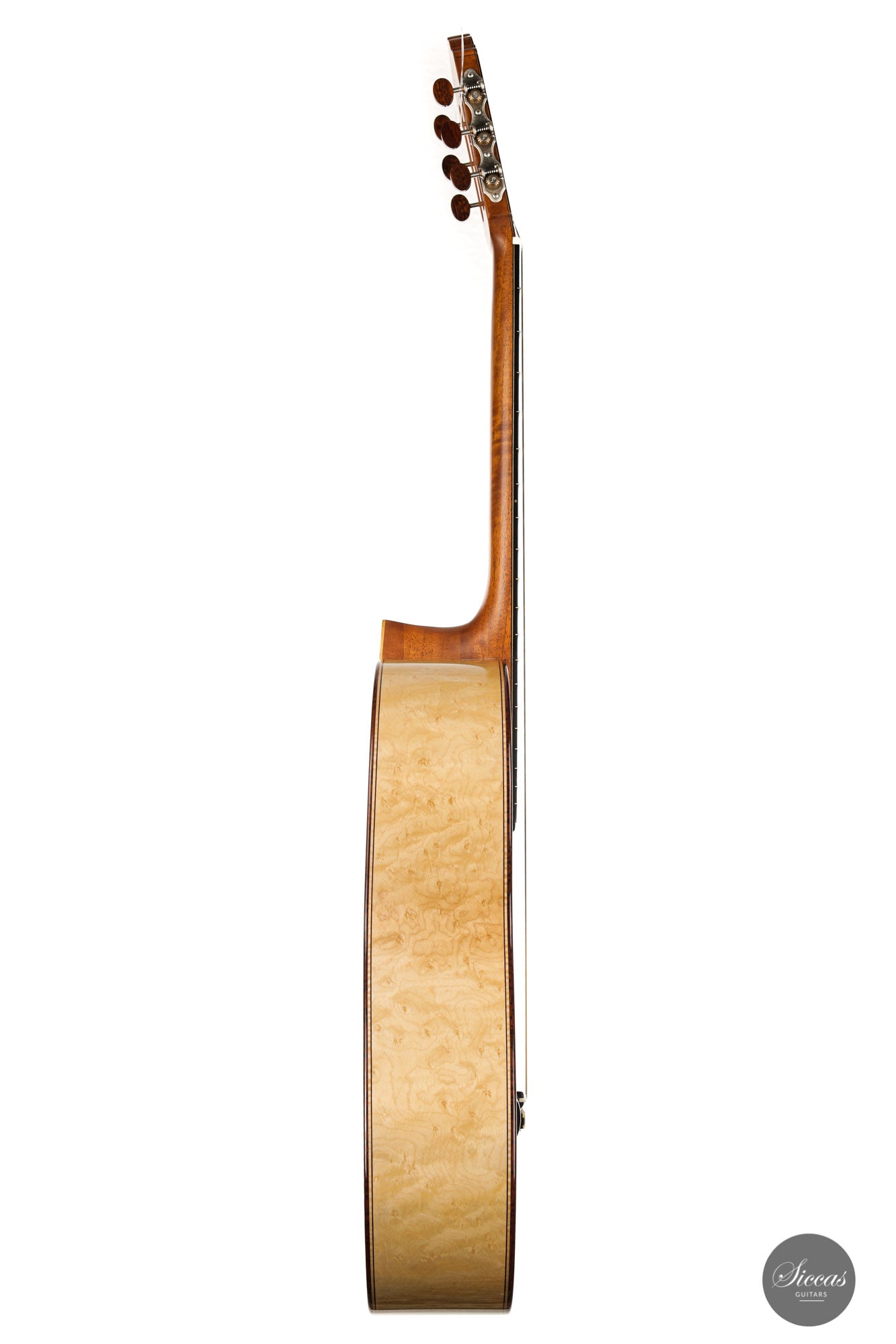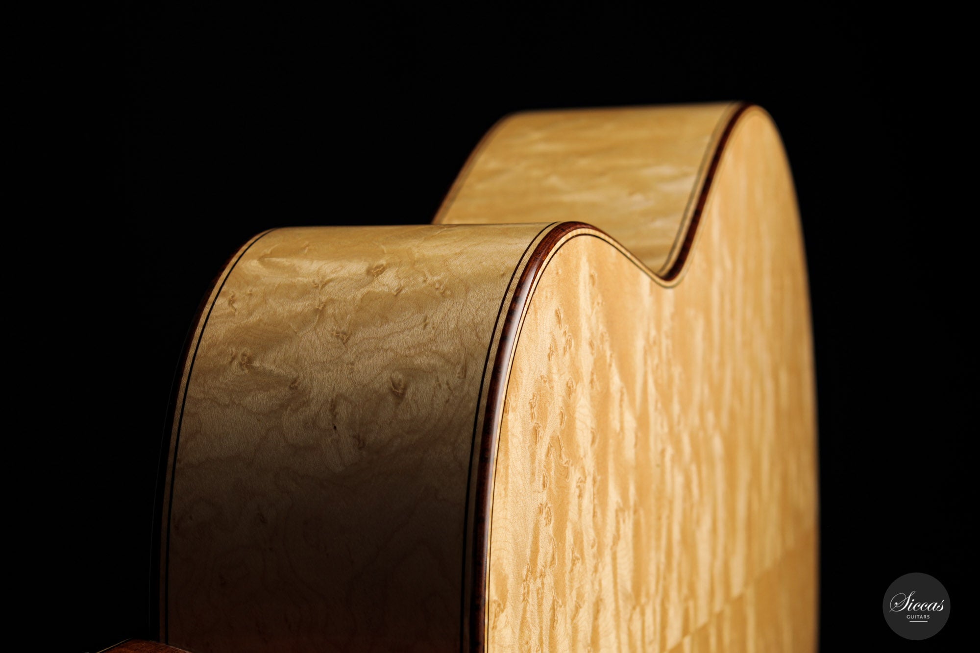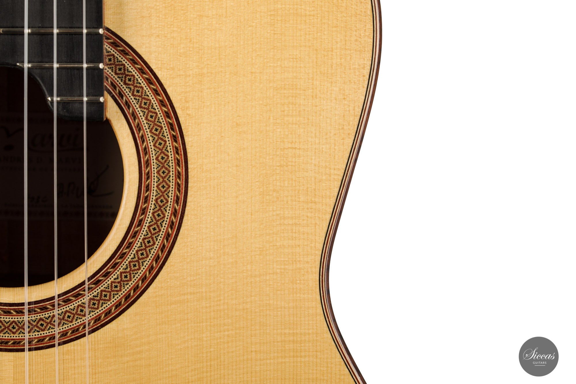 What an interesting guitar, featuring a back and sides made of beautiful birdseye maple. This wood, which was frequently used among luthiers of romantic guitars in the XIXth century and was later also highly appreciated by the father of the classical guitar, Antonio de Torres, is in demand again and enjoys growing popularity on the stages of international competitions and concert halls. The particular clarity and transparency of its tone, together with its excellent aesthetic qualities, make it a truly attractive tonewood.