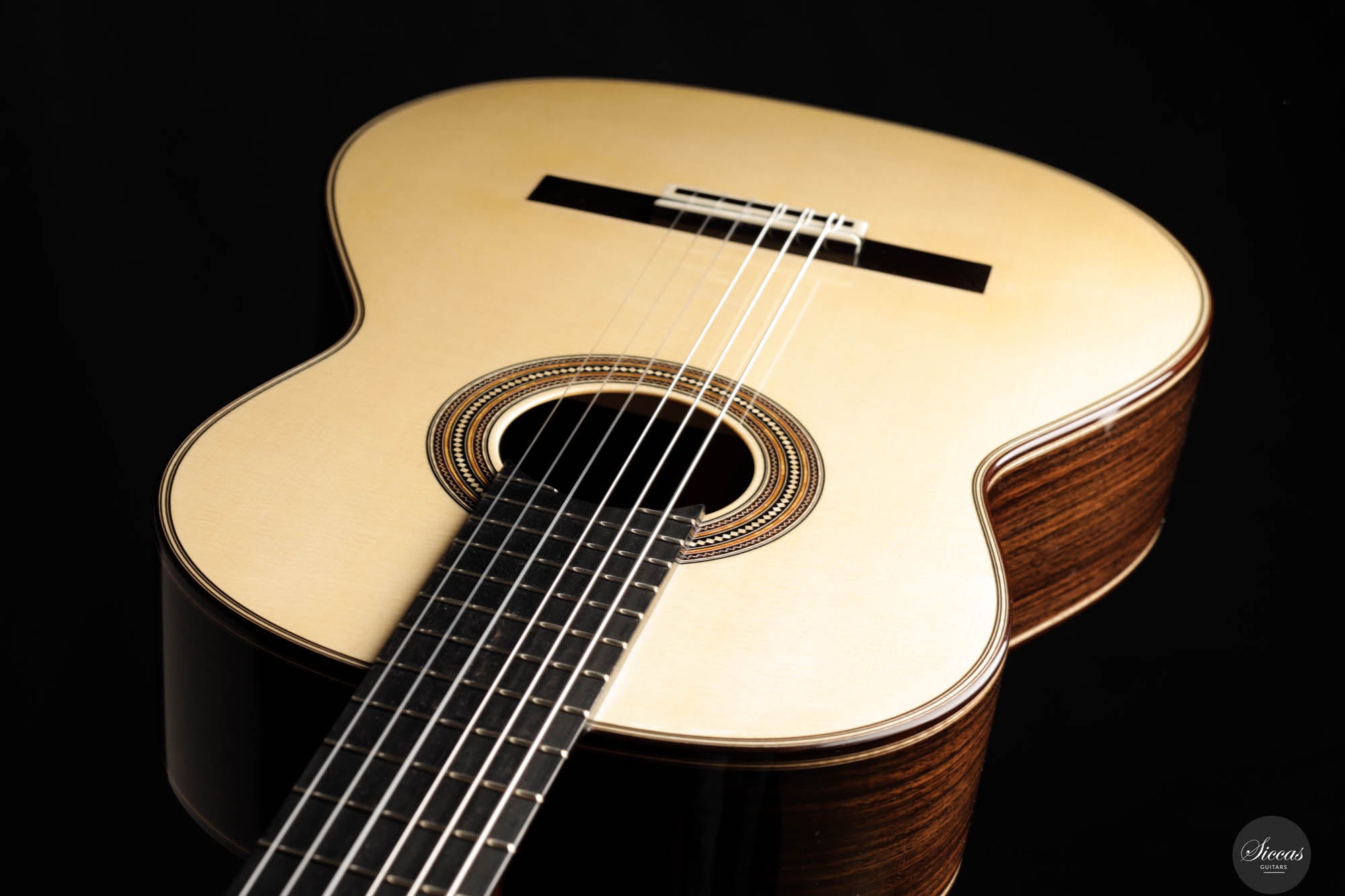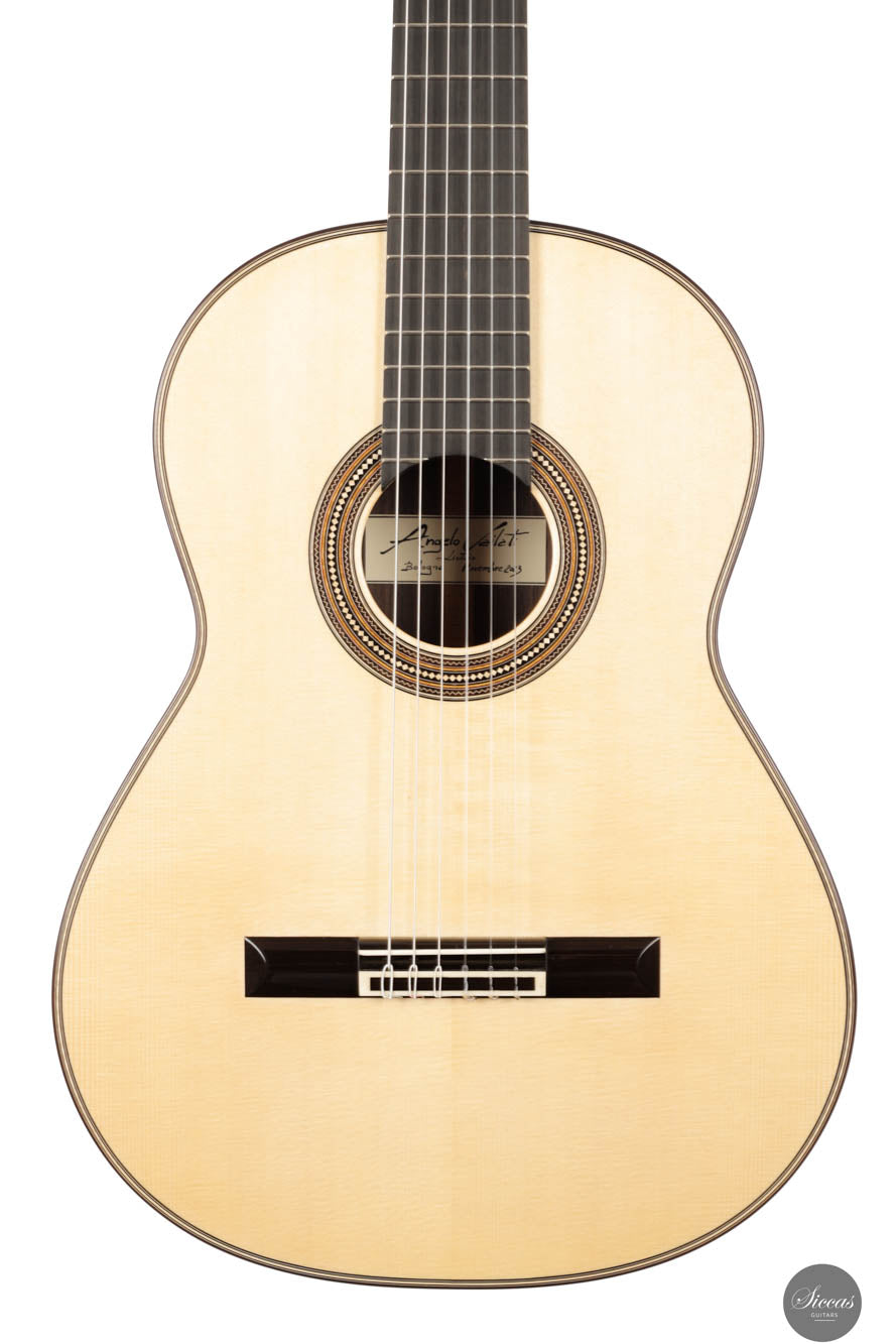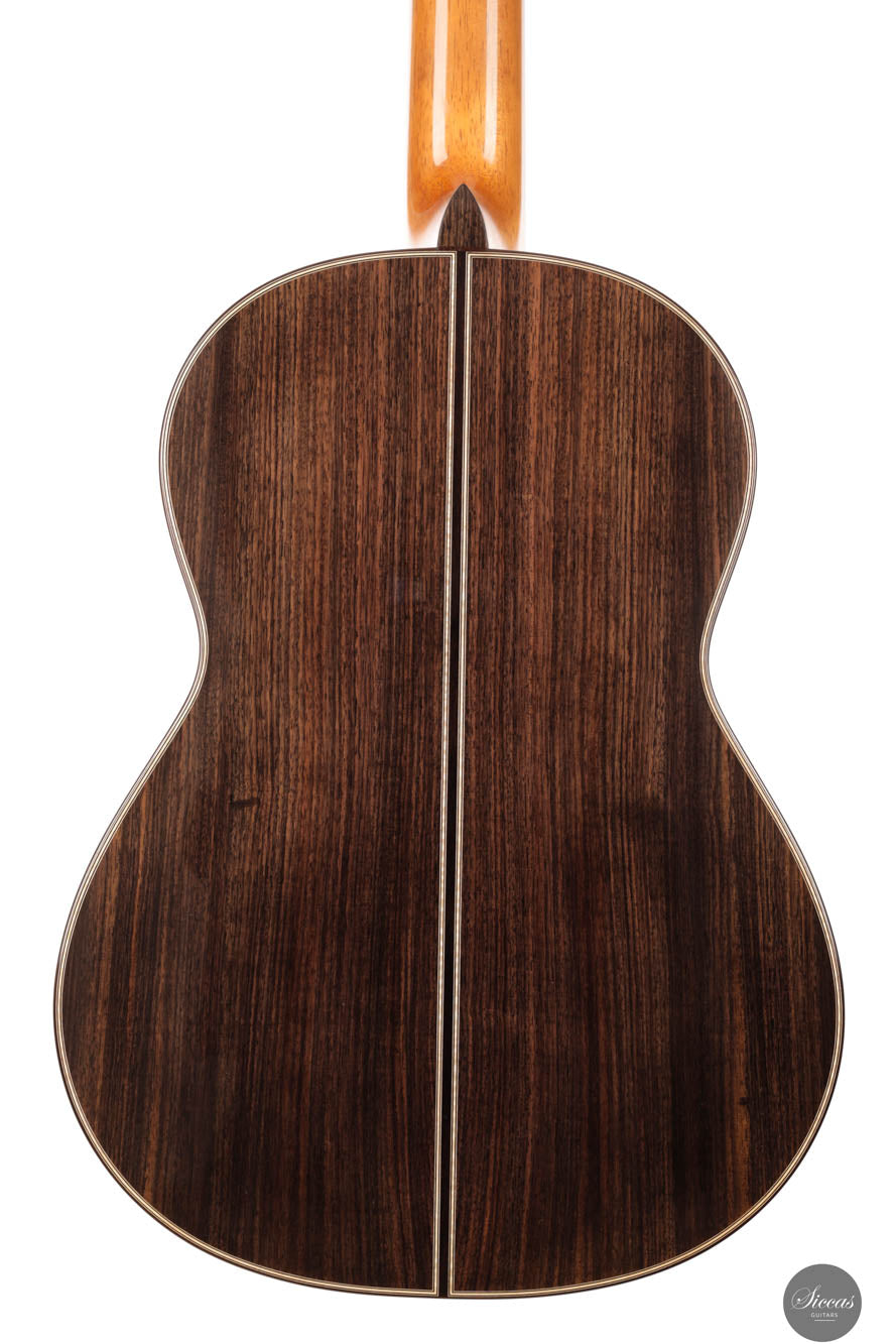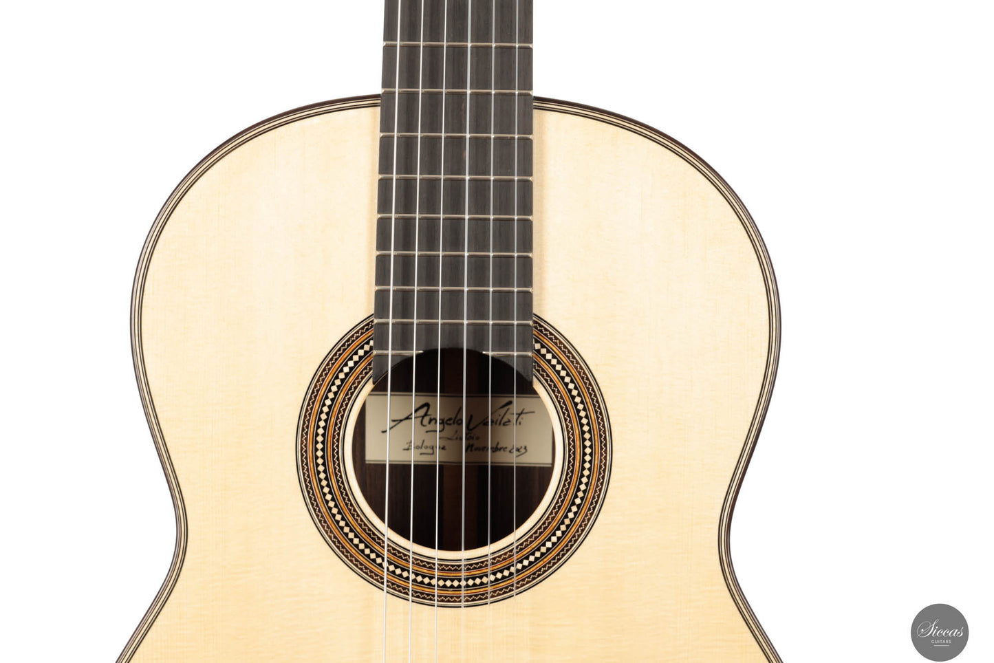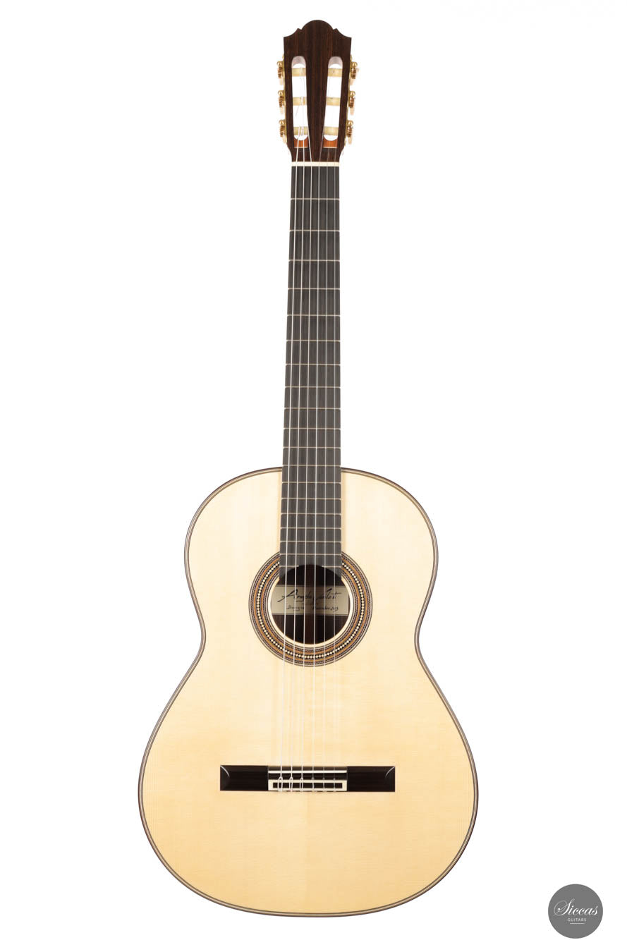 This exceptional guitar, crafted by the renowned Angelo Vailati, stands as a paragon of traditional luthiery, executed with remarkable precision and meticulous attention to detail. Vailati's reputation for creating instruments of the highest caliber is fully embodied in this guitar. It features a spruce soundboard, a classic choice known for its bright and clear tonal qualities, which harmonizes beautifully with the Indian rosewood used for the back and sides. This combination of woods not only enhances the guitar's resonant properties but also contributes to its aesthetic appeal. The instrument is further elevated by the inclusion of premium Alessi tuners, renowned for their precision and reliability, which complement the guitar's overall design and functionality.