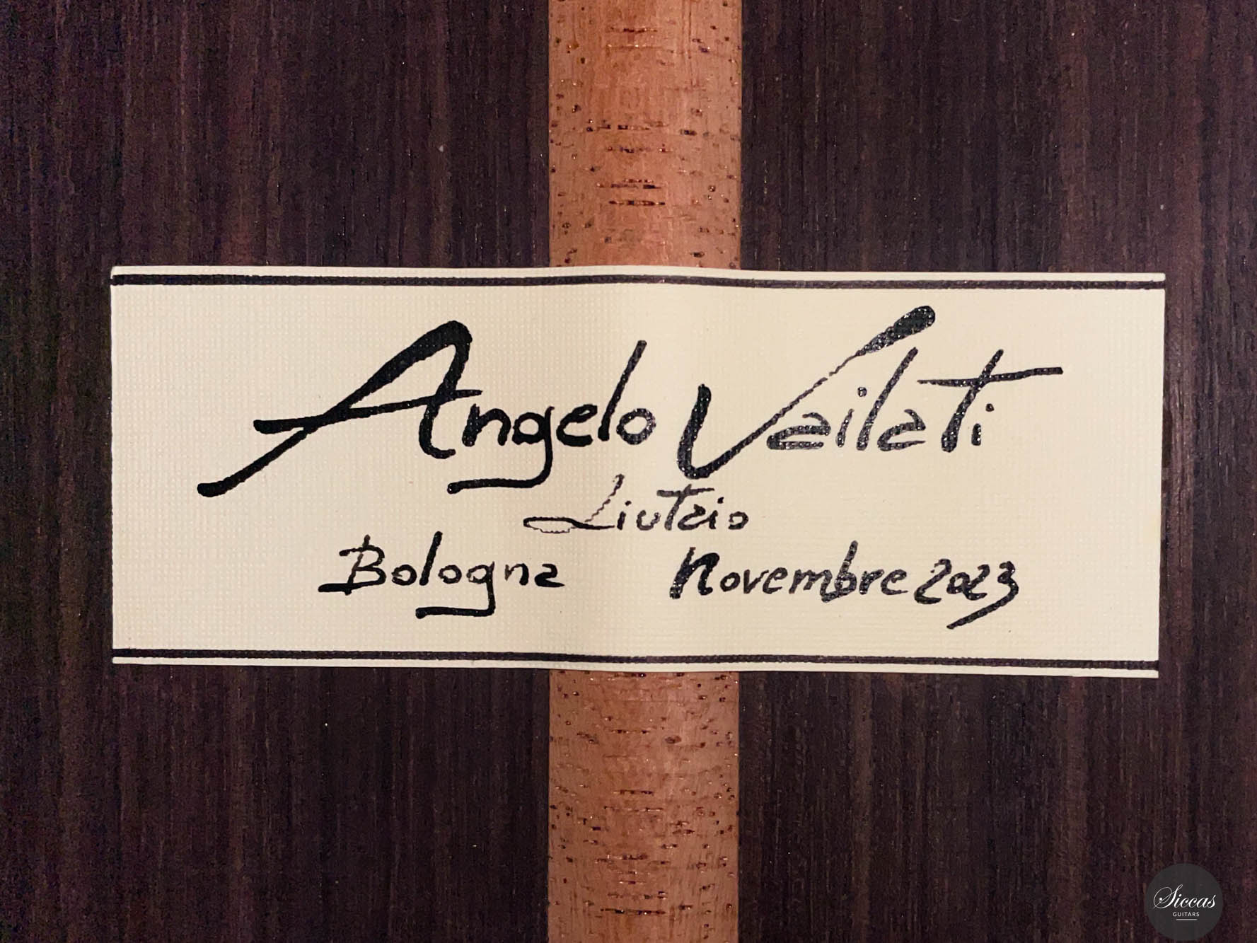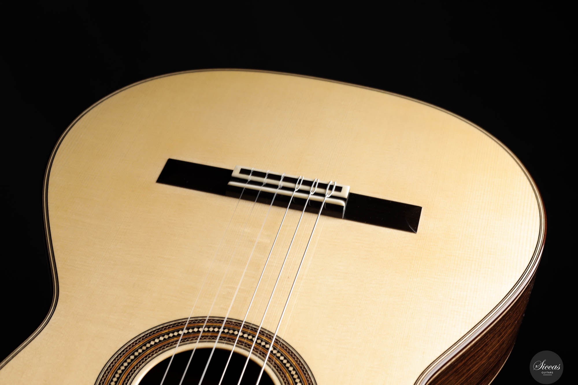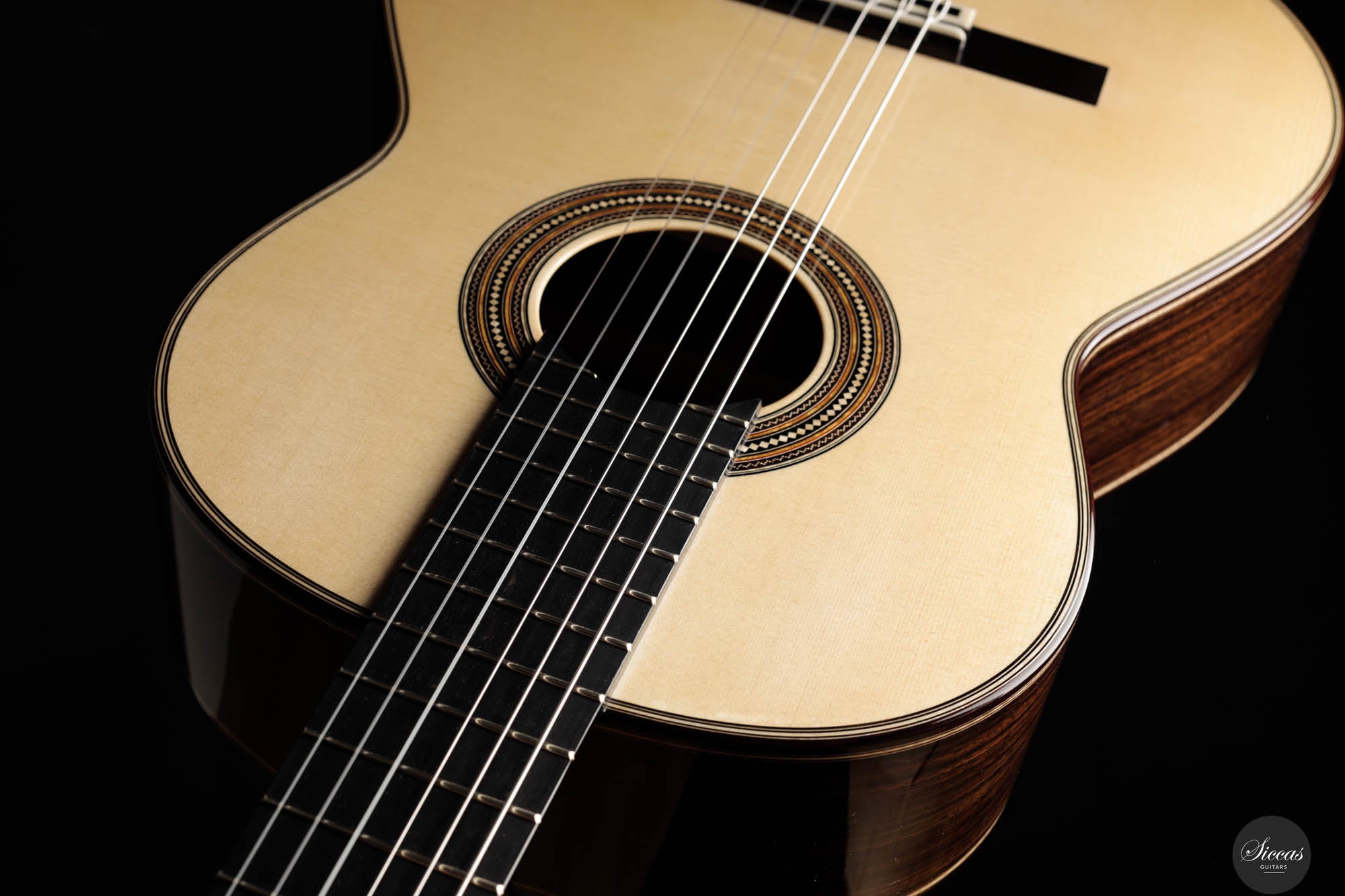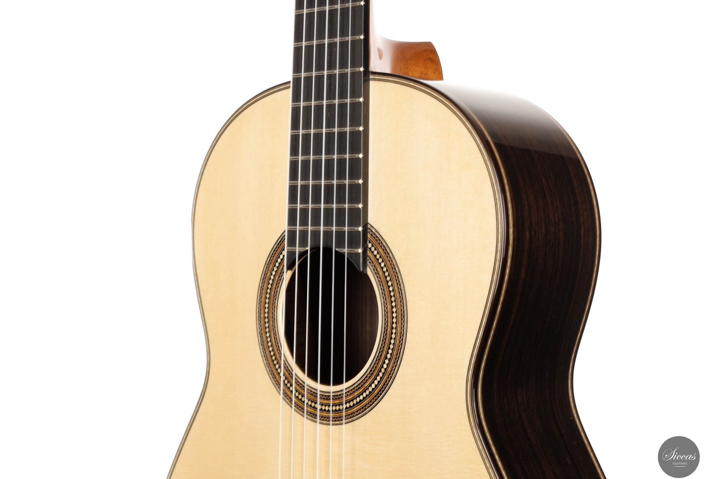 This exceptional guitar, crafted by the renowned Angelo Vailati, stands as a paragon of traditional luthiery, executed with remarkable precision and meticulous attention to detail. Vailati's reputation for creating instruments of the highest caliber is fully embodied in this guitar. It features a spruce soundboard, a classic choice known for its bright and clear tonal qualities, which harmonizes beautifully with the Indian rosewood used for the back and sides. This combination of woods not only enhances the guitar's resonant properties but also contributes to its aesthetic appeal. The instrument is further elevated by the inclusion of premium Alessi tuners, renowned for their precision and reliability, which complement the guitar's overall design and functionality.