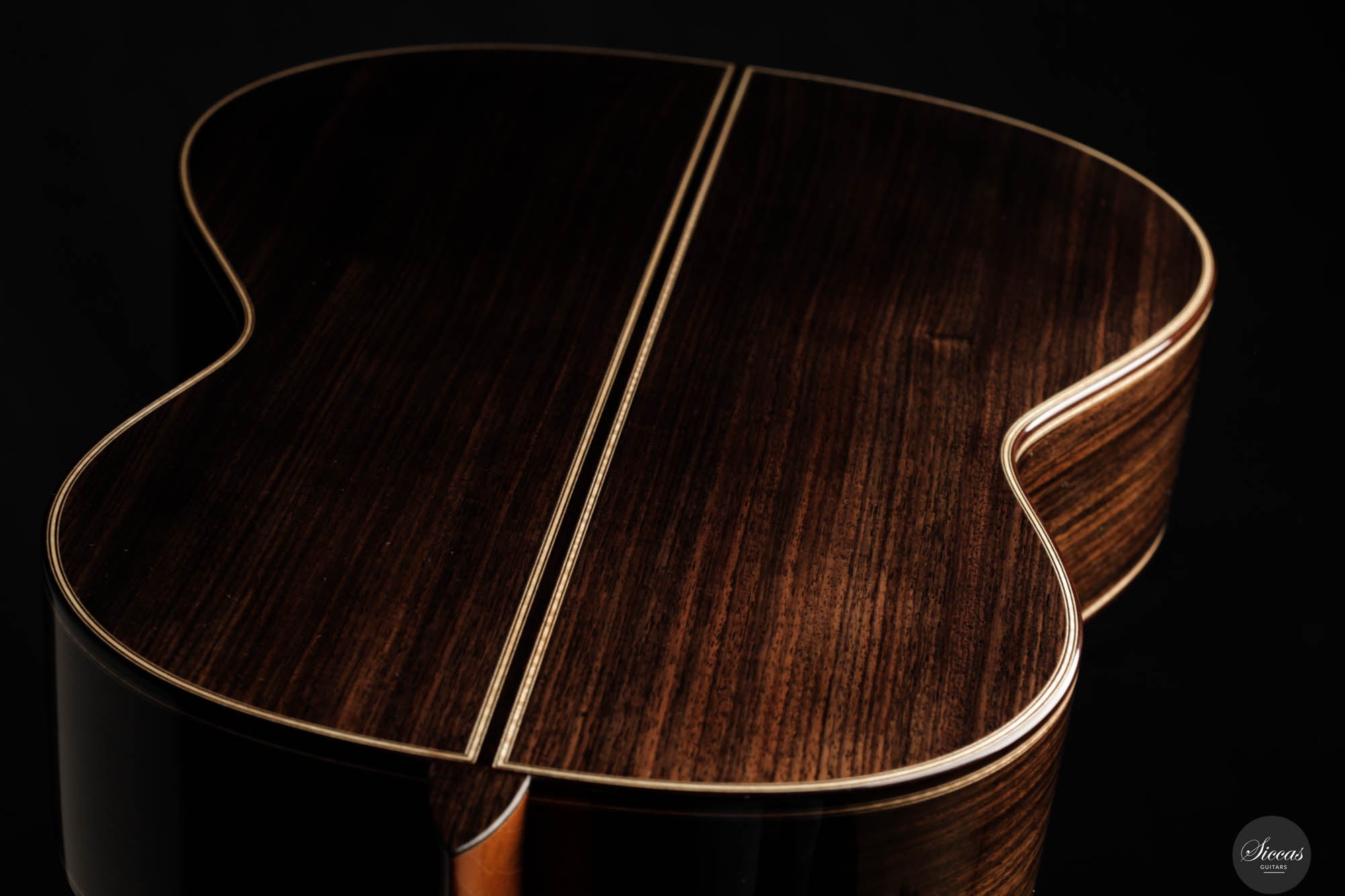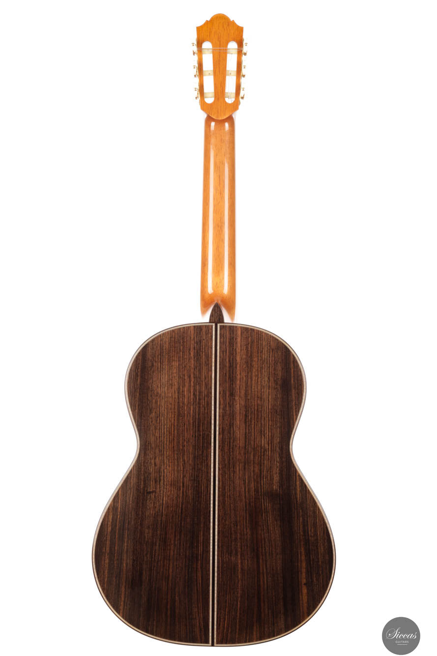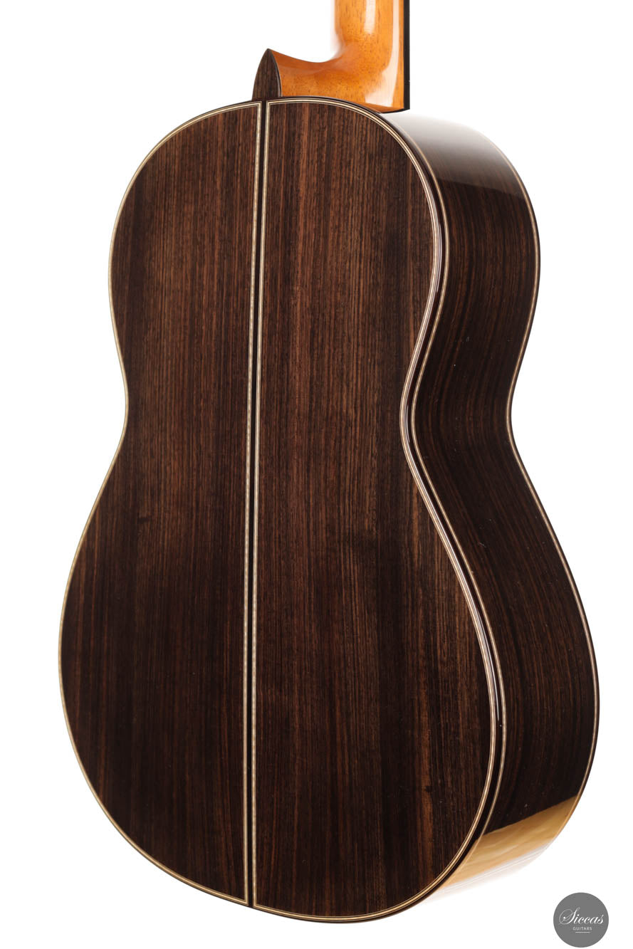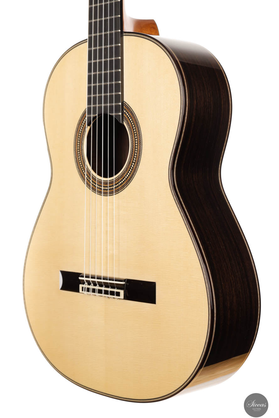 The guitar's finish, fully French polished, adds to its elegance, giving it a lustrous sheen that accentuates its natural beauty. This finish also plays a role in the guitar's sound, allowing the wood to resonate freely and produce a rich, full-bodied tone. The playability of this instrument is exceptional, offering a comfortable and intuitive experience for the guitarist. It produces very organic sounds, a characteristic that makes it highly sought after among players who value natural tonal qualities and dynamic responsiveness.