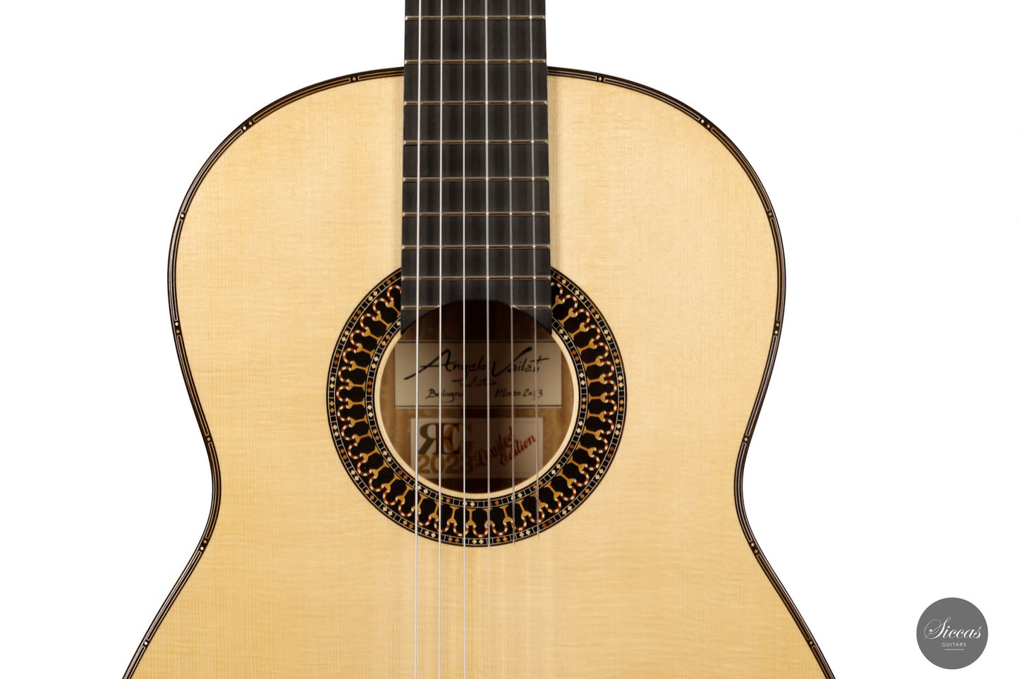This 2023 Roma Guitar Expo Special Edition Angelo Vailati Guitar is the pinnacle of guitar craftsmanship. This remarkable instrument, standing out amidst the guitar pantheon, is a tribute to the iconic work of Jose L. Romanillos. Painstakingly handcrafted by Angelo Vailati using the finest wood selection at his disposal, it represents an exquisite fusion of artistry and sound engineering.