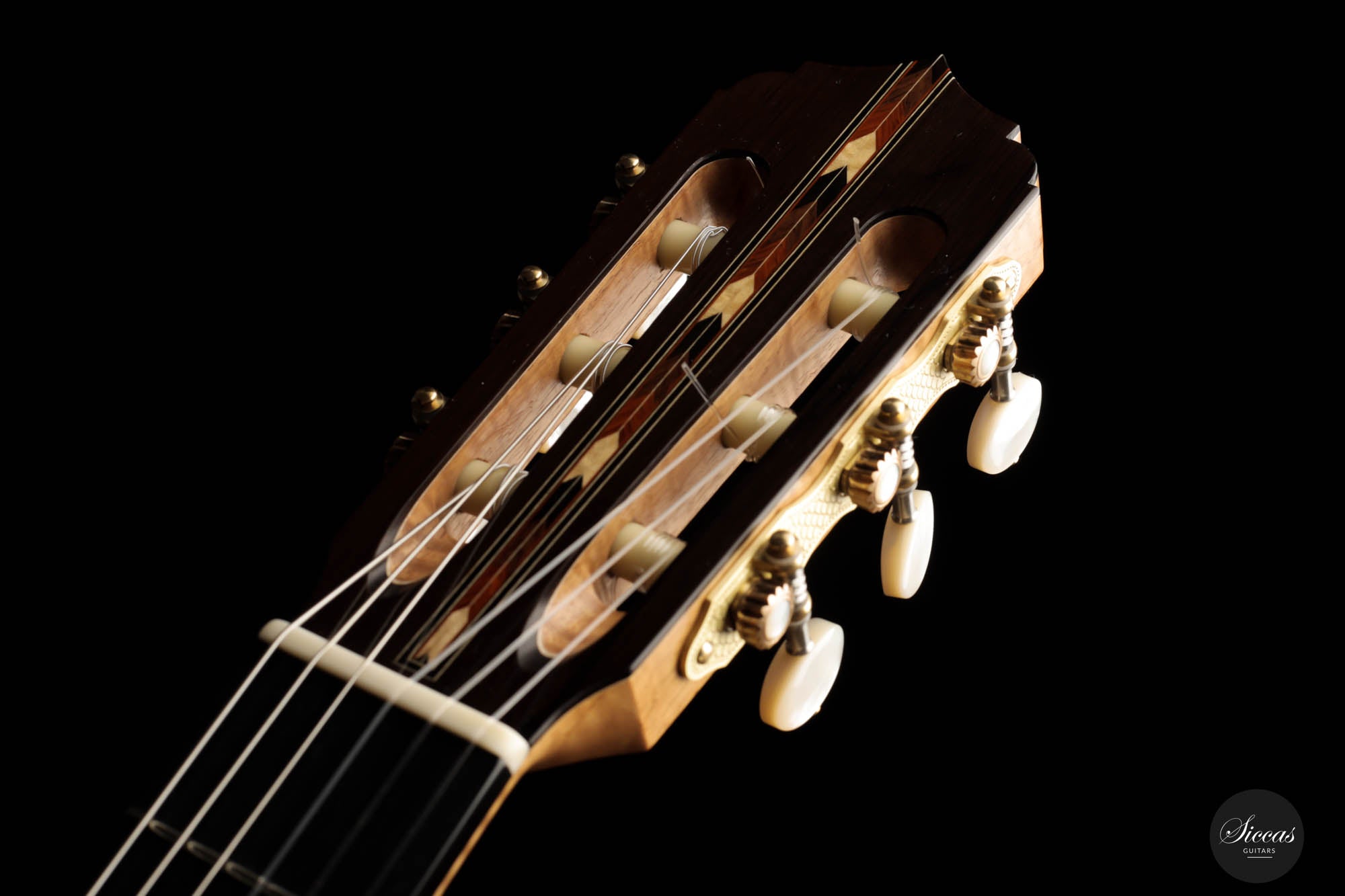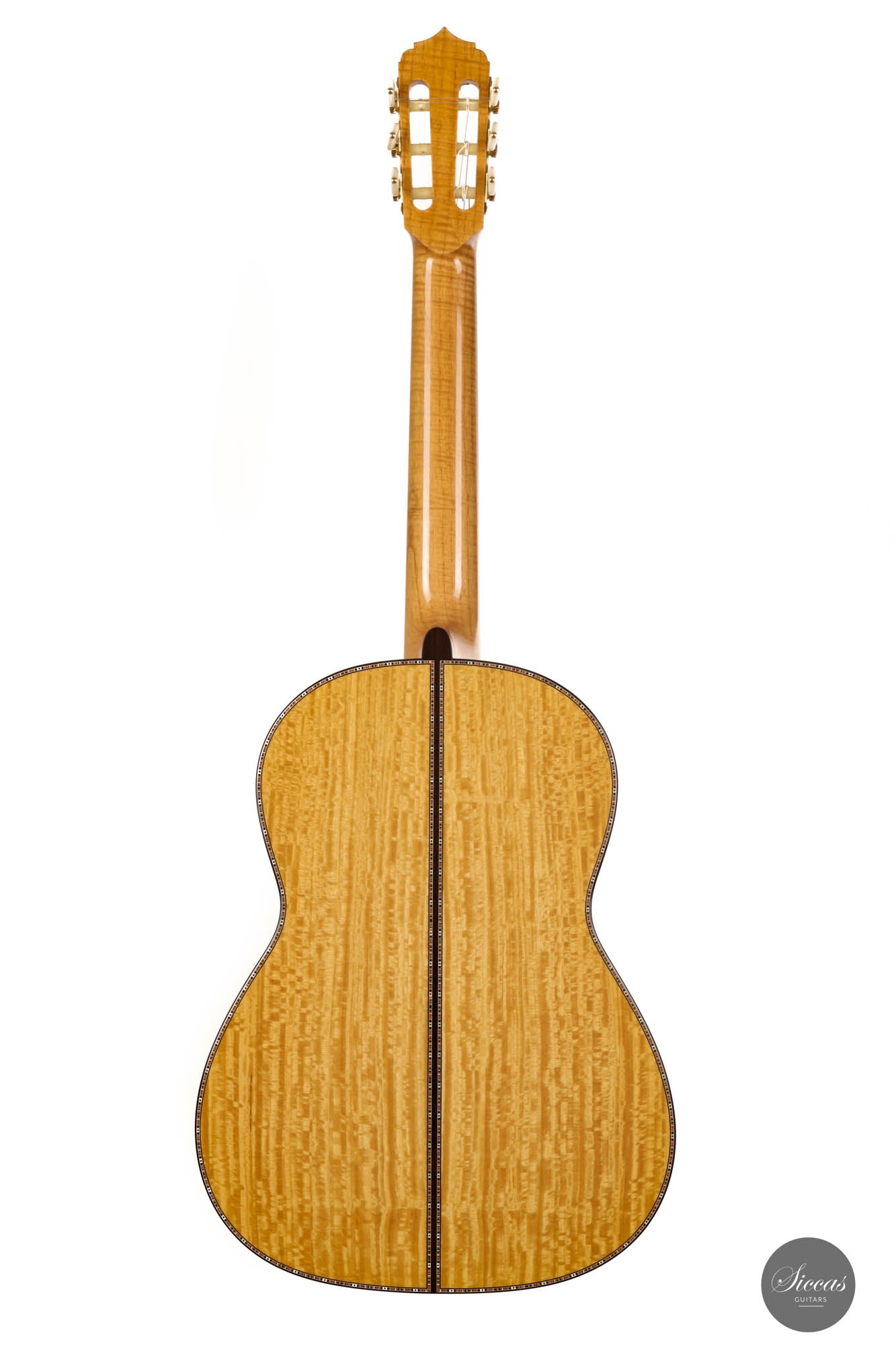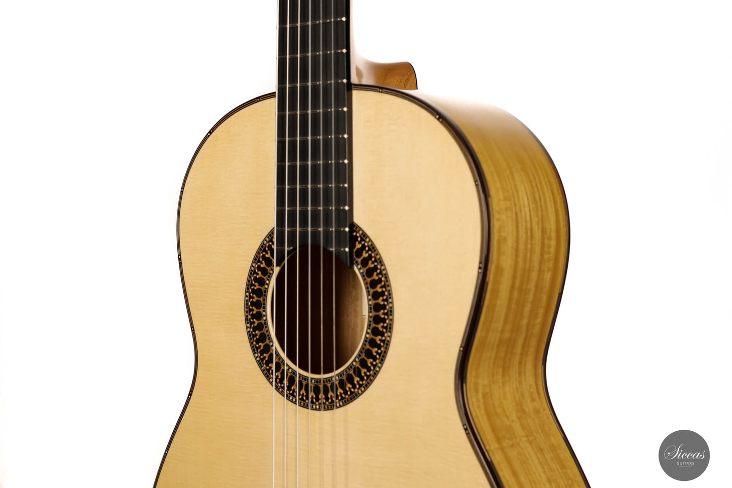 Unravel the unique characteristics of this guitar; a resonant Austrian spruce soundboard, striking Satinwood back, and sides, plus an enchanting flamed cedar neck. Its intricate headstock decoration takes inspiration from the 2005 Jose L. Romanillos masterpiece, "La Amistad". Adding a touch of opulence, the golden satinwood back is adorned with a replica of the Romanillos "La Adelita 1997" design.