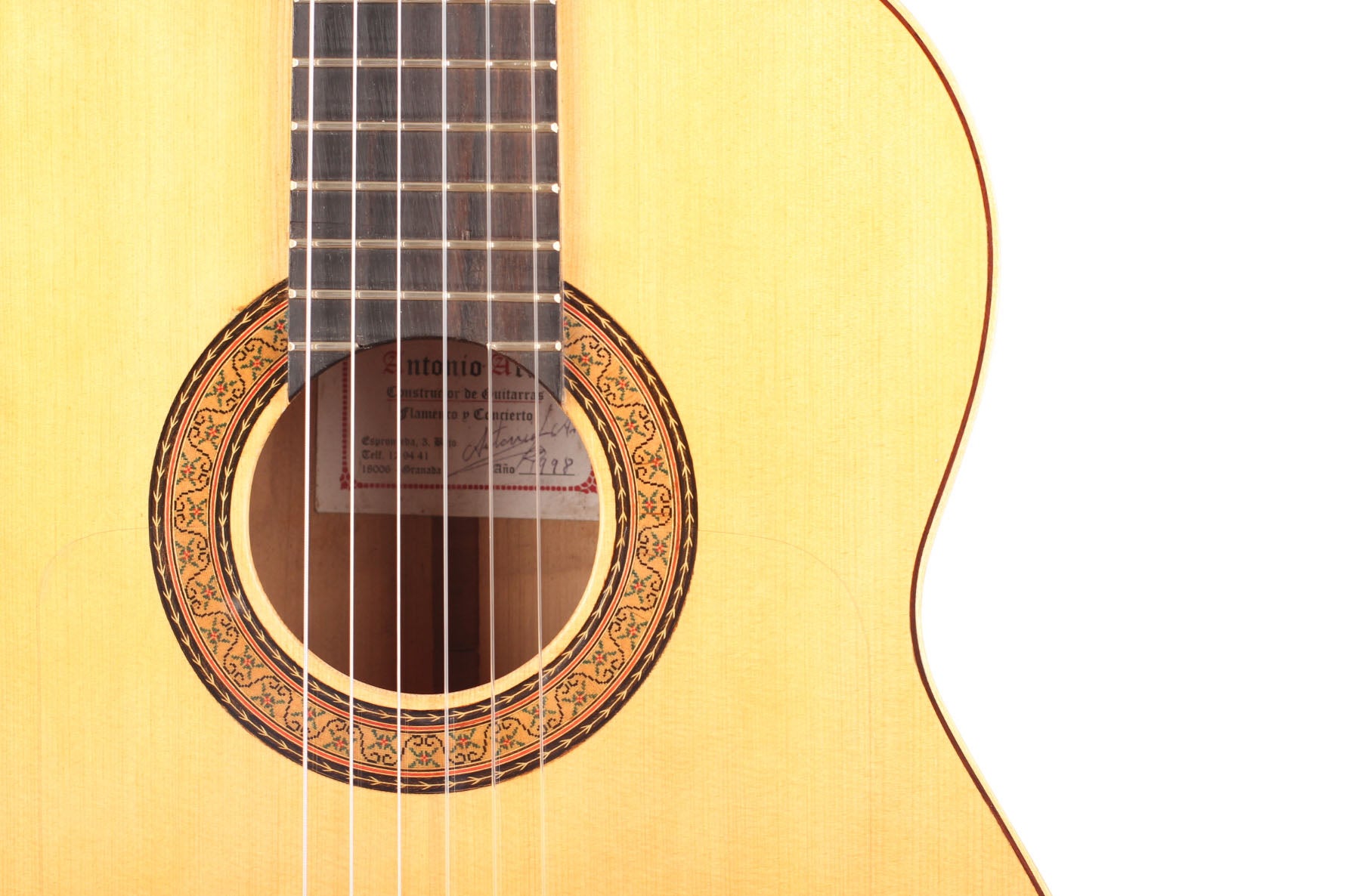 This flamenco guitar was made by the granadinian luthier Antonio Ariza in 1998. The top is made of excellent spruce, back and sides are made of finest cypress wood. The condition of this guitar is excellent and completely original, without any cracks or repairs. All French polished. Including hardshell case.
