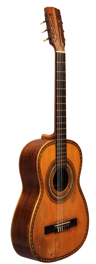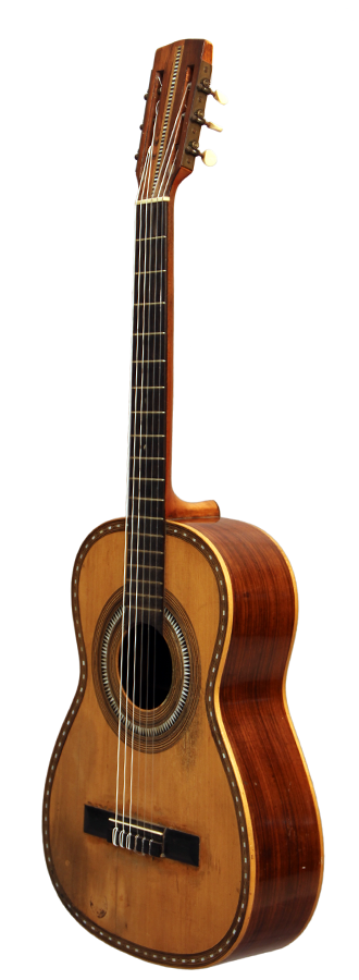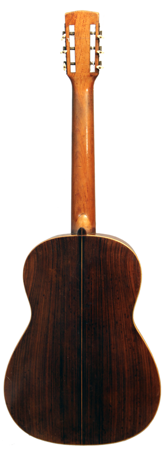 The top of the guitar consists of spruce wood and is decorated with a frame of mother of pearl inlays. The relatively big rosette almost reaches the top’s edge and is framed by several dark brown inlays. In the middle section of the rosette triangular inlays of mother of pearl are arranged in a way that reminds of a shining sun. The head is also decorated with mother of pearl and has a modern tuning system. The back is made of two pieces and consists of rosewood like the ribs as well.