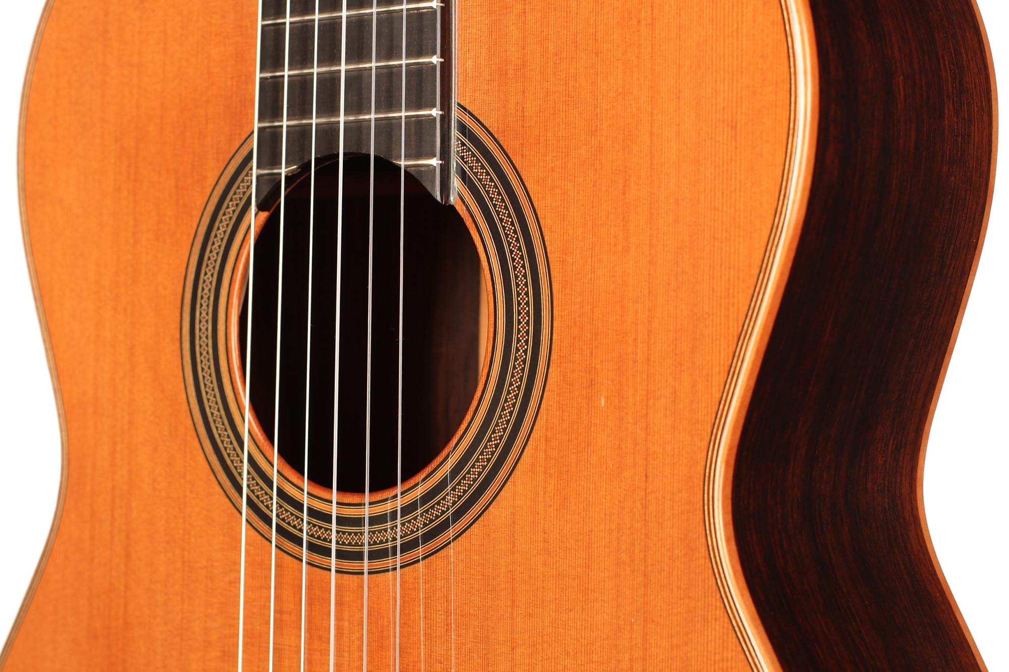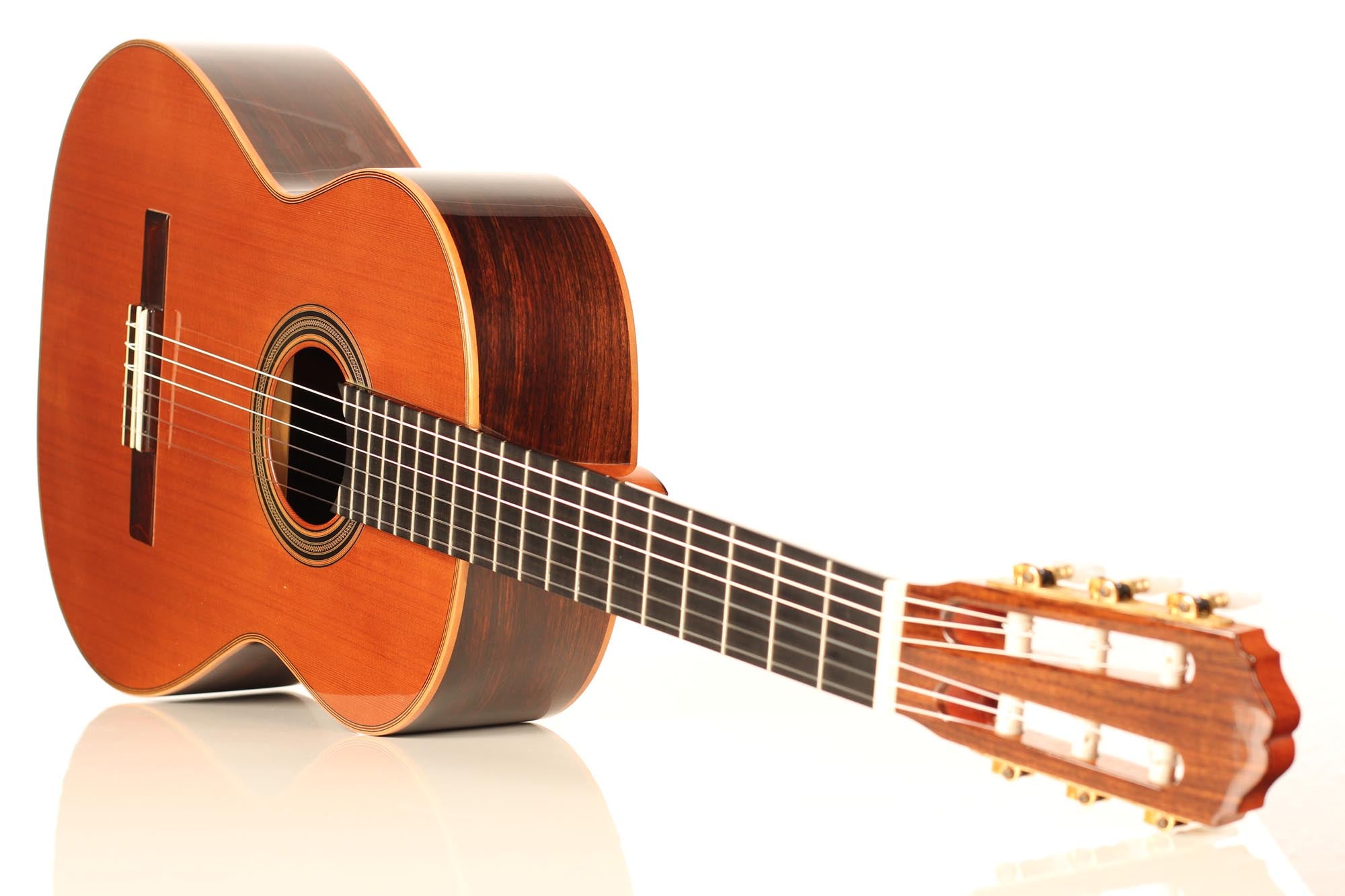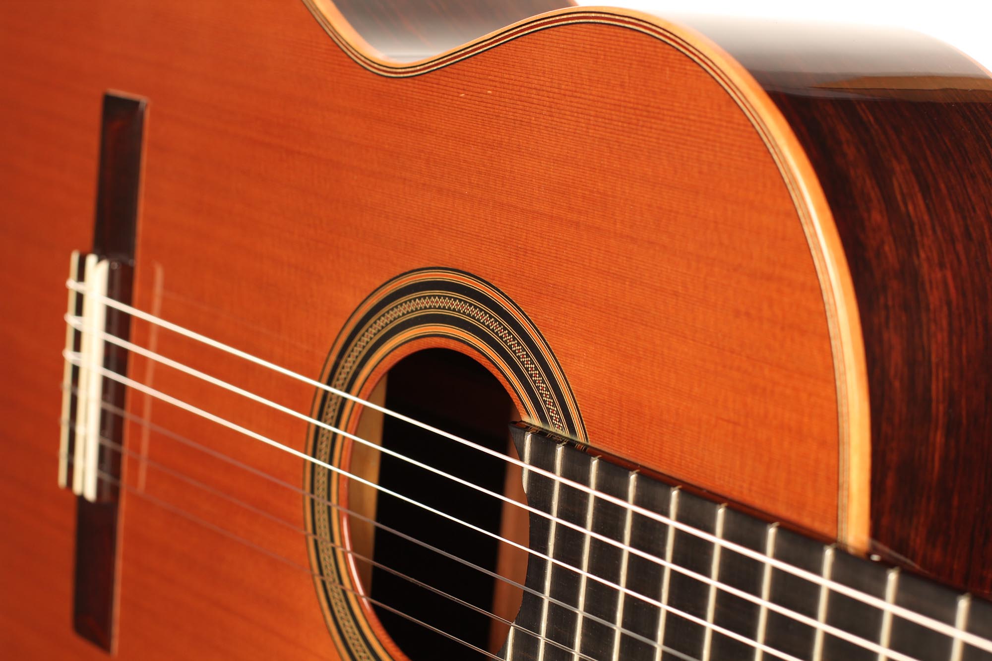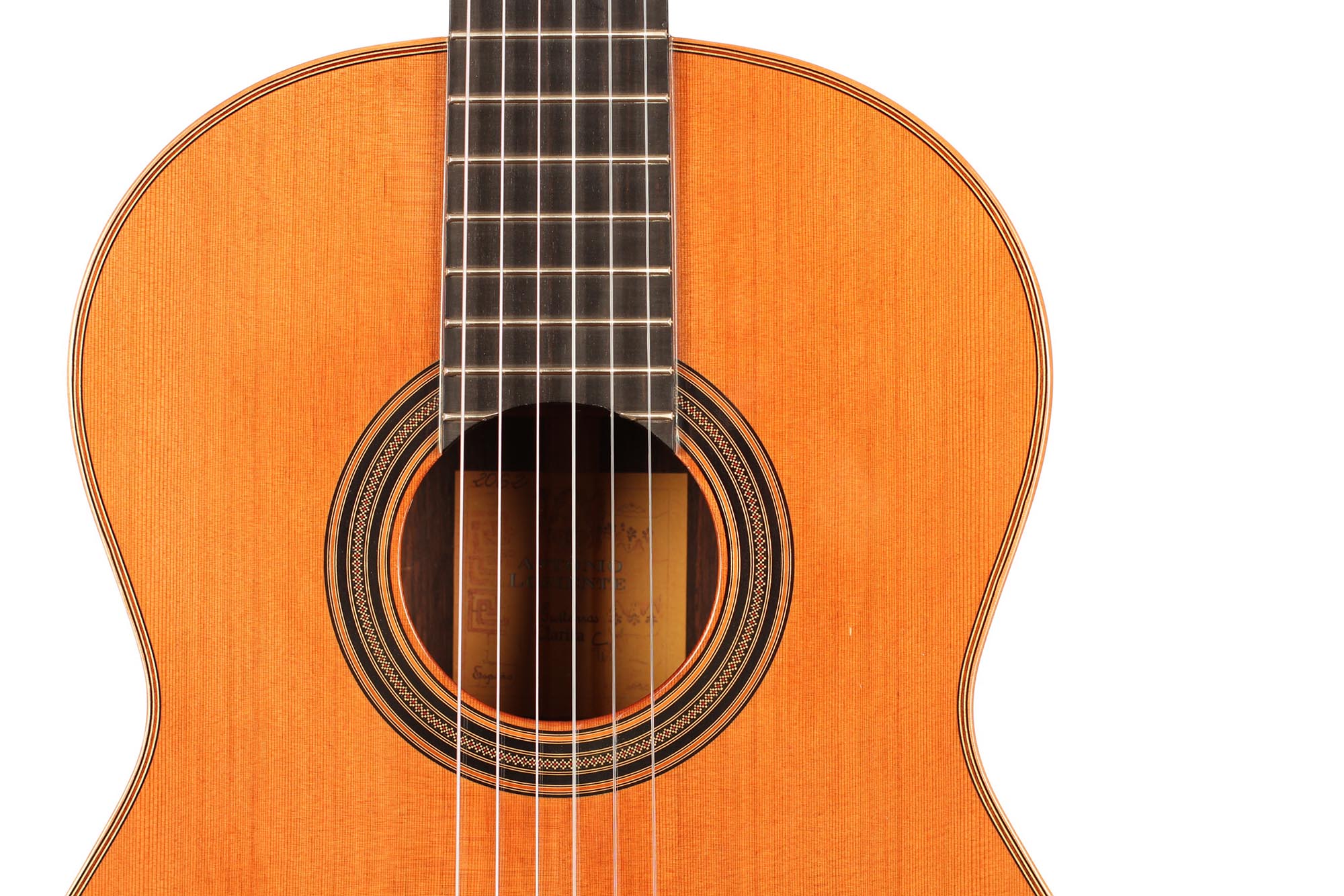 The Clarita model by Antonio Loriente is excellent value for money. It is a very well-built cedar top guitar with a fine rosette, top quality woods and a gorgeous sound. The warm deep basses combine with well-rounded trebles to give an optimal instrument for concert and recording in this price range.