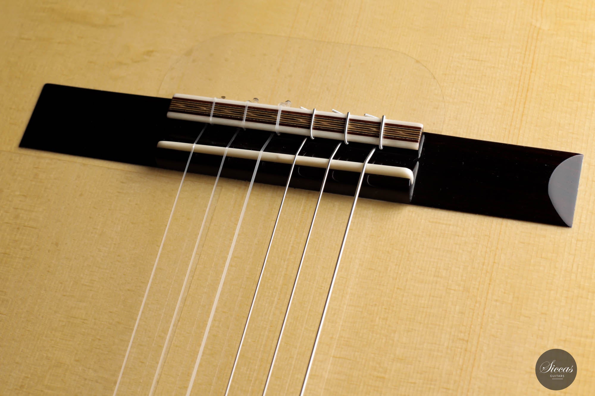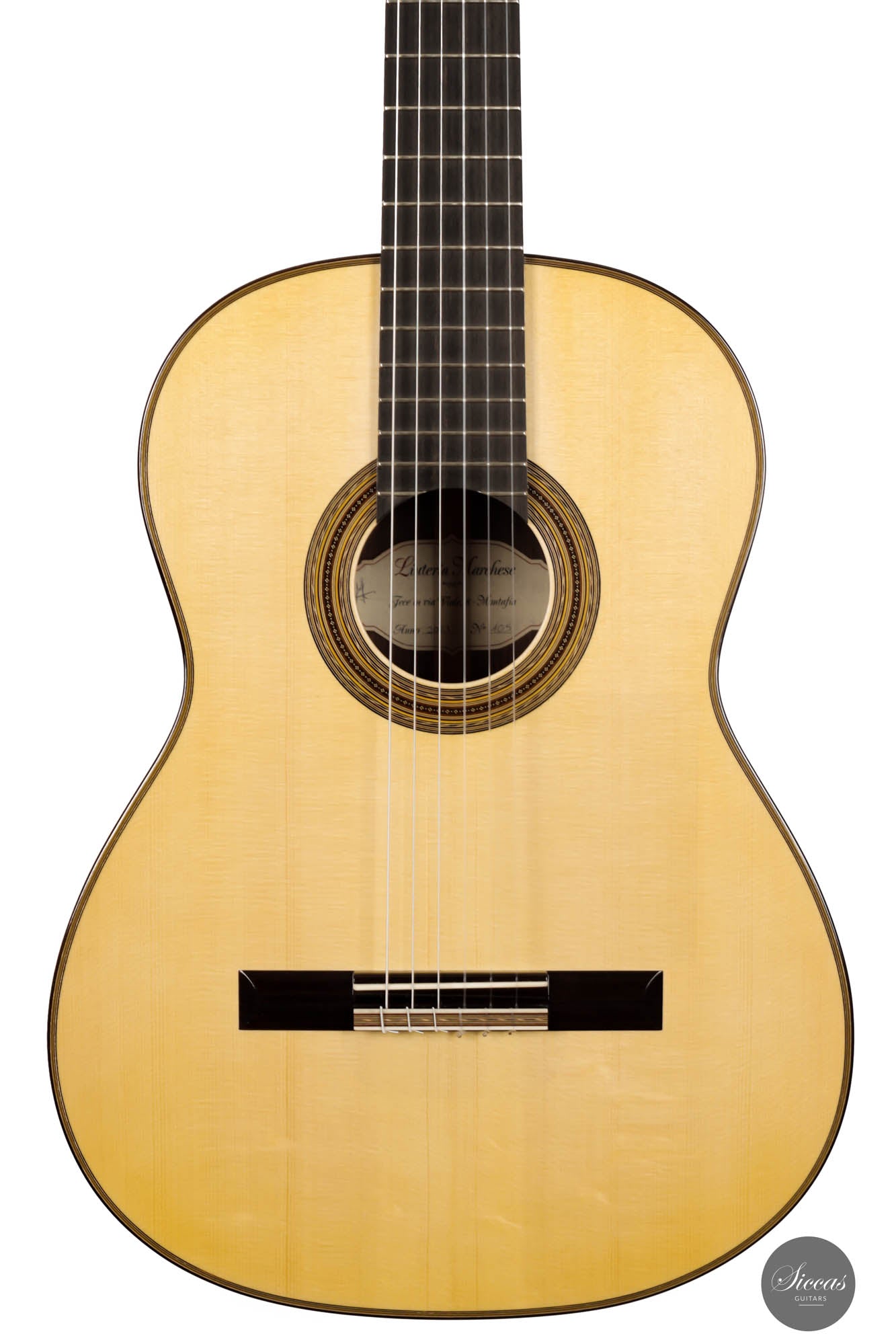 The 2023 Antonio Marchese Guitar No. 105 is a testimony to superior craftsmanship and acoustic brilliance. Constructed by the accomplished luthier Antonio Marchese, this guitar reflects an exquisite blend of traditional design and innovative acoustics. Featuring a stunning spruce top coupled with Indian rosewood back and sides, the instrument shines in both aesthetics and tonal quality. One standout attribute of the 2023 Antonio Marchese Guitar no. 105 is its exceptional French polish. Marchese's expertise in this technique is evident in the flawless finish, adding to the visual allure of the instrument. This meticulous detailing truly speaks volumes about Marchese's commitment to excellence and his mastery of the craft. Built on a traditional 7 fan brace design, this guitar embodies Marchese's personal vision of the perfect guitar sound. Its main resonance is in the F# range, resulting in deep, dark bass tones that beautifully complement the very singing and melodious trebles. This balance provides an enriching and expressive sound palette, offering guitarists a versatile instrument for various playing situations. In summary, the 2023 Antonio Marchese Guitar no. 105 exemplifies top-tier luthiery, marrying stunning visuals with superior sound quality. Its intricate design and remarkable acoustics make it an ideal choice for discerning guitarists, further cementing Antonio Marchese's status as a leading figure in guitar-making.