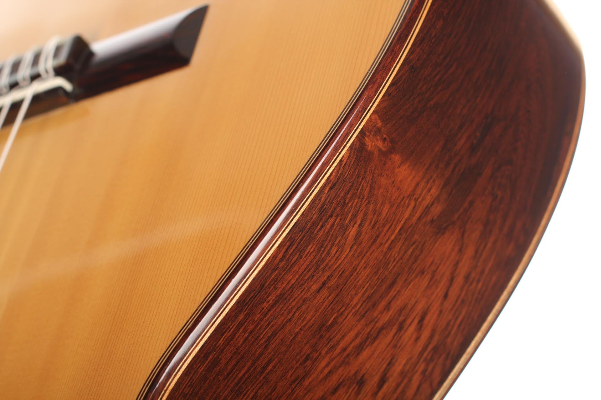 What a beautiful example of Antonio Marin Montero’s work! The guitar is in perfect condition and the 17 years old woods and varnish have now taken a great colour that emphasises the beauty of the fine spruce top and highly figured Amazonas rosewood. This guitar has everything that can be expected from Antonio’s guitars: the sound it straight and generous with immediate response and great sustain. It is a really open-sounding instrument with a rich and complex tone. One of the great qualities of this guitar is how the sympathetic basses resonances reinforce and complete the trebles and vice versa. The tuning machines are made by Fustero. A hardshell case is included.