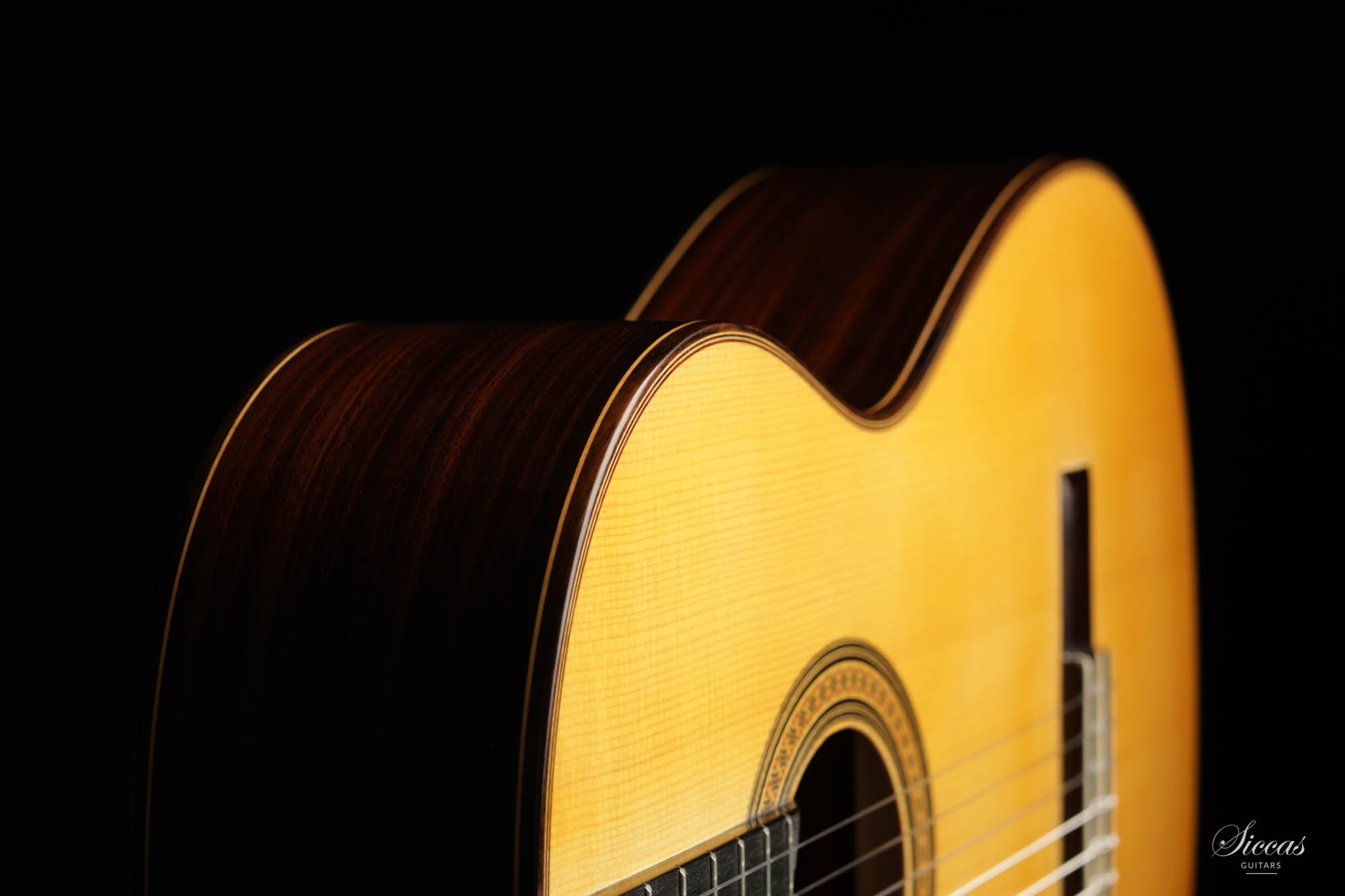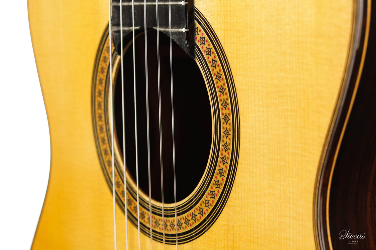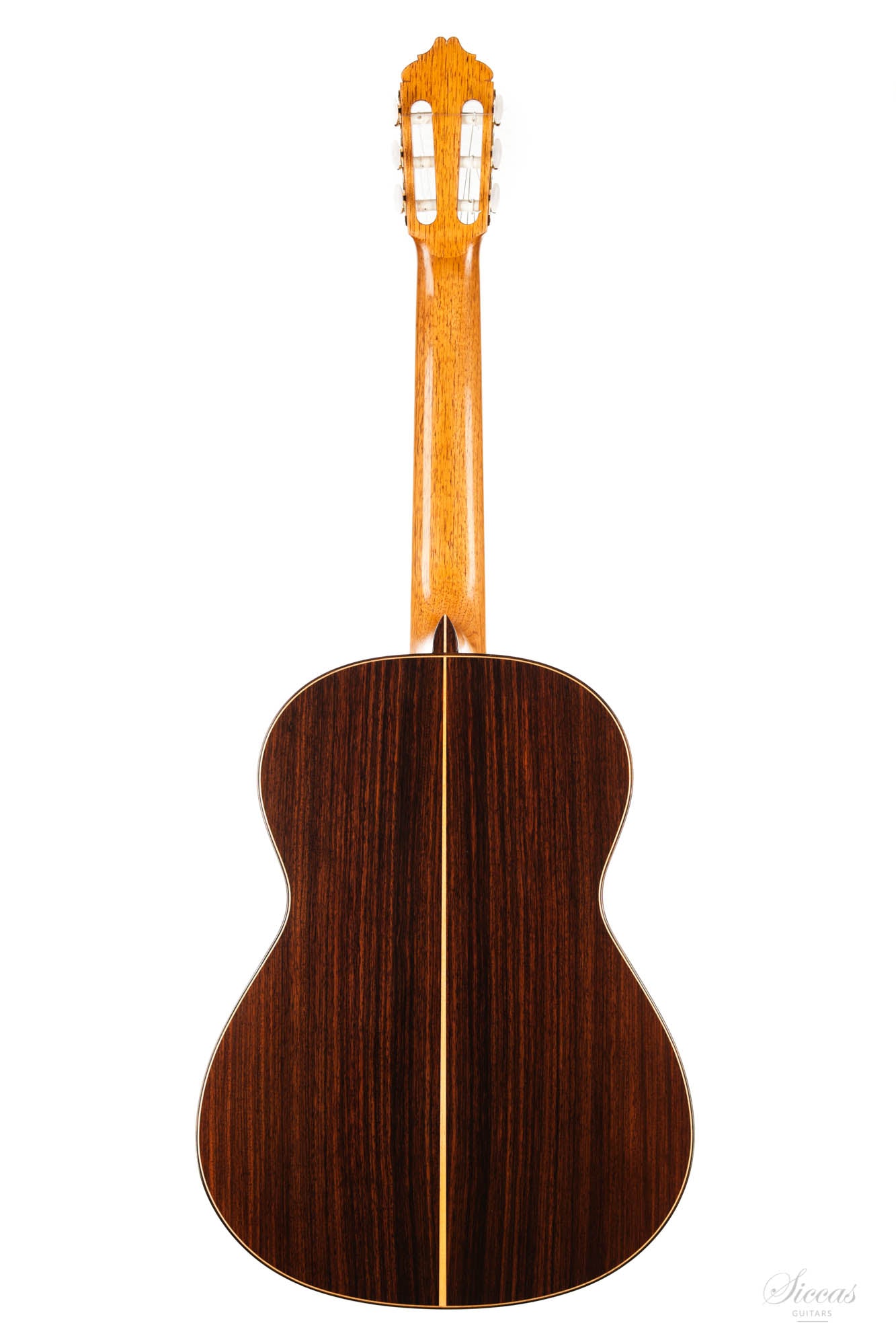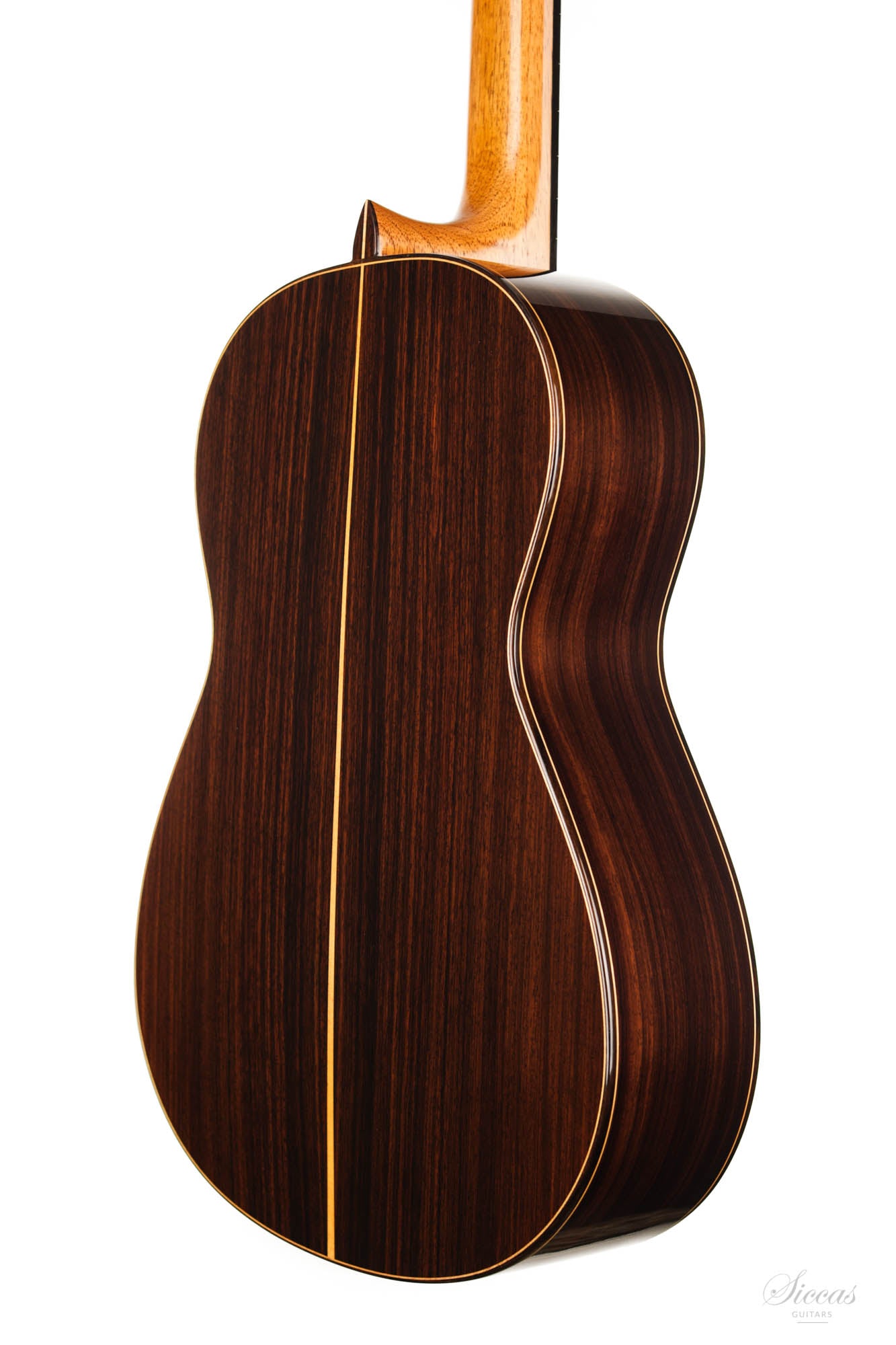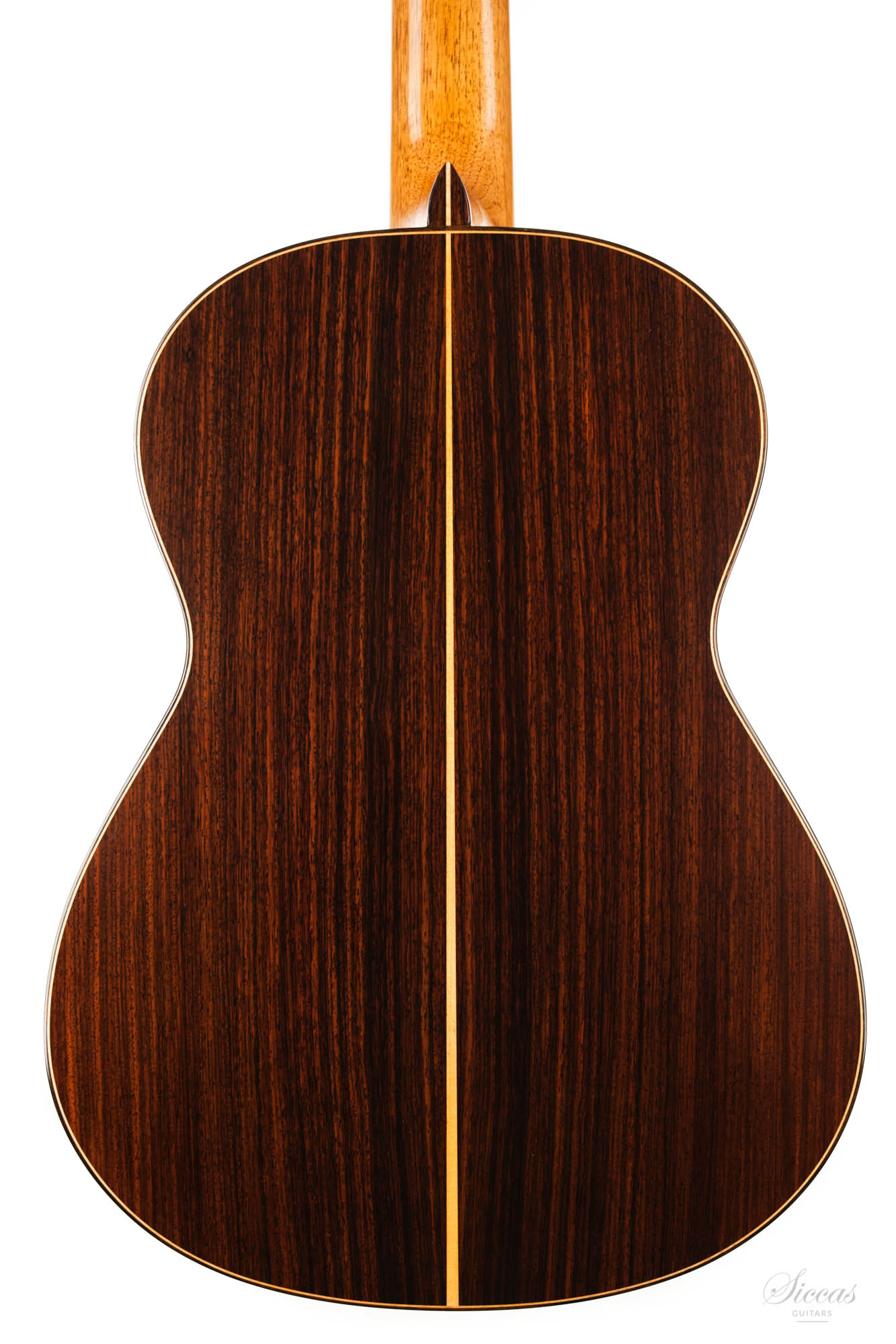This instrument No. 573 from the workshop of Antonio Marin is lightly built and has a typical Spanish response. It has clear, almost percussive trebles with an elegant, singing bass. The condition is very good, as this Marin is completely crack-free and shows only very slight play wear. When inspecting the instrument one can see that it is very well crafted and has an excellent overall appearance. Beautiful and well-executed details can be seen in the rosette and an attractive set of Indian rosewood for back and sides was selected for this Andalusian guitar. If you are looking for the traditional Spanish sound with firm basses and sweet capable trebles, this is the instrument for you.
