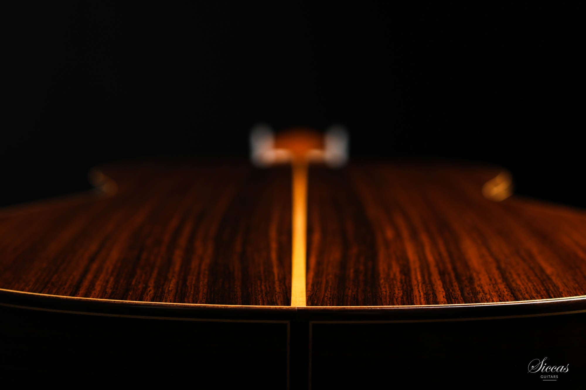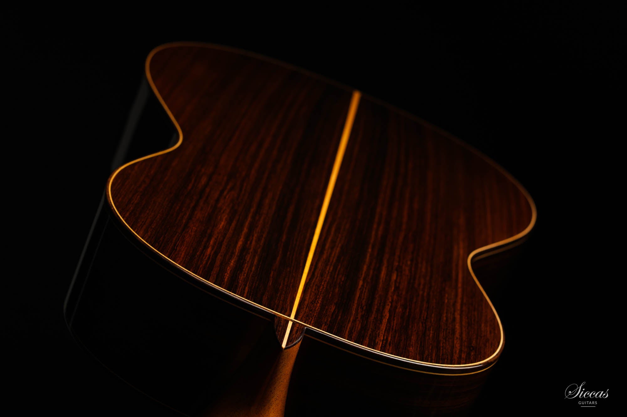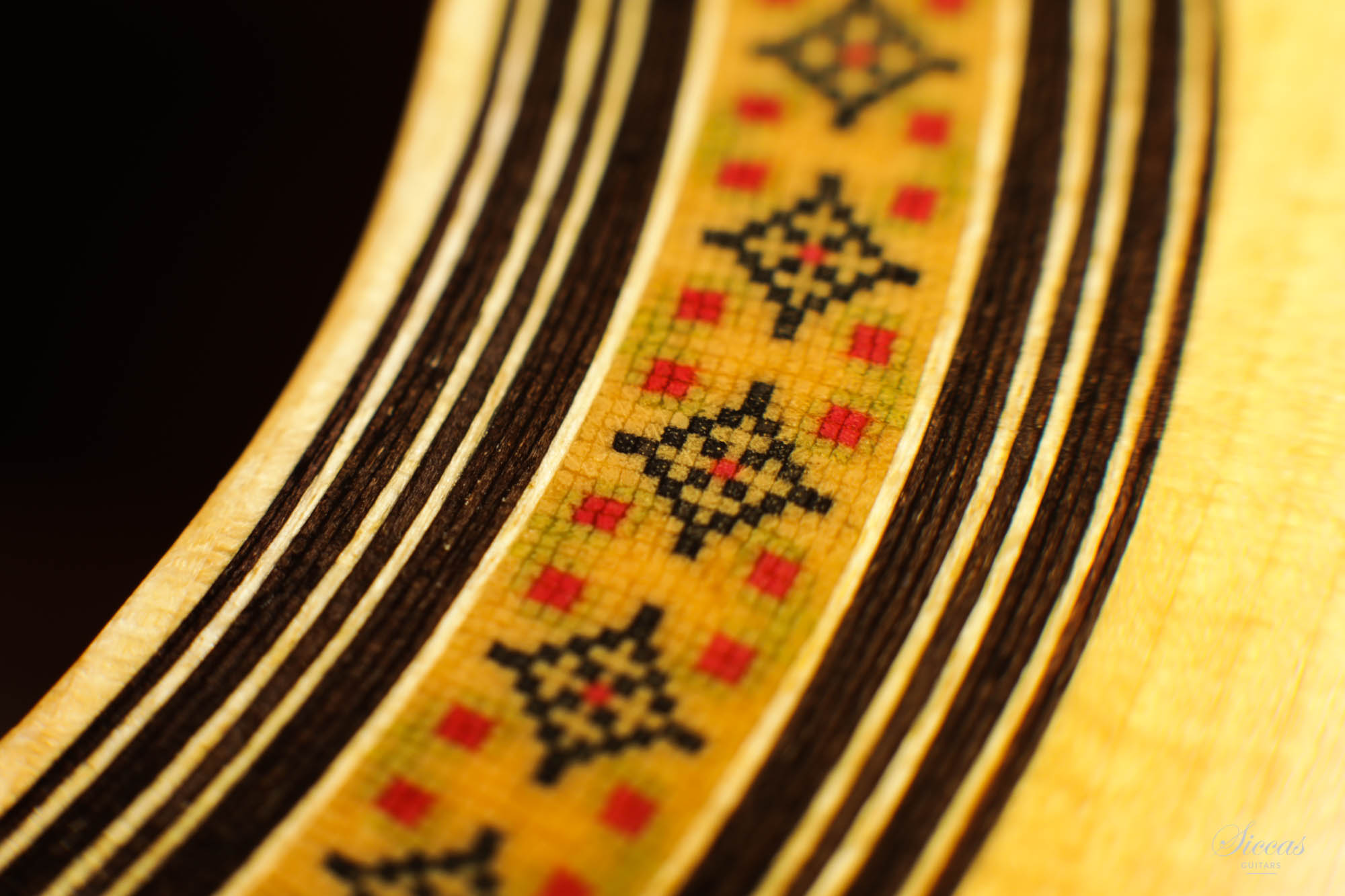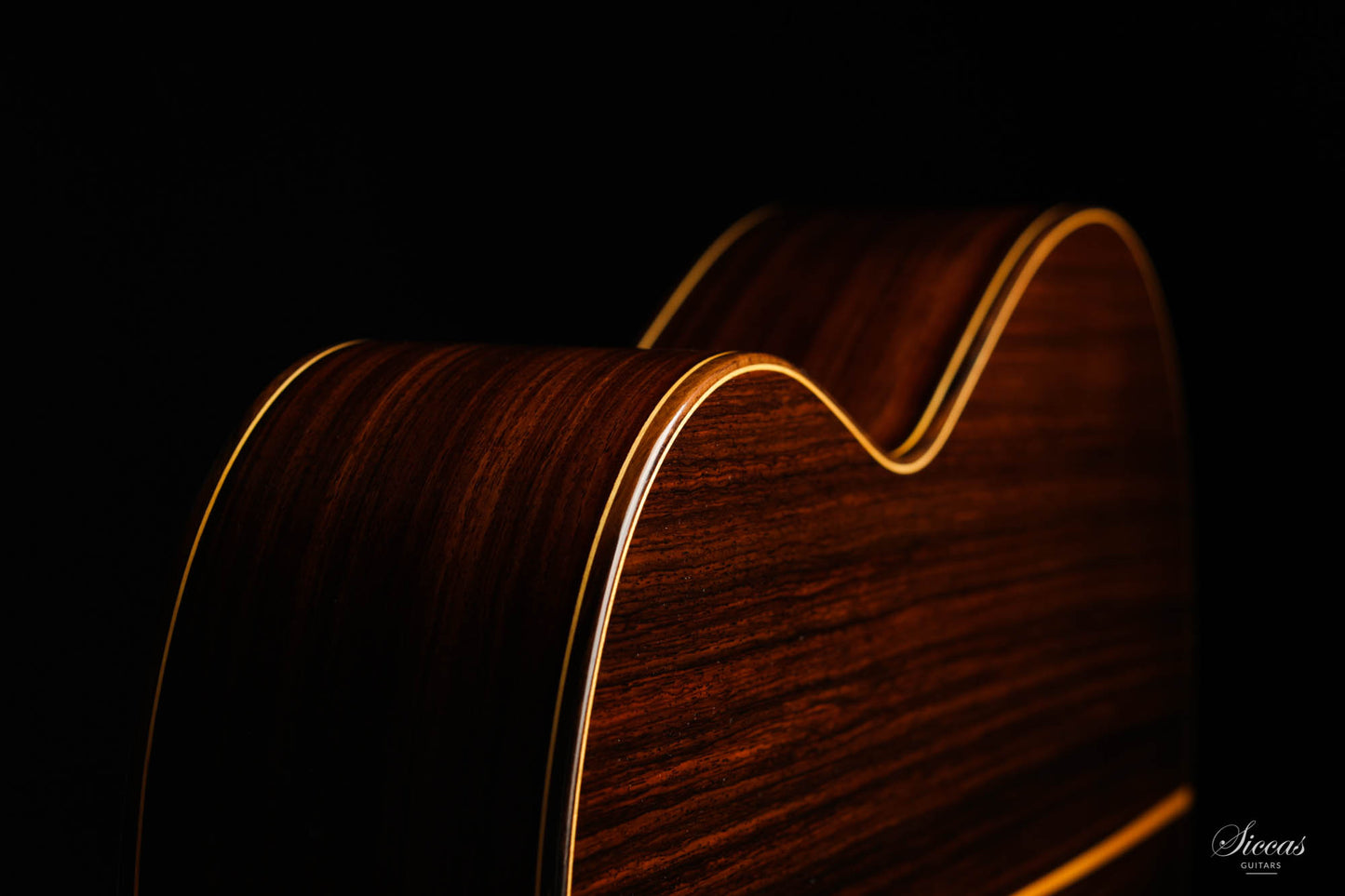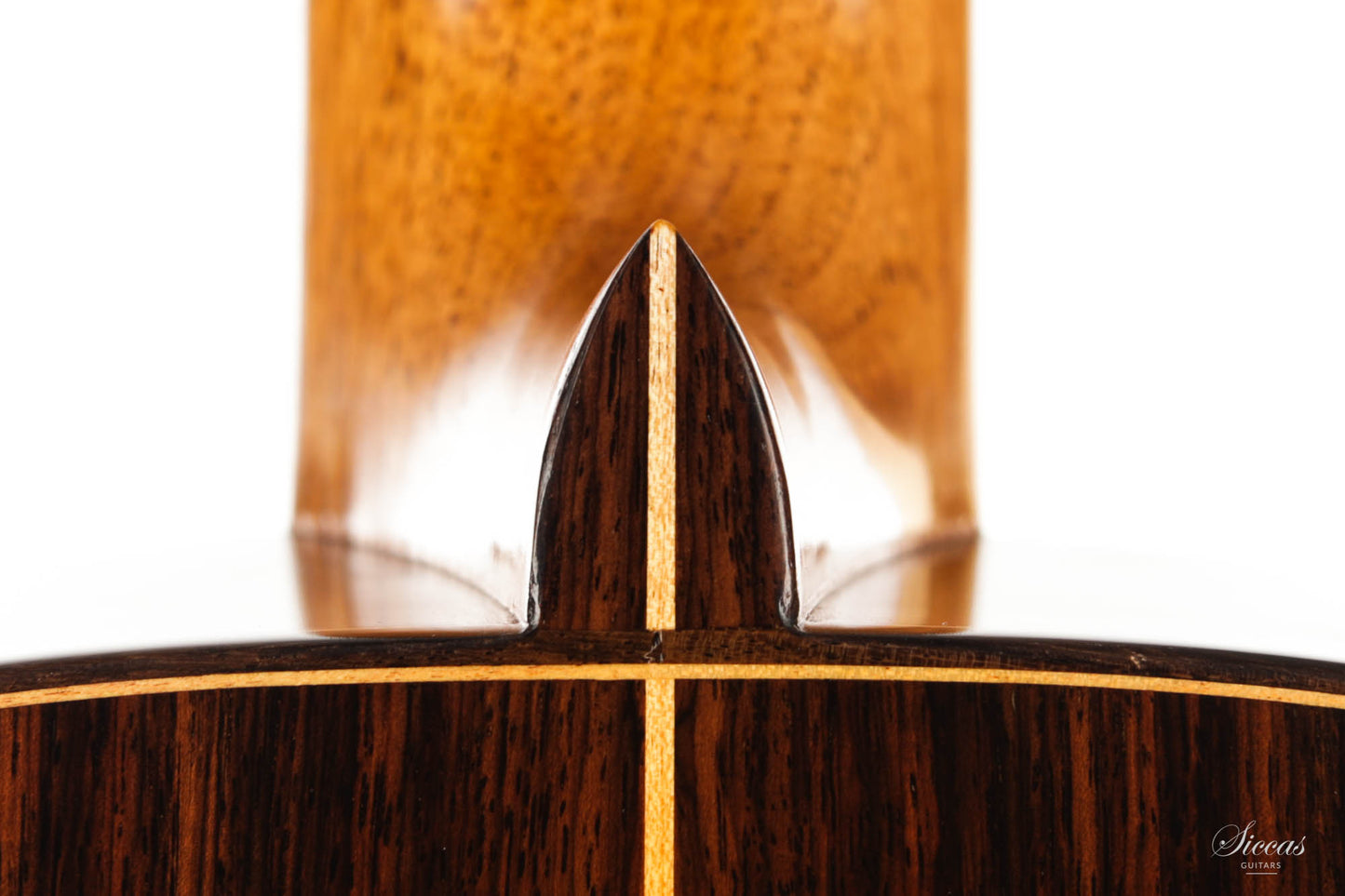 This instrument No. 573 from the workshop of Antonio Marin is lightly built and has a typical Spanish response. It has clear, almost percussive trebles with an elegant, singing bass. The condition is very good, as this Marin is completely crack-free and shows only very slight play wear. When inspecting the instrument one can see that it is very well crafted and has an excellent overall appearance. Beautiful and well-executed details can be seen in the rosette and an attractive set of Indian rosewood for back and sides was selected for this Andalusian guitar. If you are looking for the traditional Spanish sound with firm basses and sweet capable trebles, this is the instrument for you.