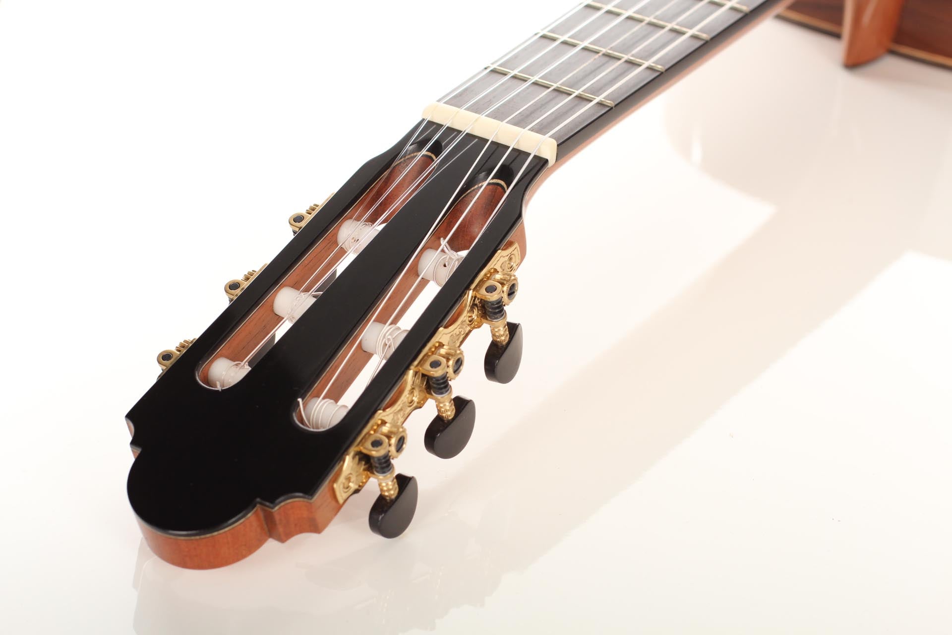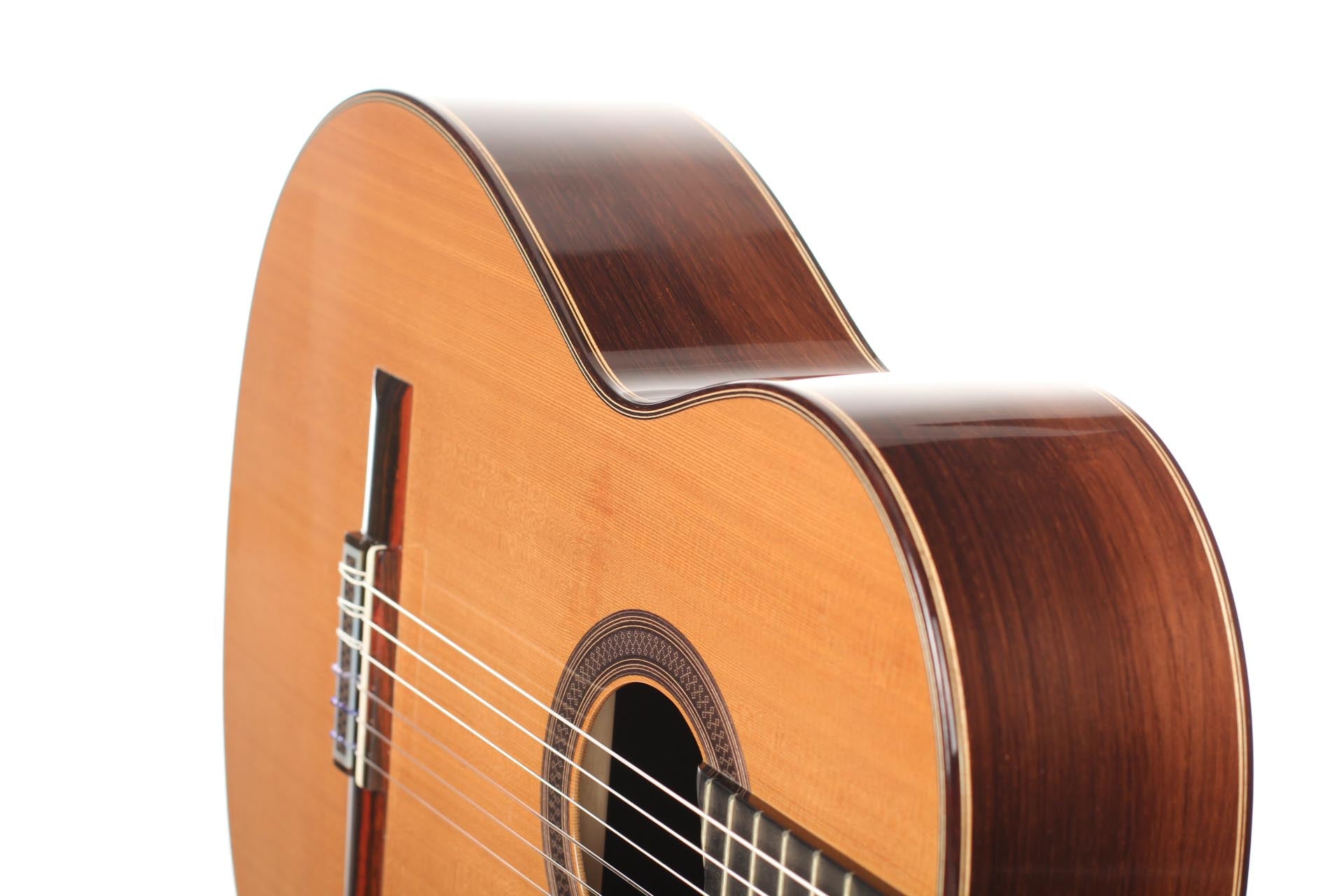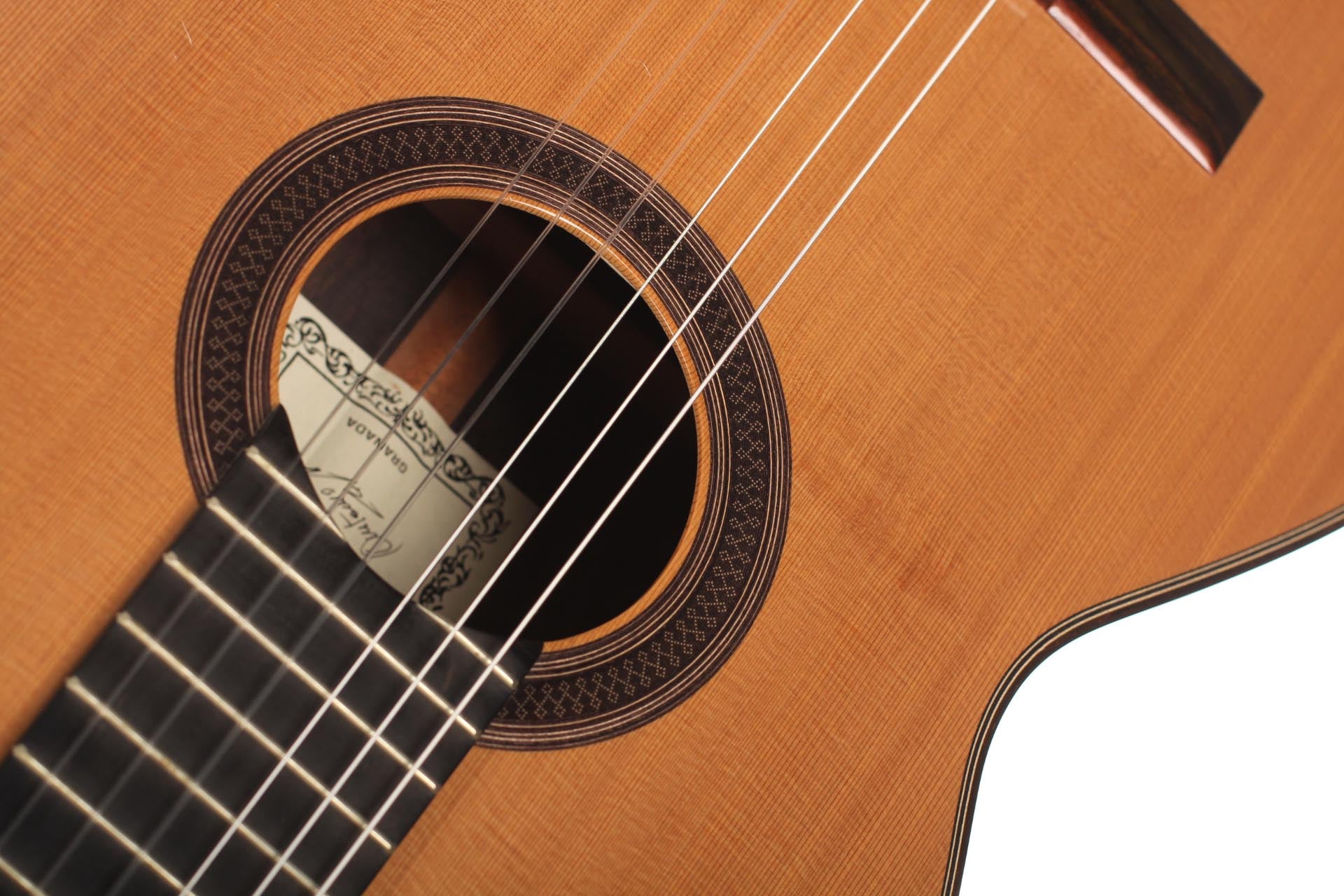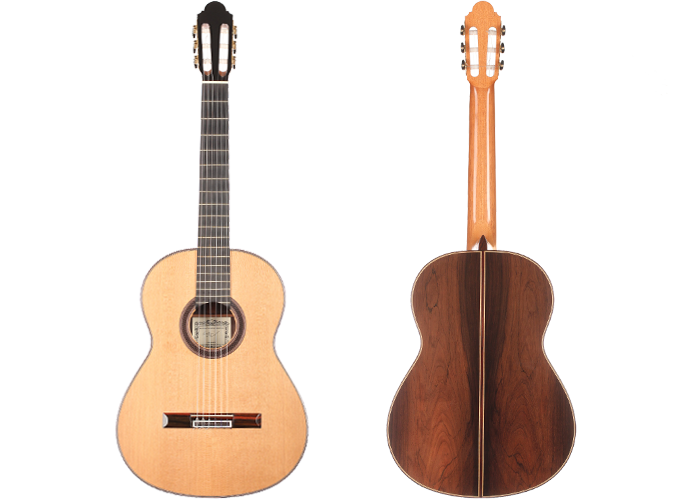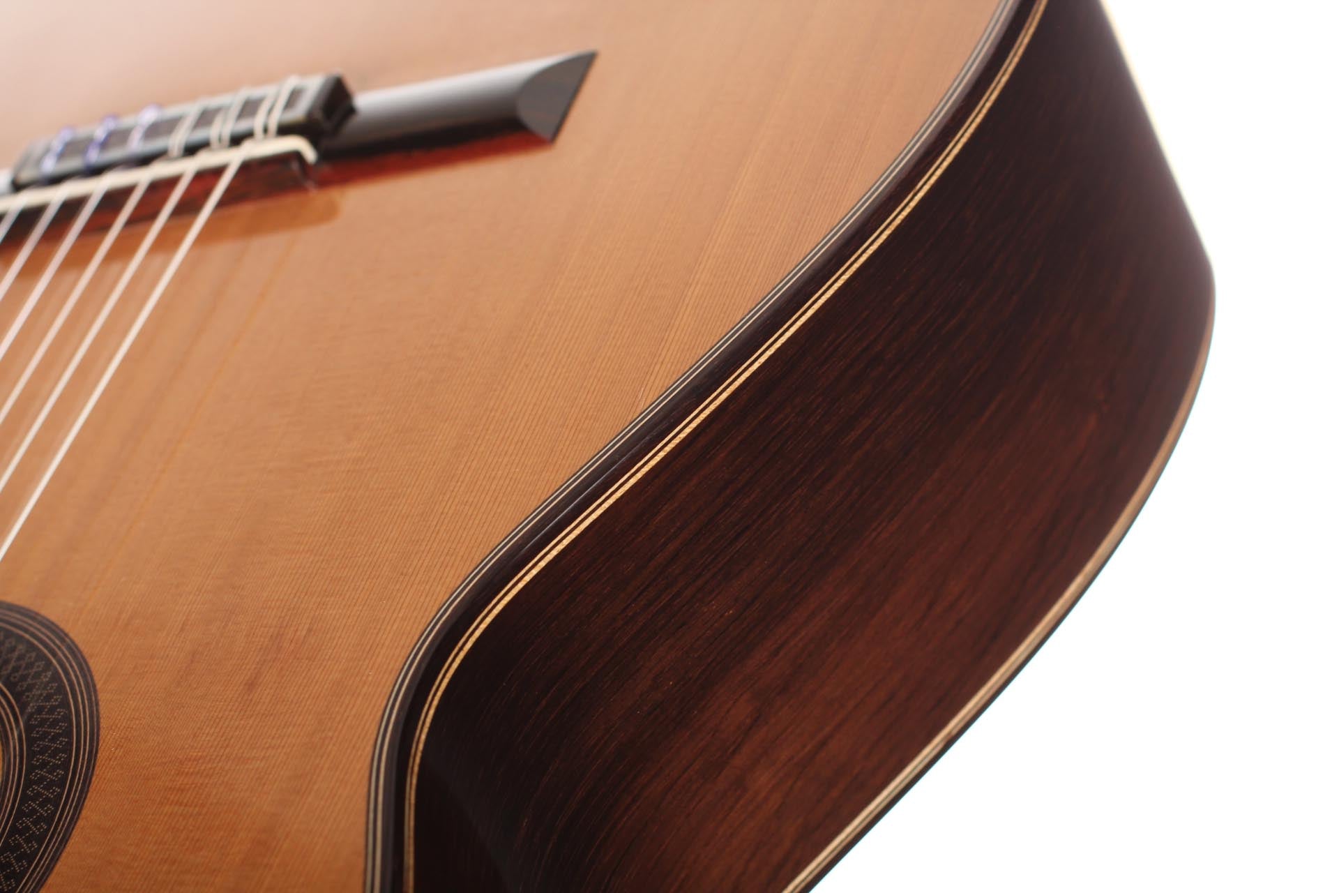 This cedar-top guitar was built in 2013 an is in amazing condition. It was as carefully handled as it deserves to be, and is now wearing only a very few superficial playing marks. The beauty of the fine cedar top and the highly figured Amazonas rosewood is stunning. This guitar has a straight generous sound with immediate response and great sustain. The thinly worked cedar top is giving to the tone a great depth, fabulous colours and a warm voice. One of the great qualities of Montero’s guitar is how the sympathetic basses resonances reinforce and complete the trebles, and vice versa. A superb concert guitar for Montero’s fans and Spanish tone lovers. The tuning machines are made by Rubner. A hardshell case is included.