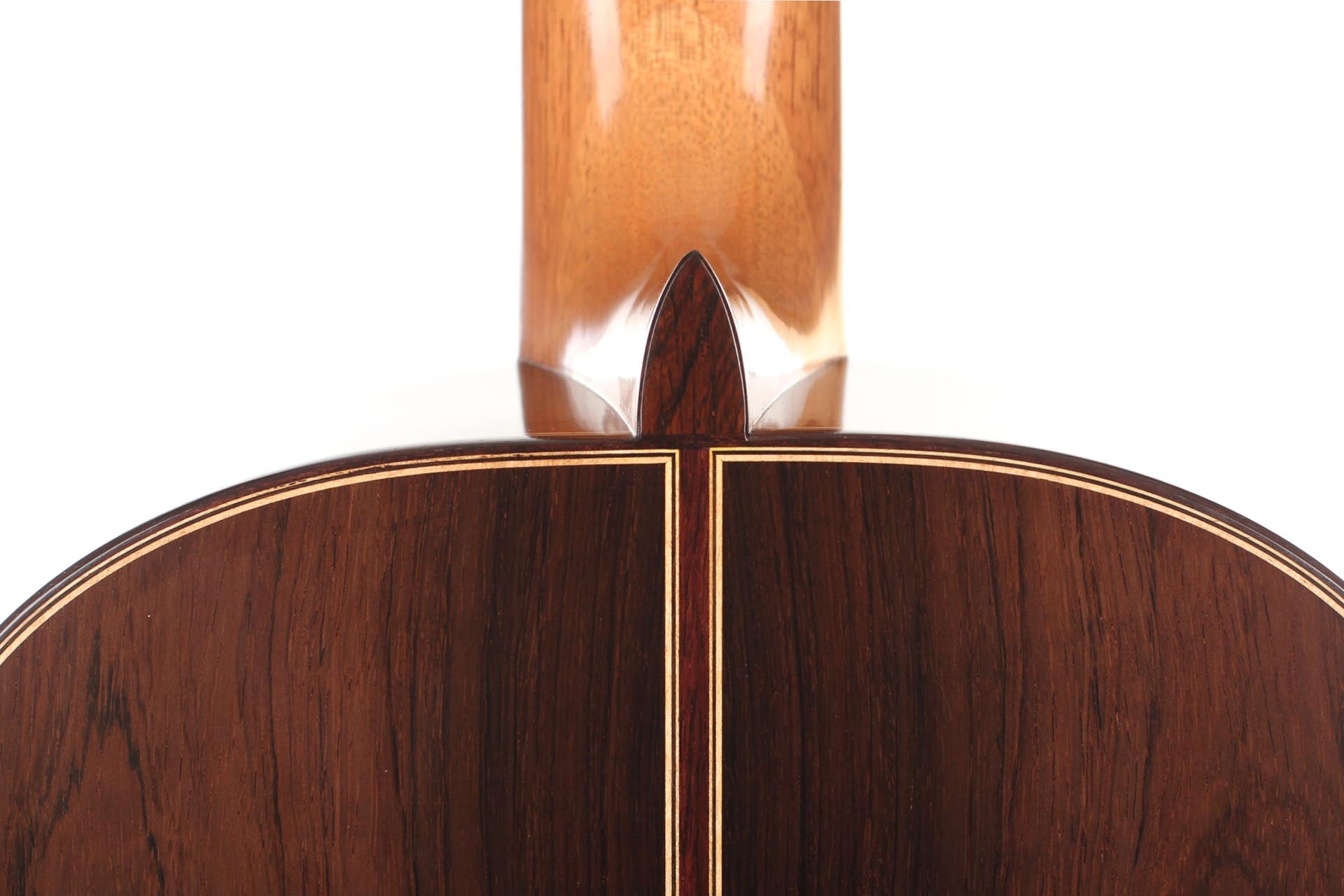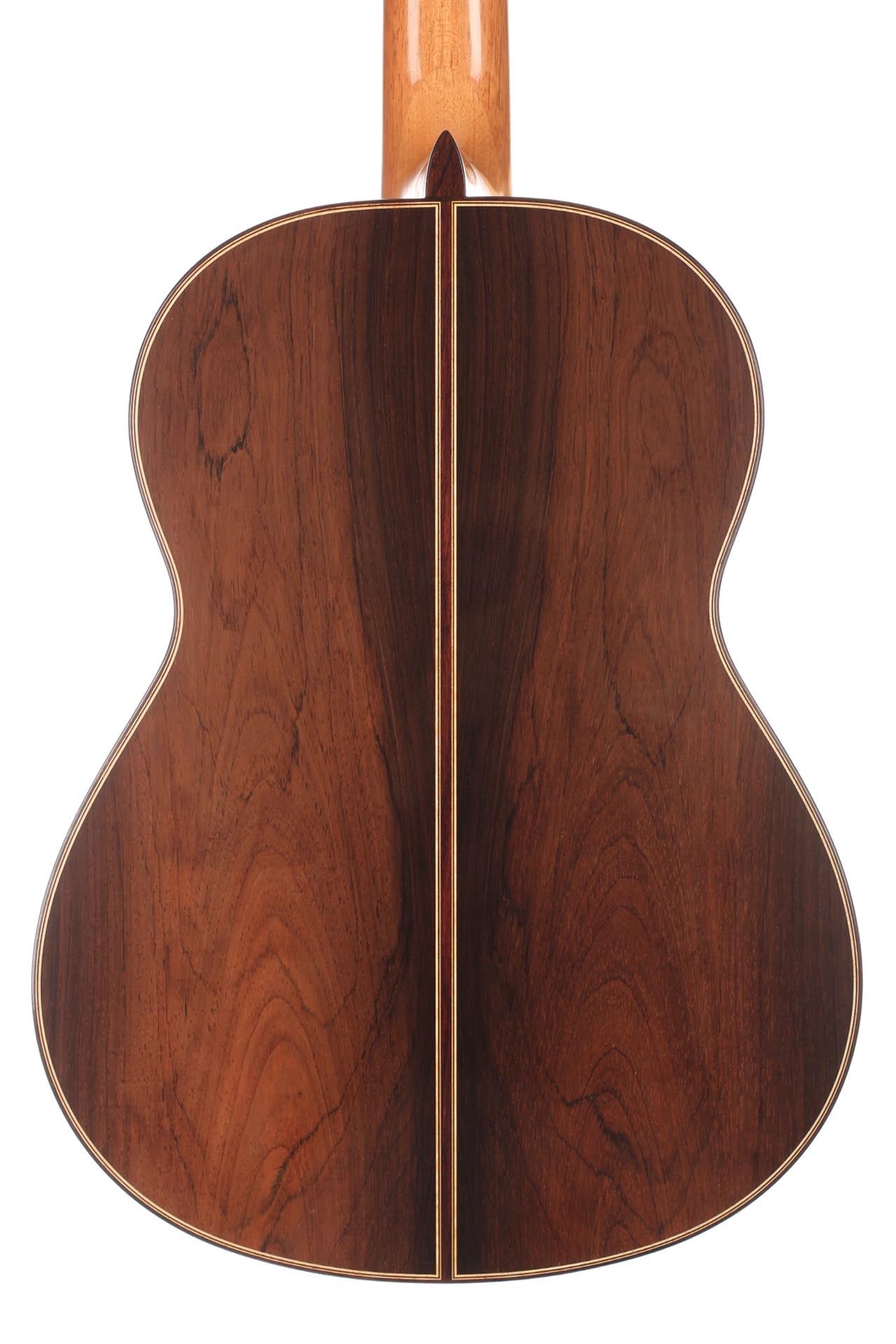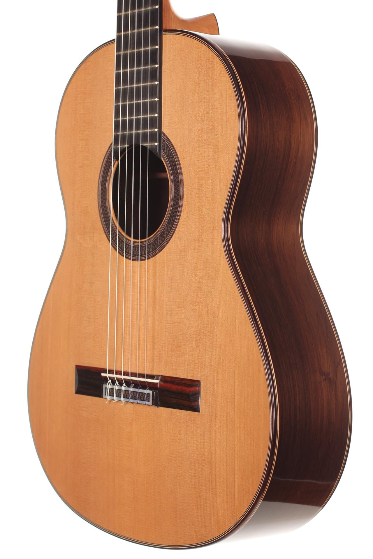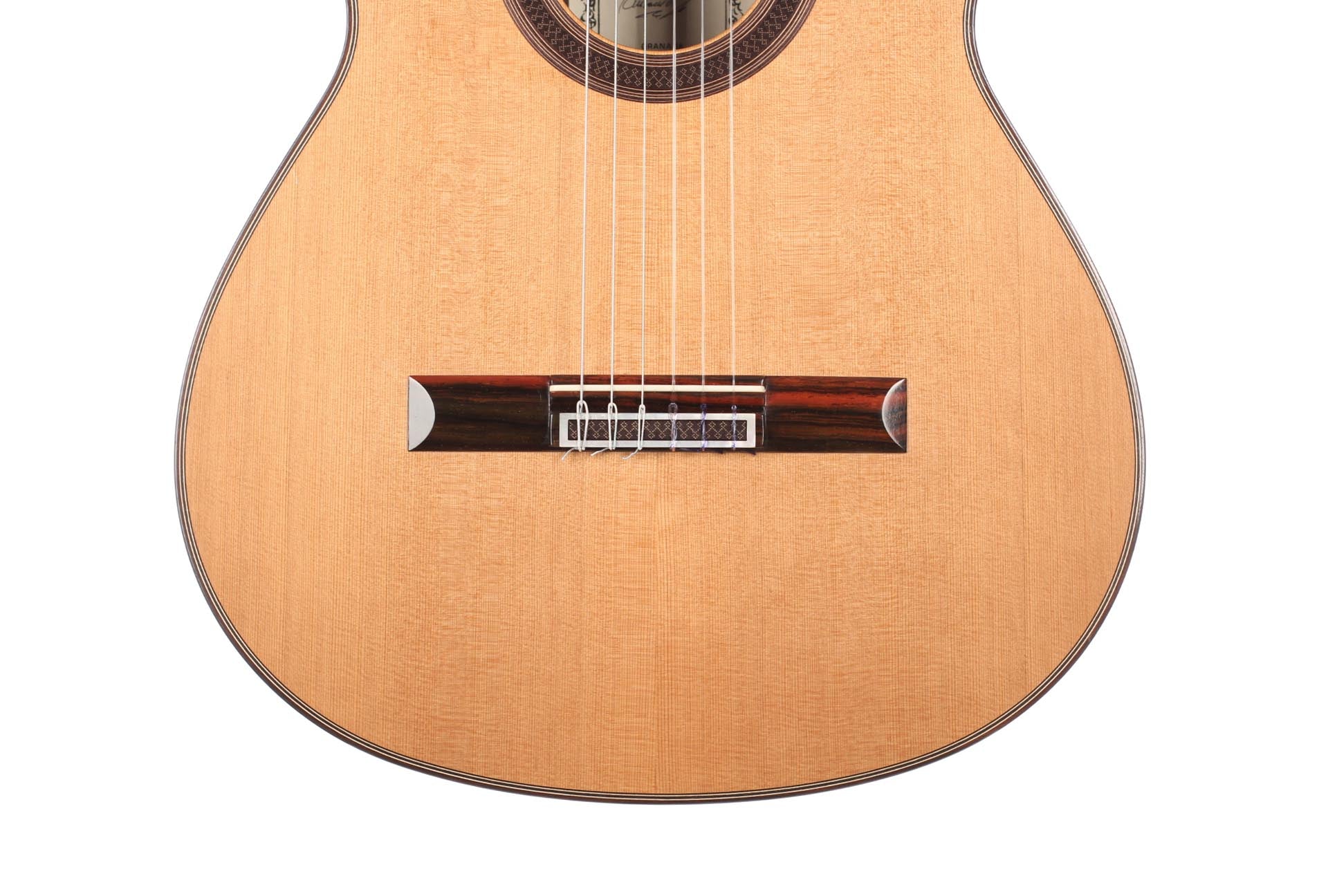 This cedar-top guitar was built in 2013 an is in amazing condition. It was as carefully handled as it deserves to be, and is now wearing only a very few superficial playing marks. The beauty of the fine cedar top and the highly figured Amazonas rosewood is stunning. This guitar has a straight generous sound with immediate response and great sustain. The thinly worked cedar top is giving to the tone a great depth, fabulous colours and a warm voice. One of the great qualities of Montero’s guitar is how the sympathetic basses resonances reinforce and complete the trebles, and vice versa. A superb concert guitar for Montero’s fans and Spanish tone lovers. The tuning machines are made by Rubner. A hardshell case is included.