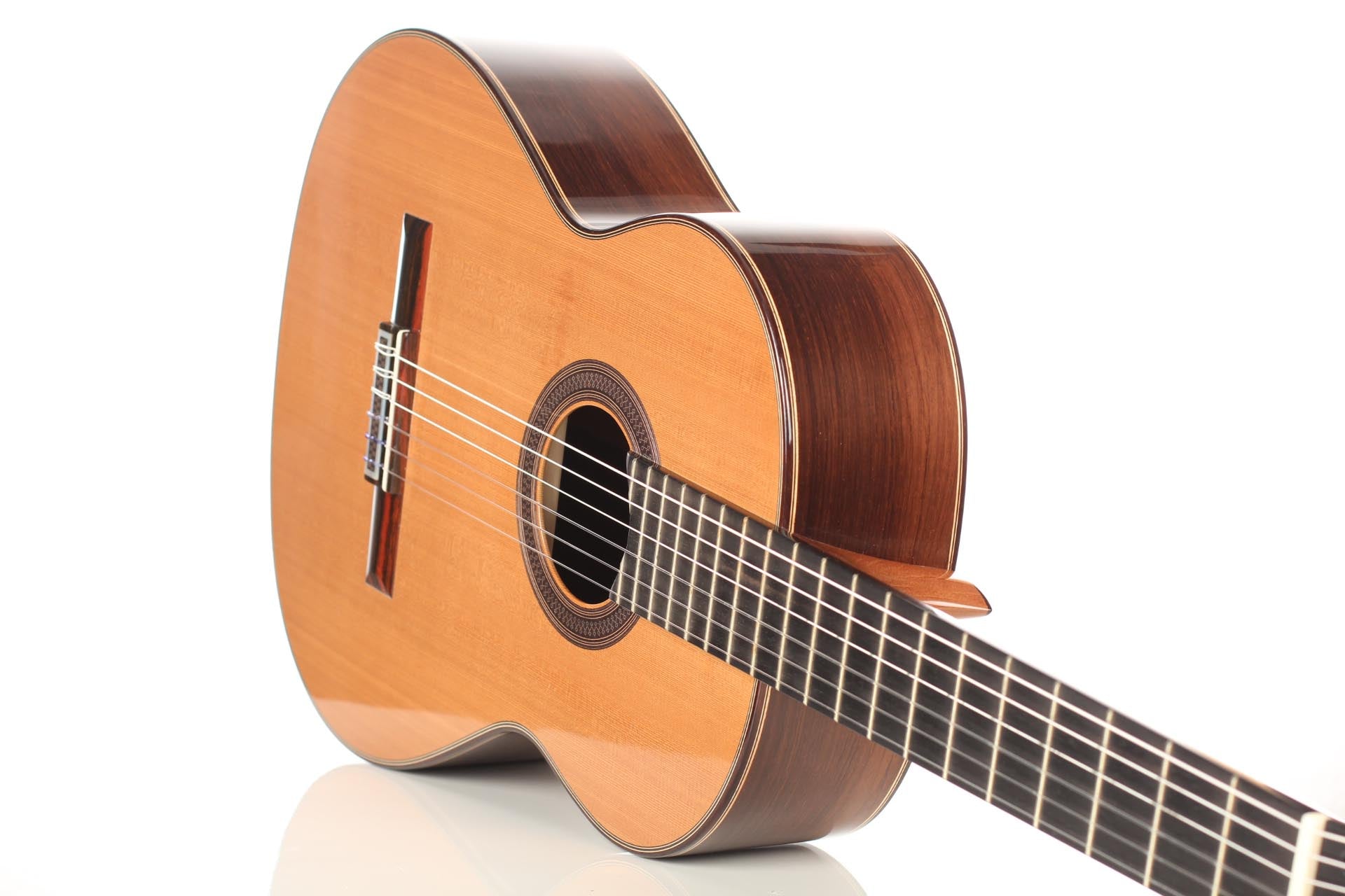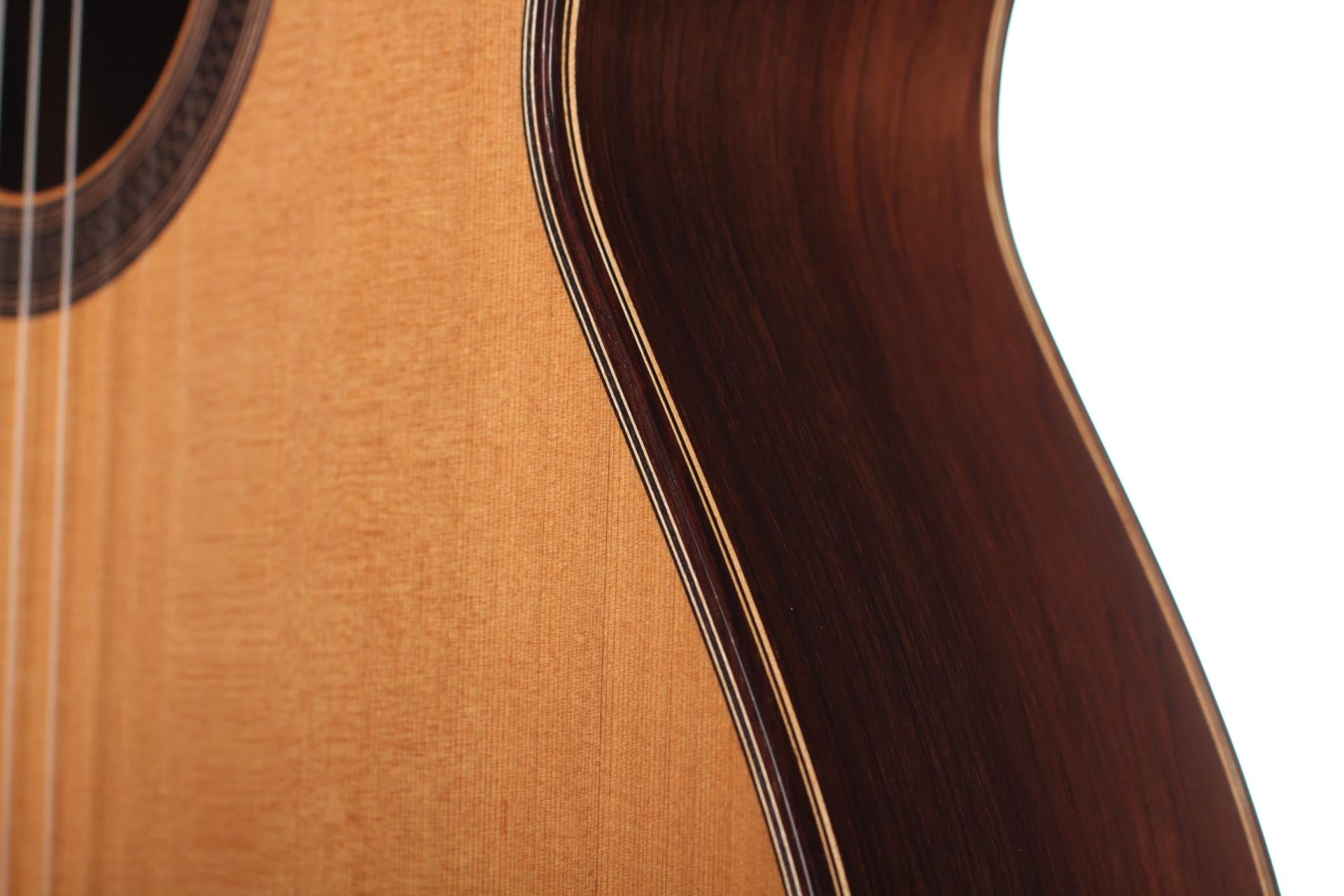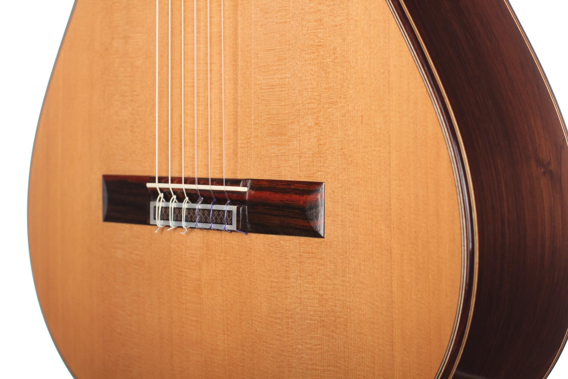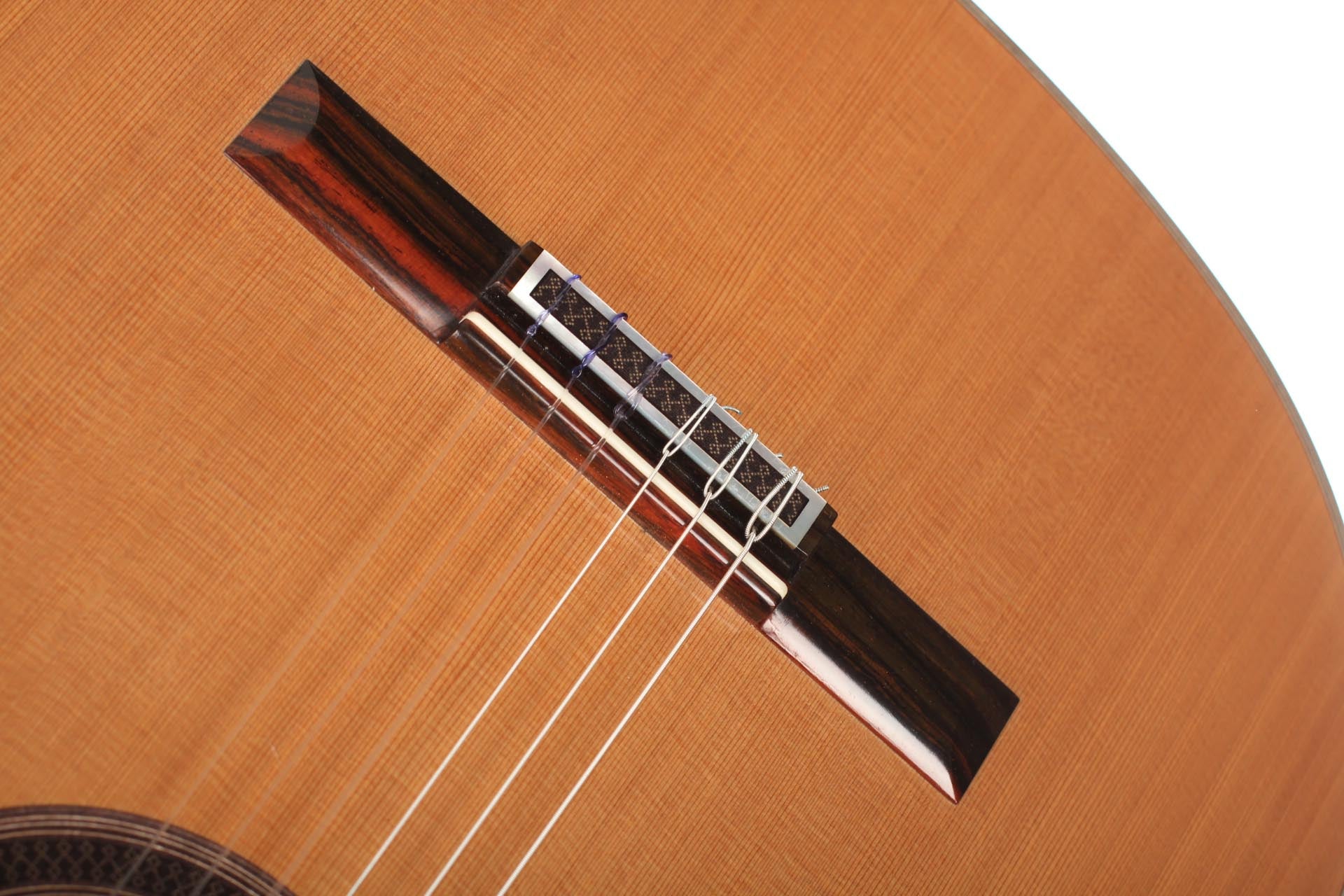 This cedar-top guitar was built in 2013 an is in amazing condition. It was as carefully handled as it deserves to be, and is now wearing only a very few superficial playing marks. The beauty of the fine cedar top and the highly figured Amazonas rosewood is stunning. This guitar has a straight generous sound with immediate response and great sustain. The thinly worked cedar top is giving to the tone a great depth, fabulous colours and a warm voice. One of the great qualities of Montero’s guitar is how the sympathetic basses resonances reinforce and complete the trebles, and vice versa. A superb concert guitar for Montero’s fans and Spanish tone lovers. The tuning machines are made by Rubner. A hardshell case is included.
