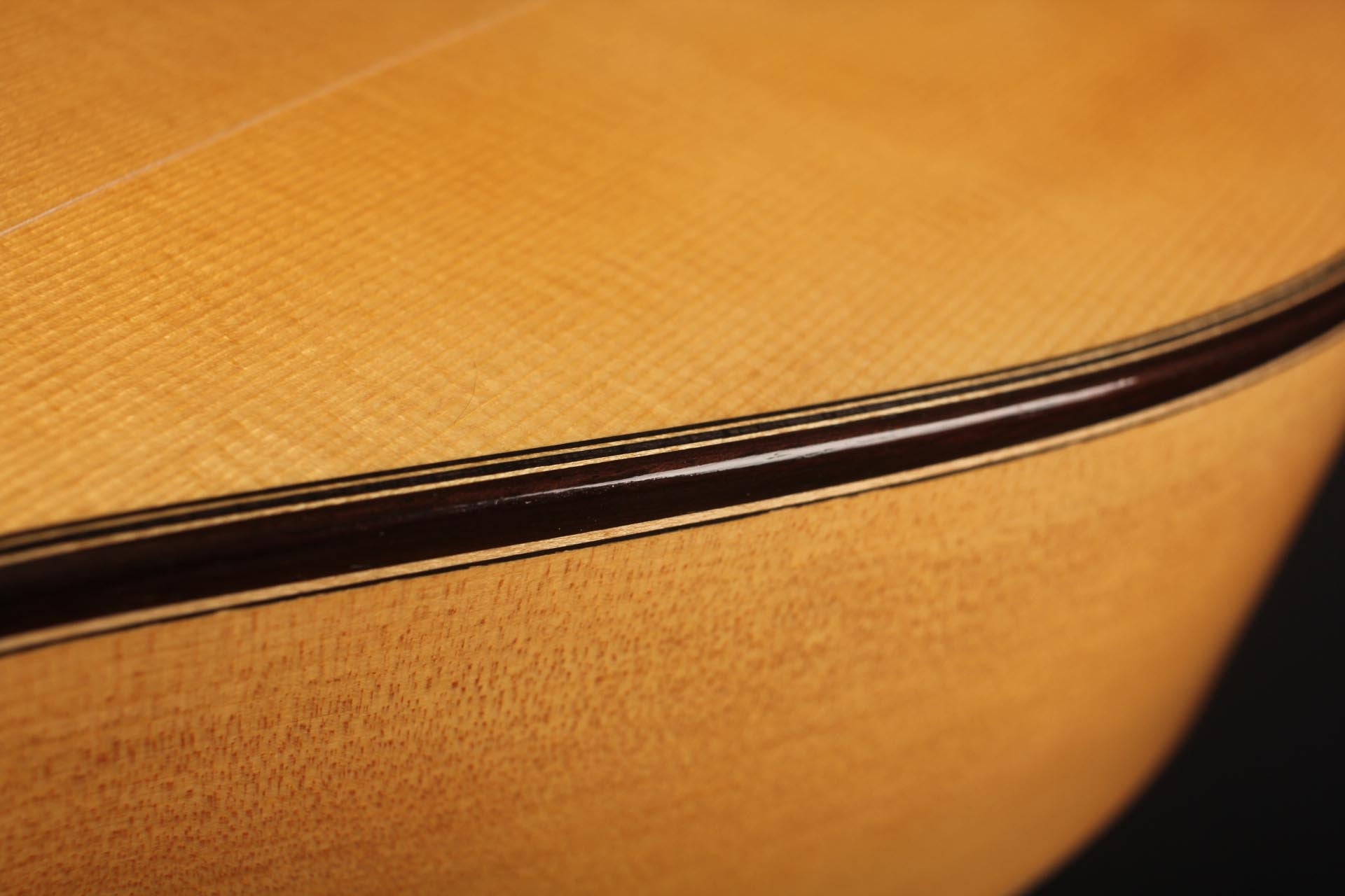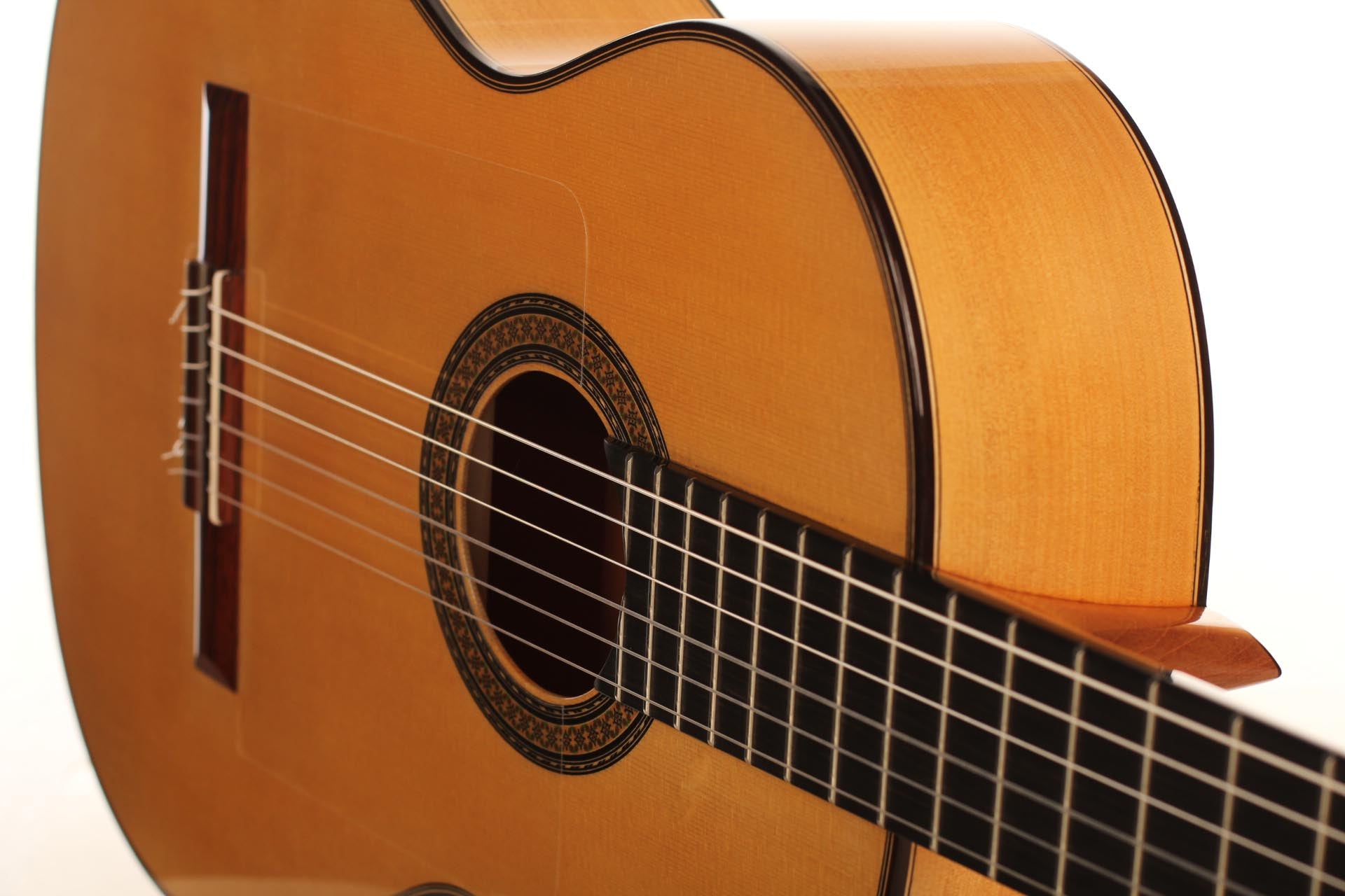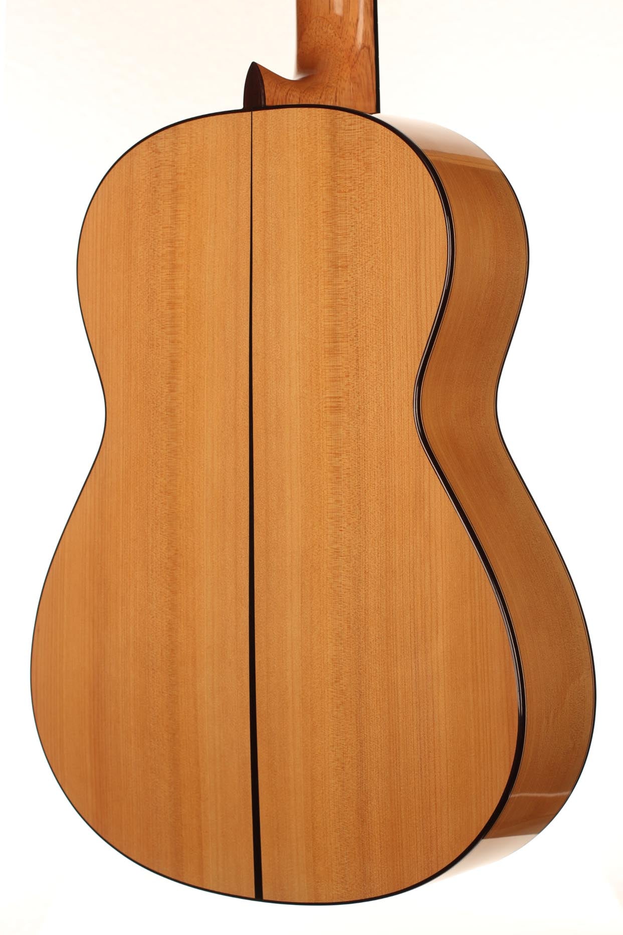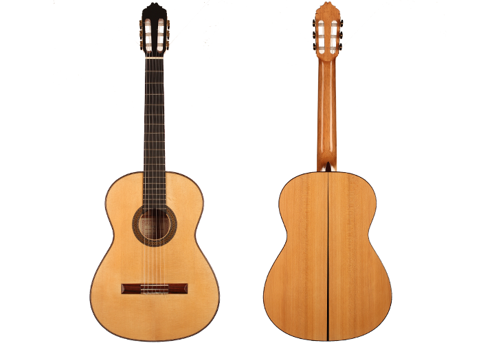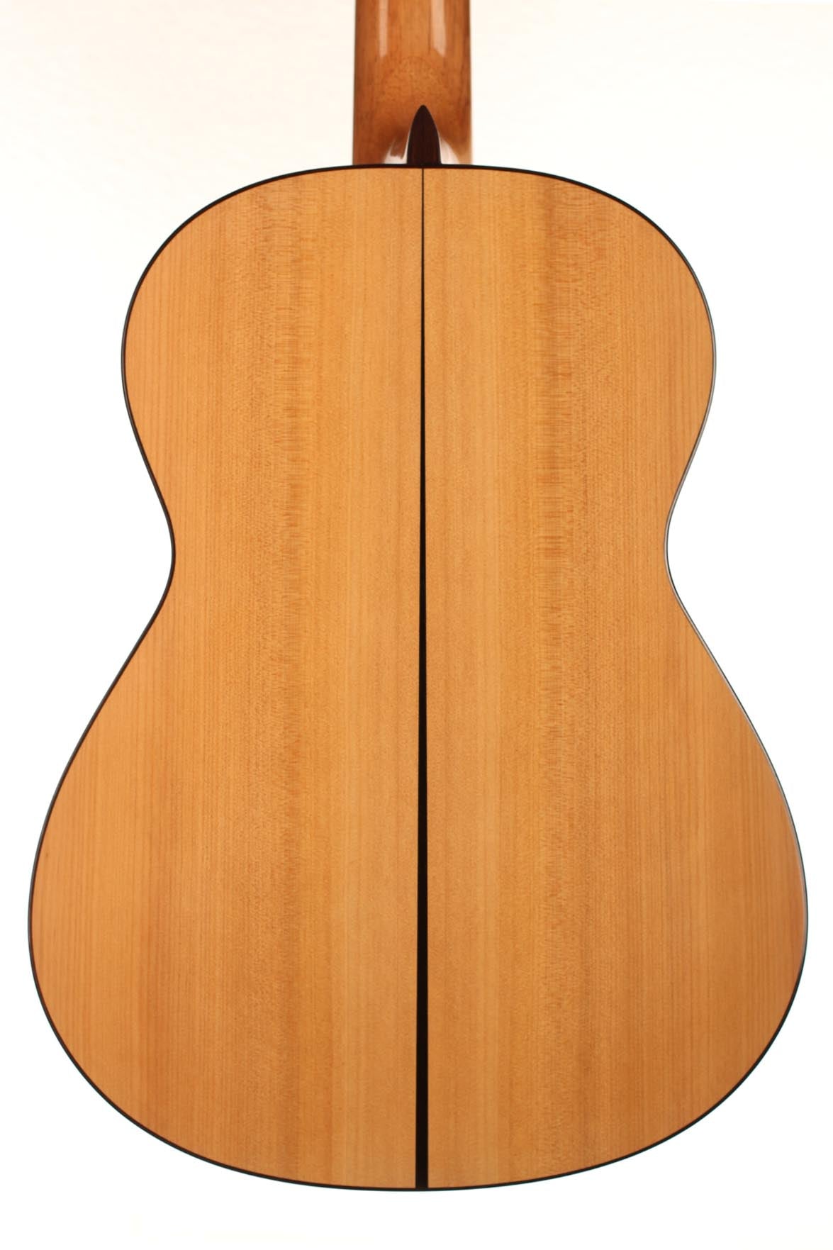 This flamenco model was built at the very beginning of 2018 and is numbered 868. It has a very light and resonant spruce top. Back and sides are made from very thinly worked cypress, in the Spanish tradition. This guitar is light, responsive and has a characteristic old cypress tone. It is a very fine flamenco guitar and a beautifully singing instrument. A hard-shell case is included.