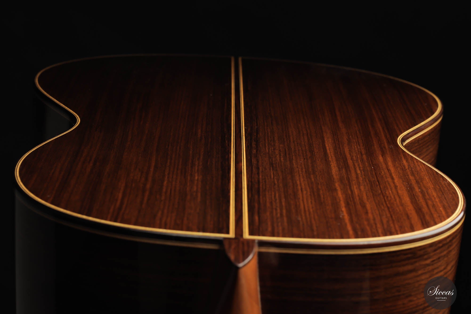 The 2018 Antonio Marin Montero Guitar No. 1463B is a breathtaking masterpiece that showcases the finest in Granada guitar-making tradition. This handcrafted instrument is a testament to the maestro's exceptional skill and artistry, ensuring that it stands out among its contemporaries. The striking visual impact of this guitar is evident from the moment you lay eyes on it. The exquisite fine-grain spruce soundboard contrasts perfectly with the Indian rosewood back and sides, exuding elegance and sophistication in every detail. This guitar is not just a work of art but a powerful instrument that captures the essence of Spanish guitar. When it comes to sound, the 2018 Antonio Marin Montero guitar is truly a force to be reckoned with. The trebles possess an exceptional singing quality, boasting long and even sustain throughout the entire fretboard. This versatile instrument offers a broad range of tonal colors that can be easily manipulated to suit any musical style or genre. Complementing the trebles are the guitar's direct and crisp basses, which provide a solid foundation for the overall sound. This well-rounded tone is ideal for a variety of playing styles and ensures that the instrument can handle any musical situation. With its impressive volume, the 2018 Antonio Marin Montero guitar is perfectly suited for concert performances, captivating audiences with its rich and resonant sound.