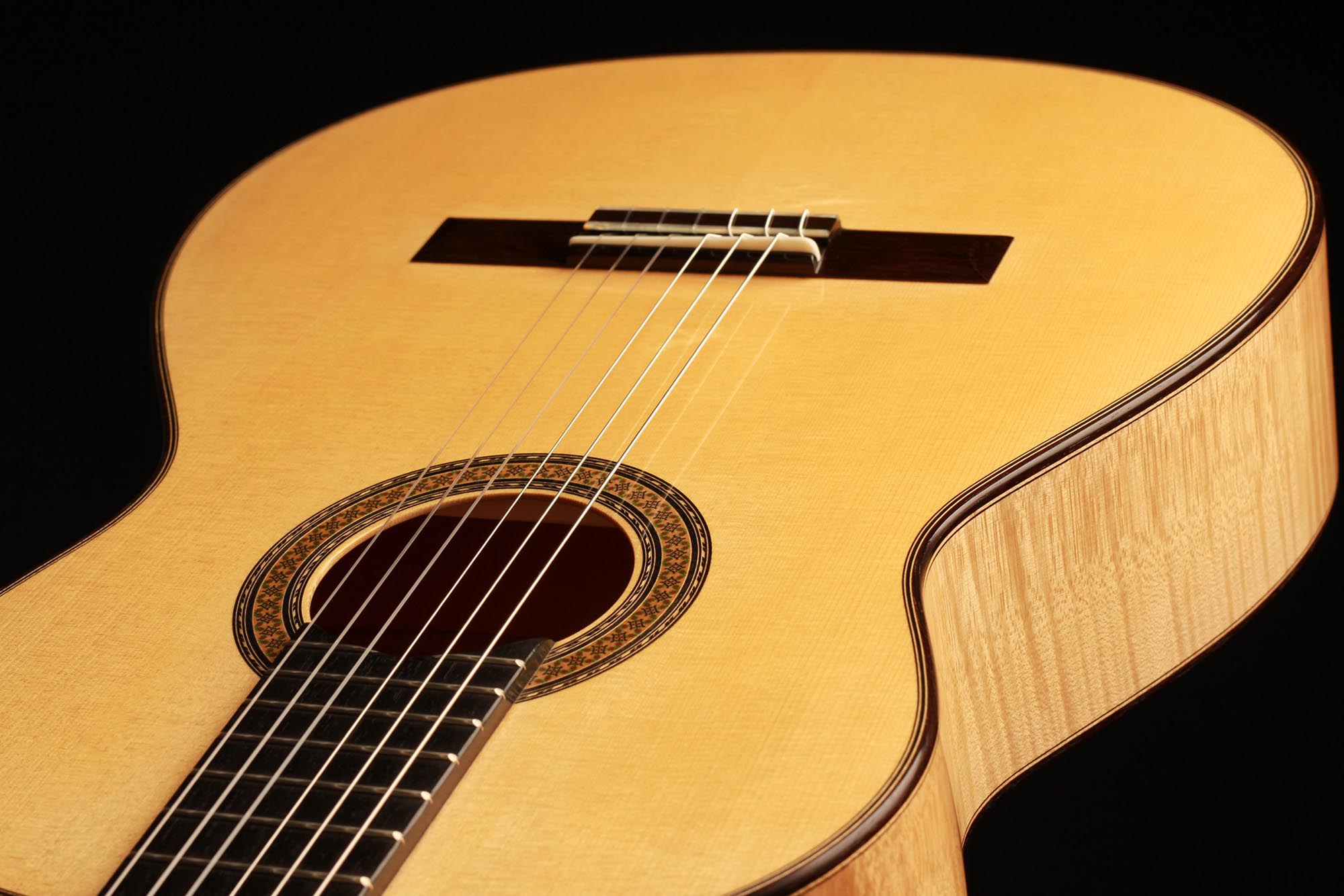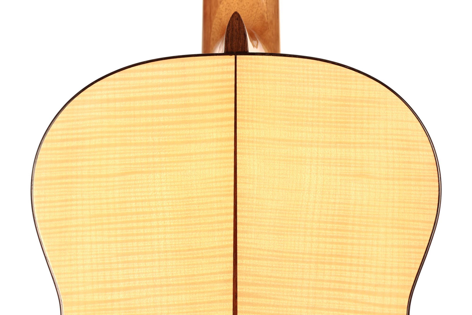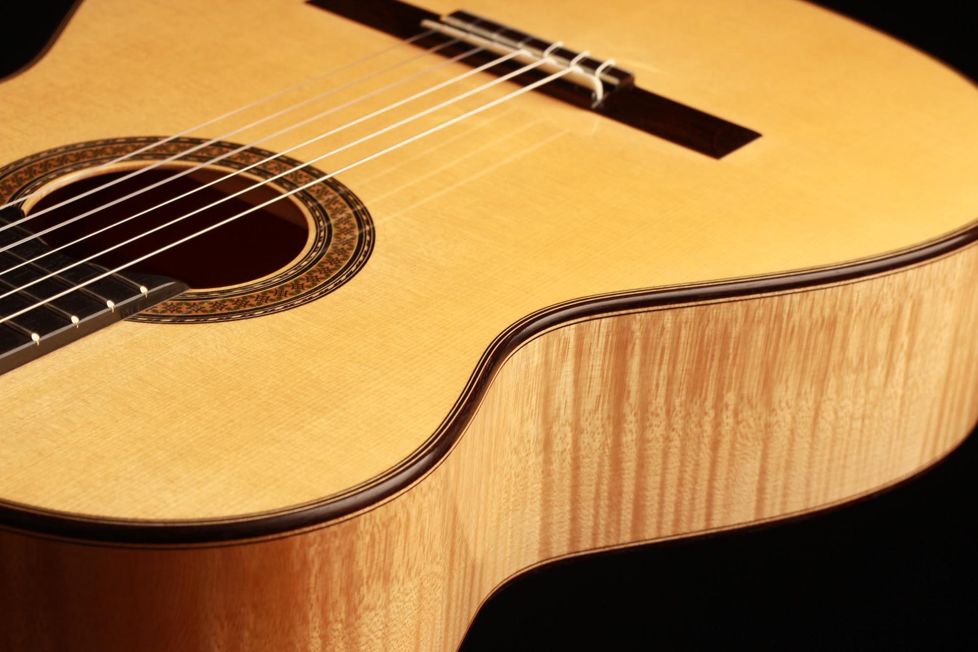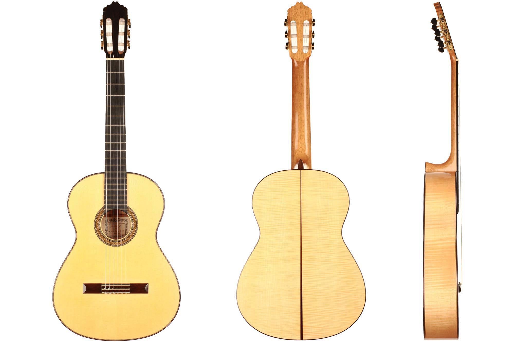 This fabulous maple guitar built by Antonio Marin Montero is a true rarity. Very few of this model exist and fine concert guitarists such as Julia Trintschuk play on them. This guitar has a very thin back. The response of this instrument is incredible, and one really feels the Spanish character of A. M. Montero. The trebles are singing elegantly and overall this Marin Montero has a wide dynamic range. The basses are ample and brilliant. This guitar is overall a masterpiece
