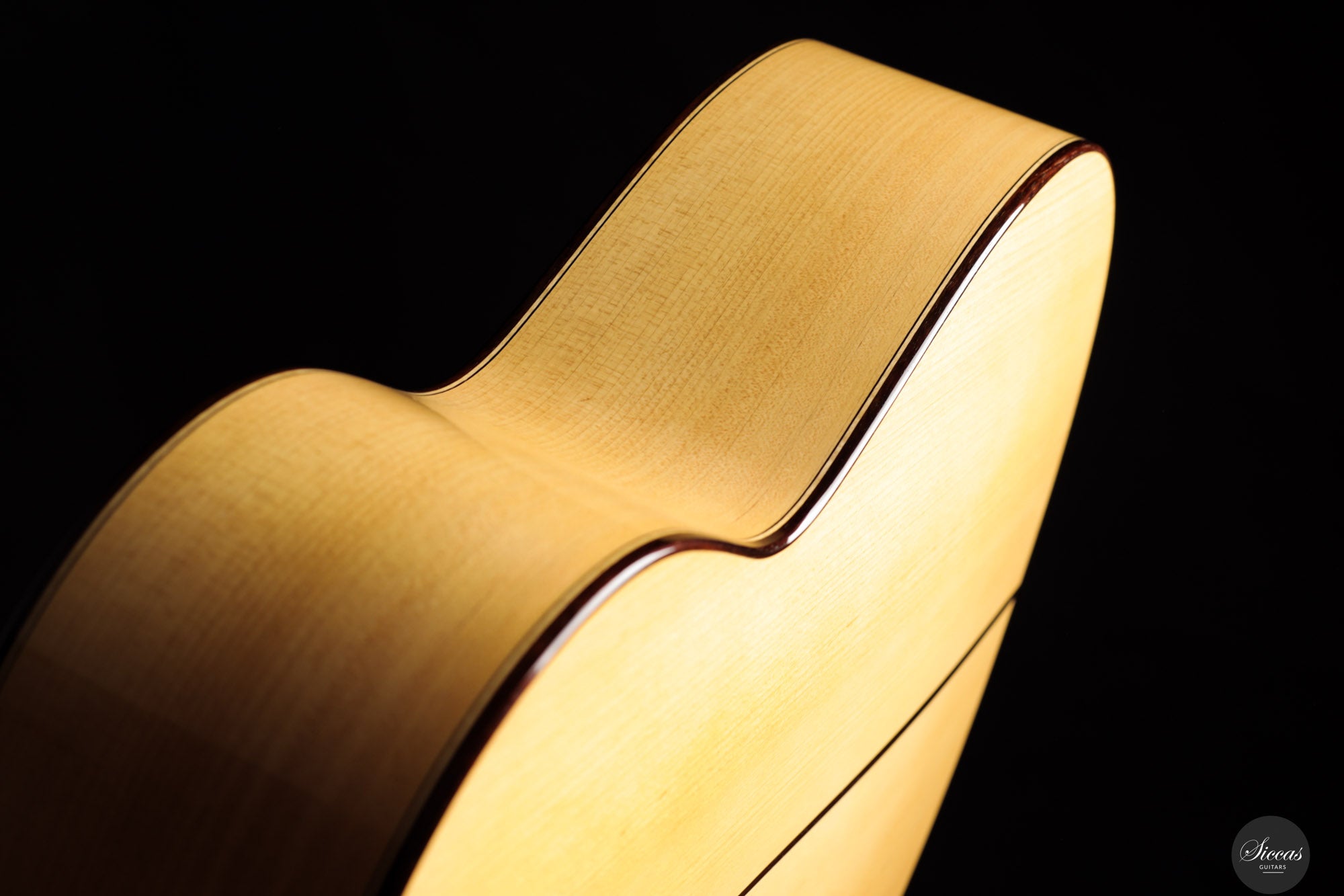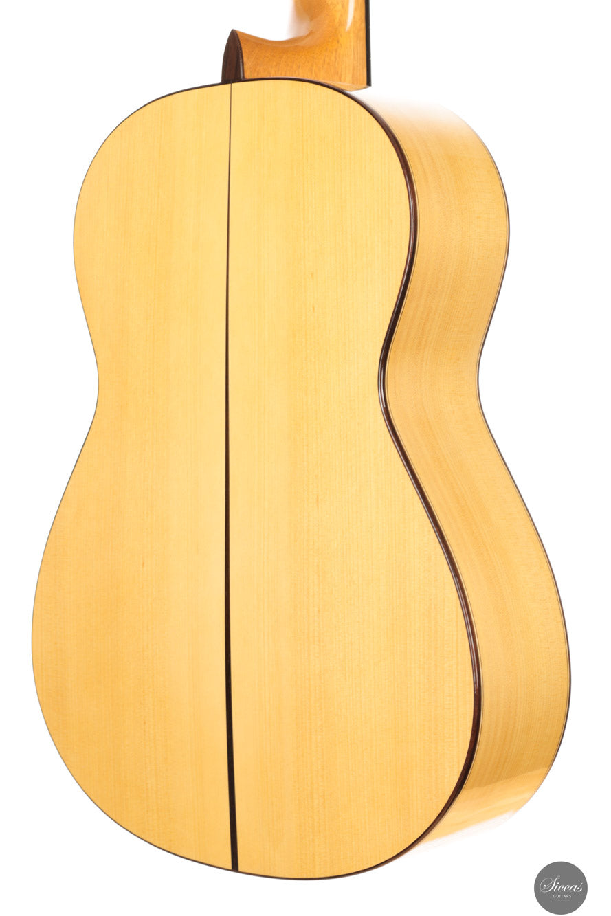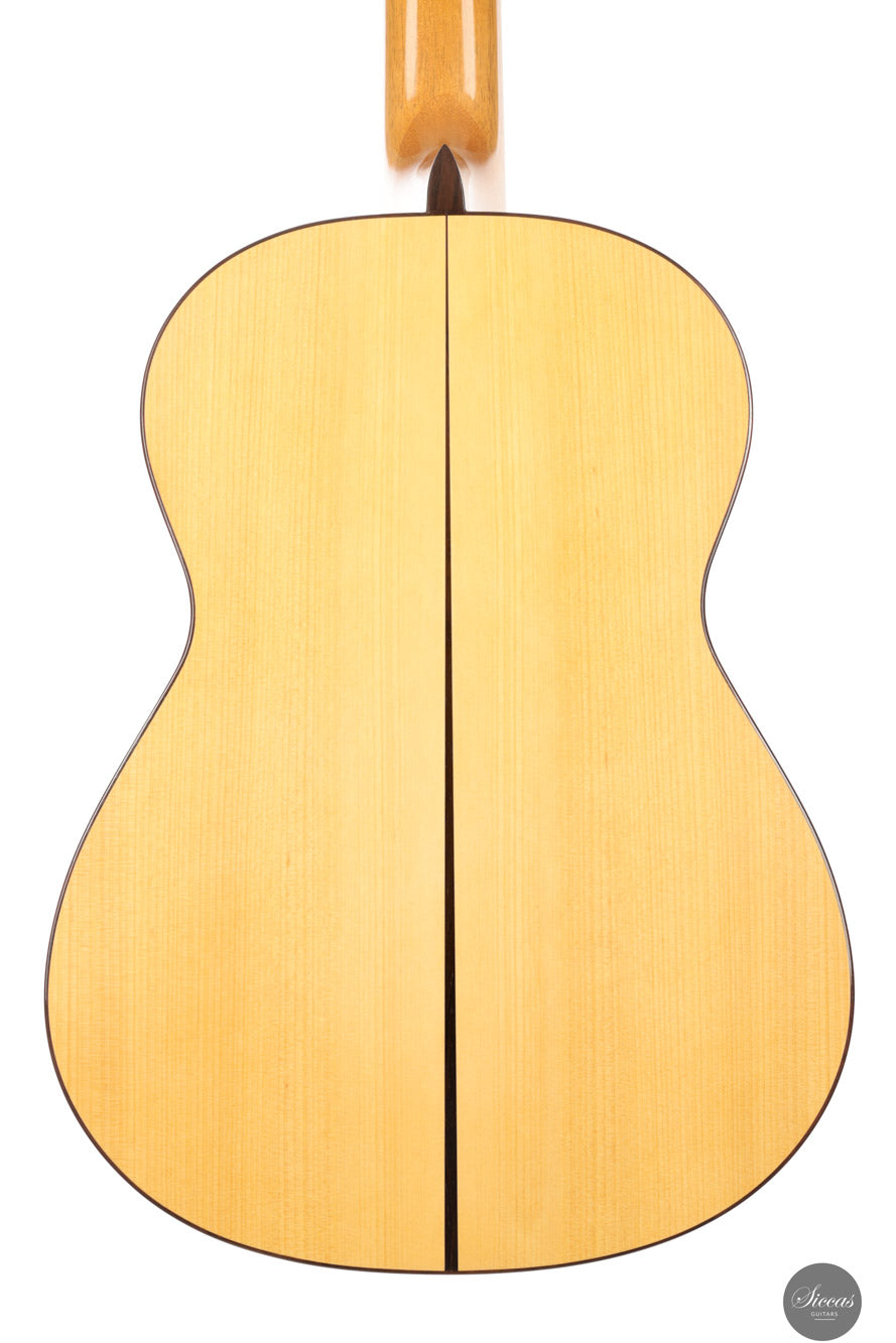 This 2024 flamenca blanca, numbered 934, is one of the very last guitars built by Antonio Marín Montero. Crafted with a spruce top and cypress back and sides, it captures the immediacy and brilliance expected of a traditional flamenco instrument, while offering unusual versatility that makes it equally compelling for classical repertoire. The sound is colorful, airy, and rich in overtones, yet remarkably forgiving and round in character, qualities that distinguish it from many other spruce and cypress guitars. Its response is fast and sensitive, but with a malleability that allows the player to shape the tone with ease. The guitar is fitted with mechanized pegheads, which preserve the lightweight headstock and tonal qualities typical of flamenco instruments, while providing the ease of tuning and maintenance associated with modern machine heads. This instrument sets an extraordinarily high standard, serving as both a culmination of Marín’s lifelong artistry and a reference point for the next generation of flamenco makers.Condition:
