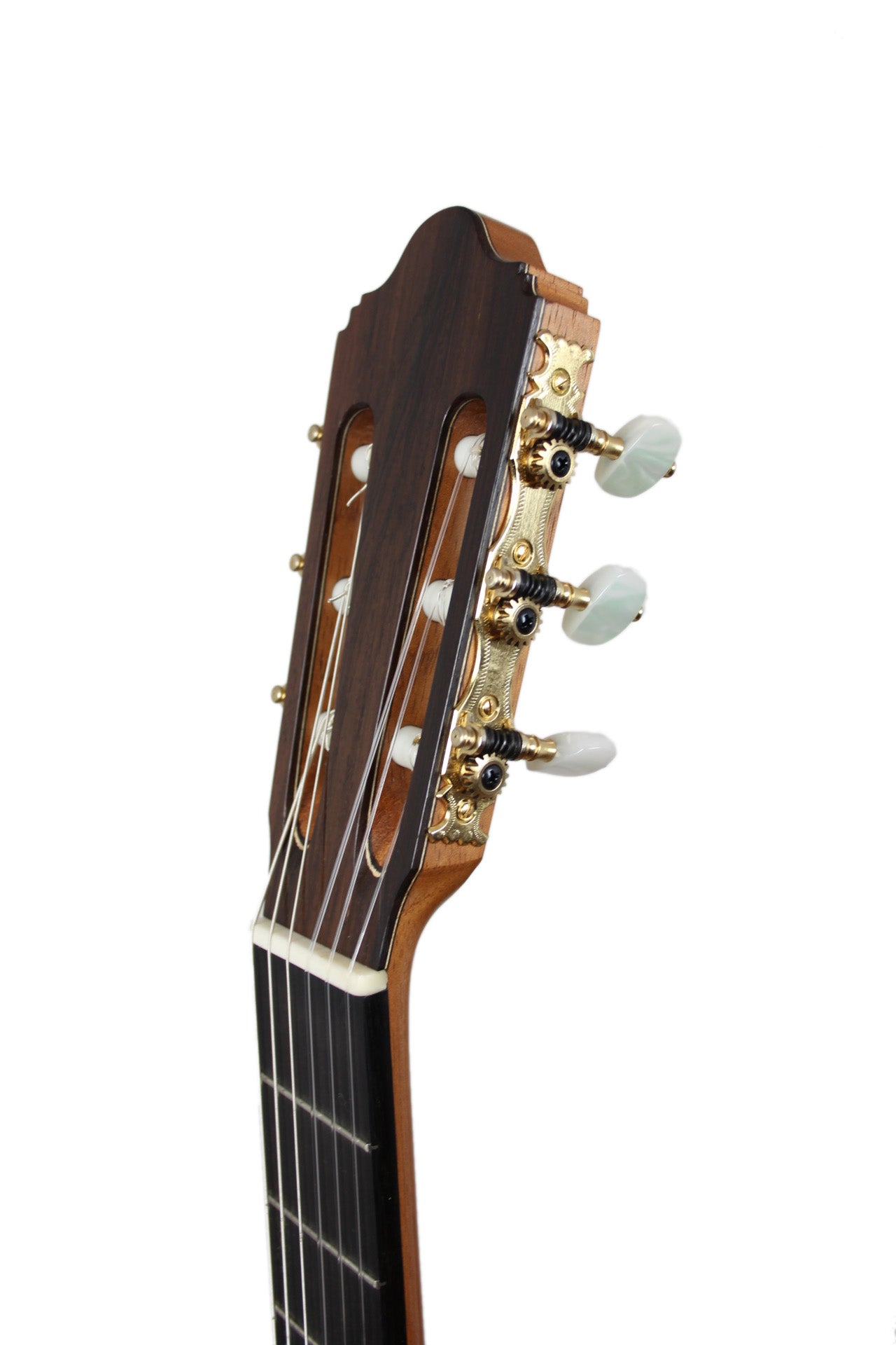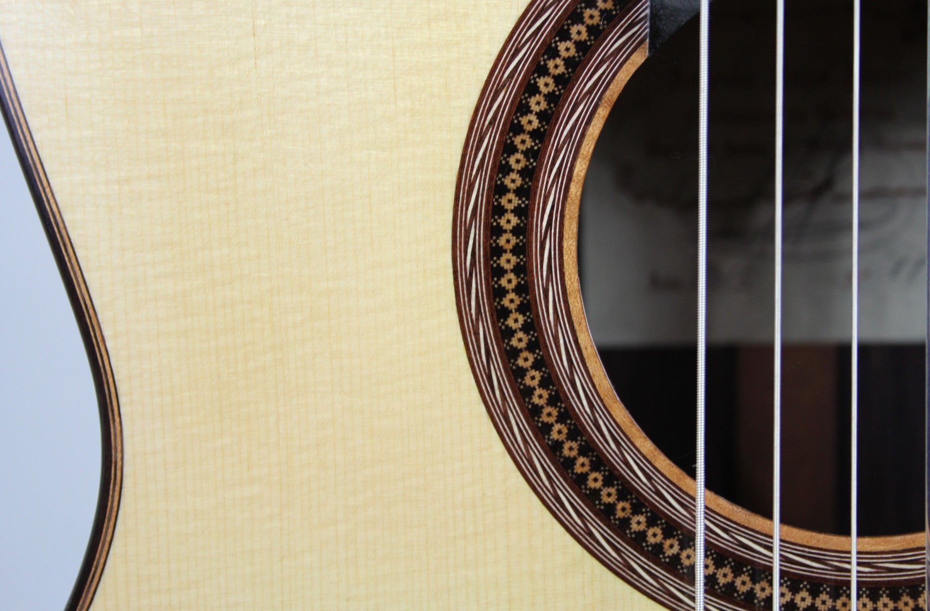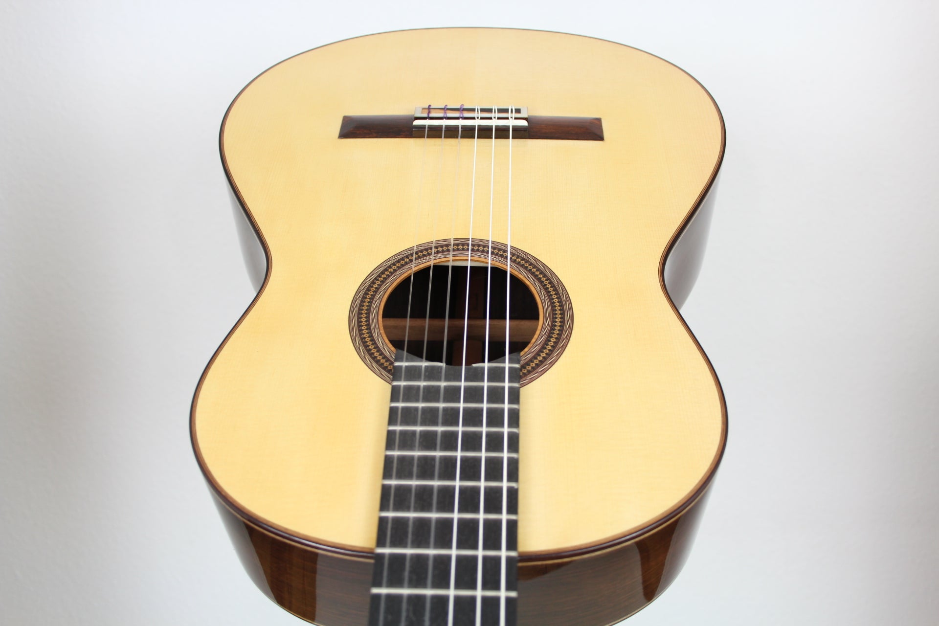 This elegant spruce top classical guitar has a very nice rosette with red shavings outside and little blossoms inside. The rosewood bridge is framed with mother of pearl around the tie-block. The back and the sides are made of Indian rosewood. The back has in the middle a maple strip that looks very decorative. The whole guitar is shellac French-polished. About the sound we can say that the guitar has good volume and a round sound. The machine heads are by Fustero. Hard case included.