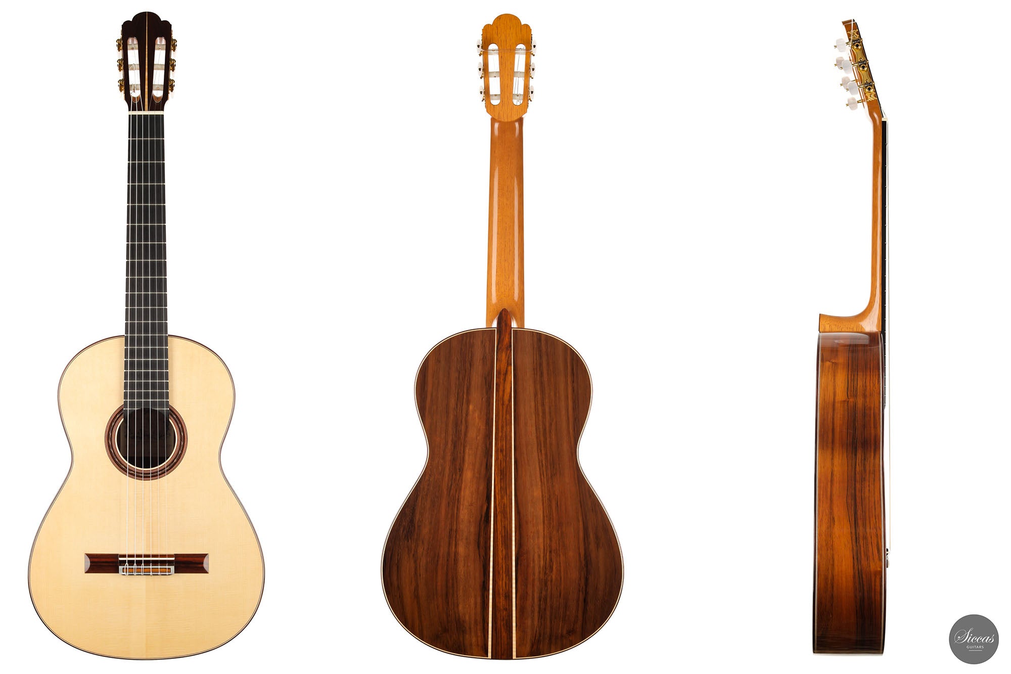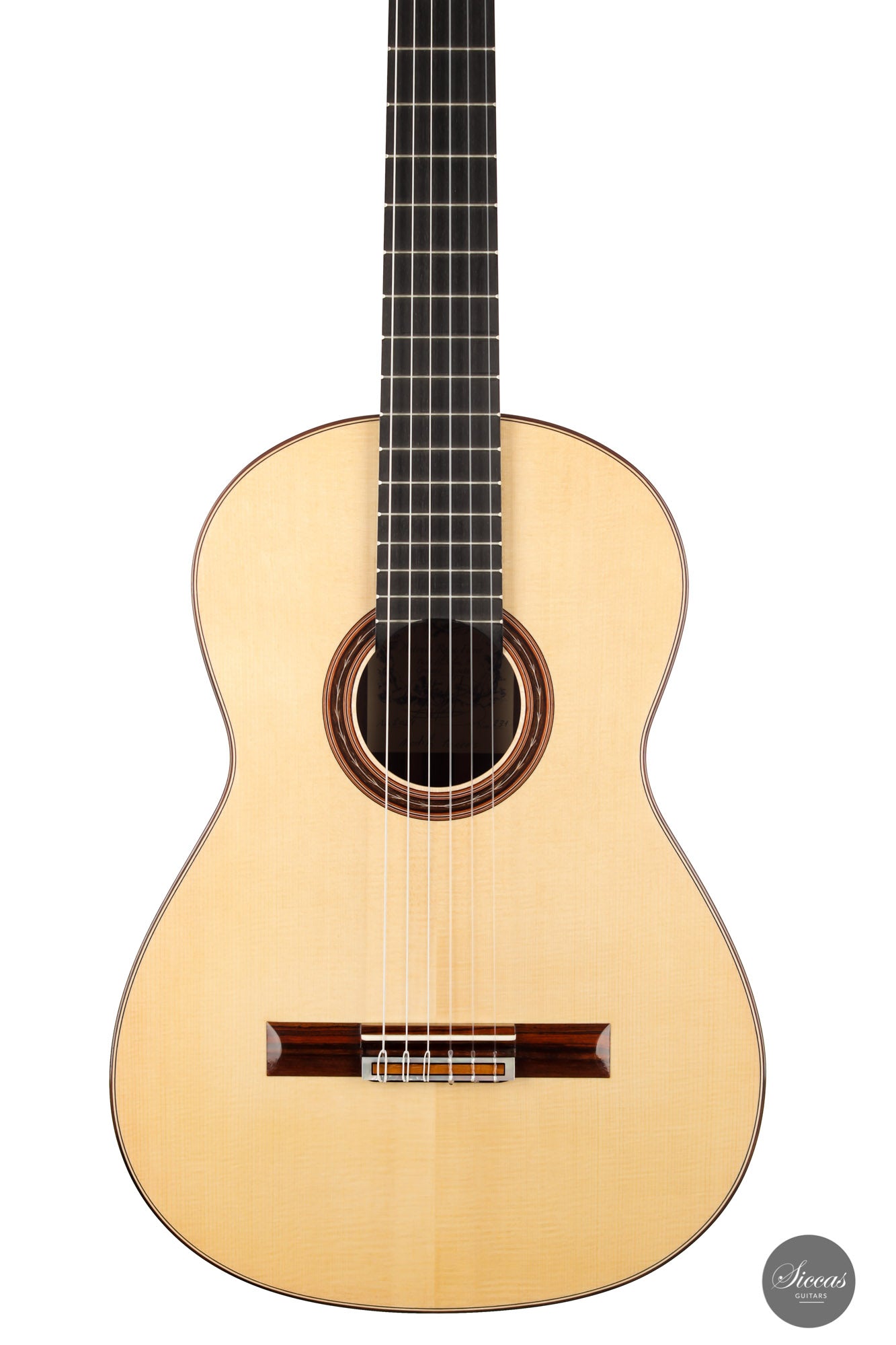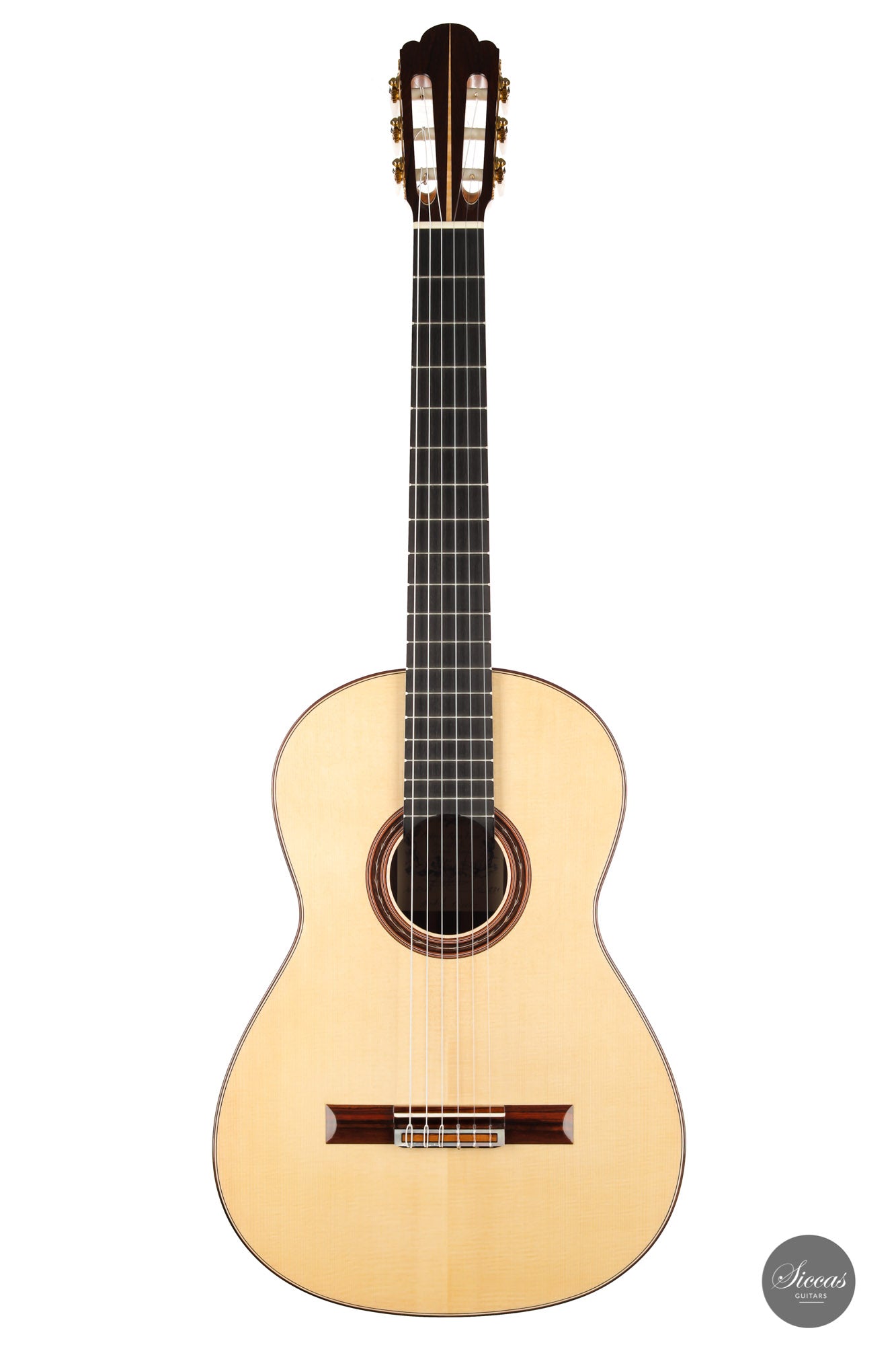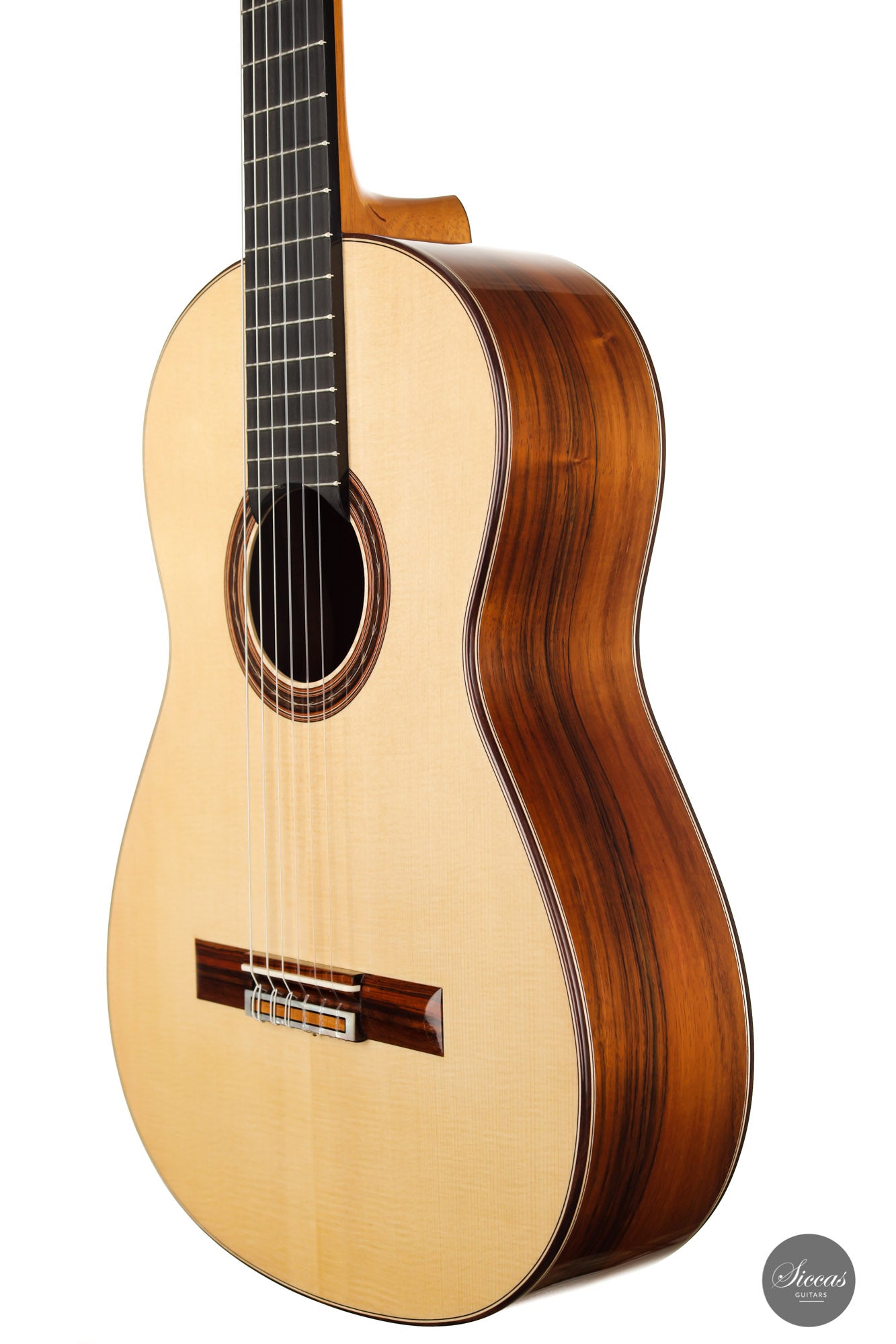 This beautiful Torres model has a slightly smaller body and is made with a gorgeous set of Pau Ferro for back and sides. This wood shows stunning orange colors with wonderful green and dark veins. The sound of this guitar is very appealing with rich timbres and clarity in the treble. A wonderful guitar that is suitable not only for a wide repertoire but also especially for guitarists who prefer an instrument with a slightly smaller body and expressive character.