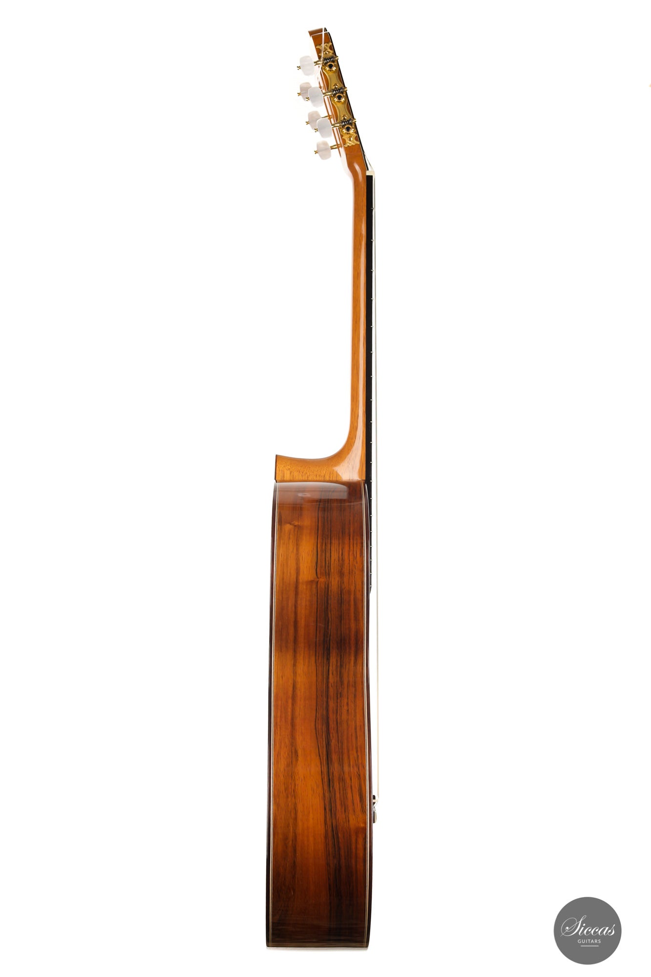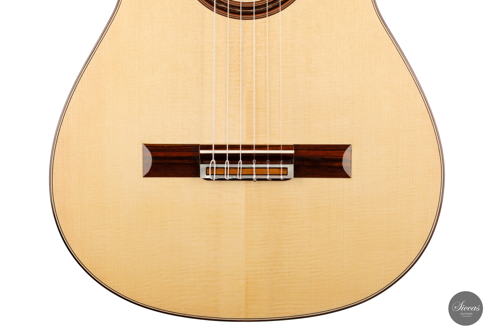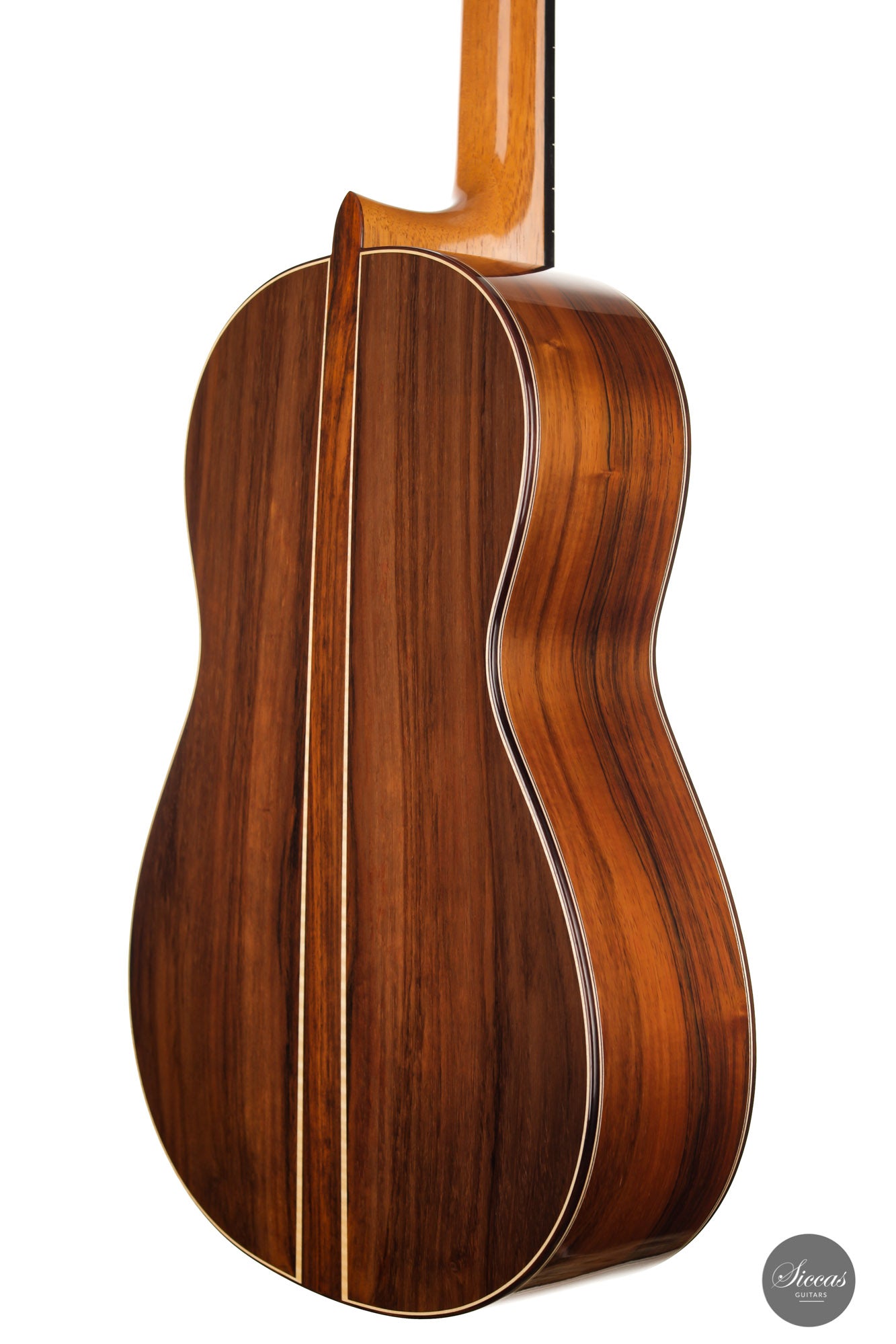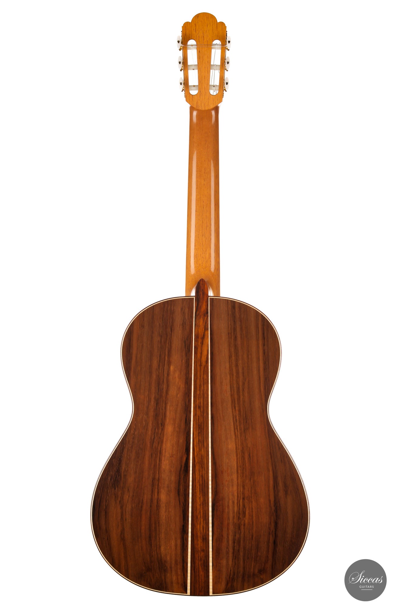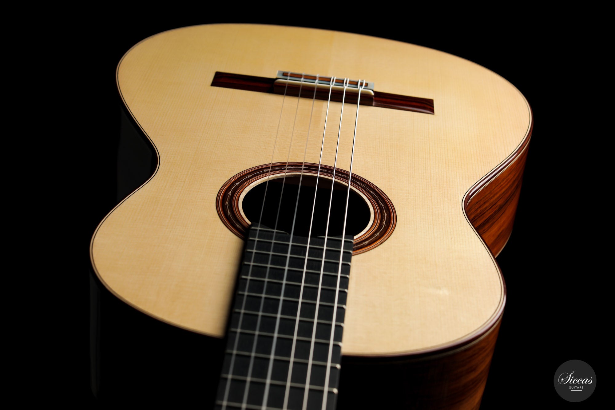 This beautiful Torres model has a slightly smaller body and is made with a gorgeous set of Pau Ferro for back and sides. This wood shows stunning orange colors with wonderful green and dark veins. The sound of this guitar is very appealing with rich timbres and clarity in the treble. A wonderful guitar that is suitable not only for a wide repertoire but also especially for guitarists who prefer an instrument with a slightly smaller body and expressive character.