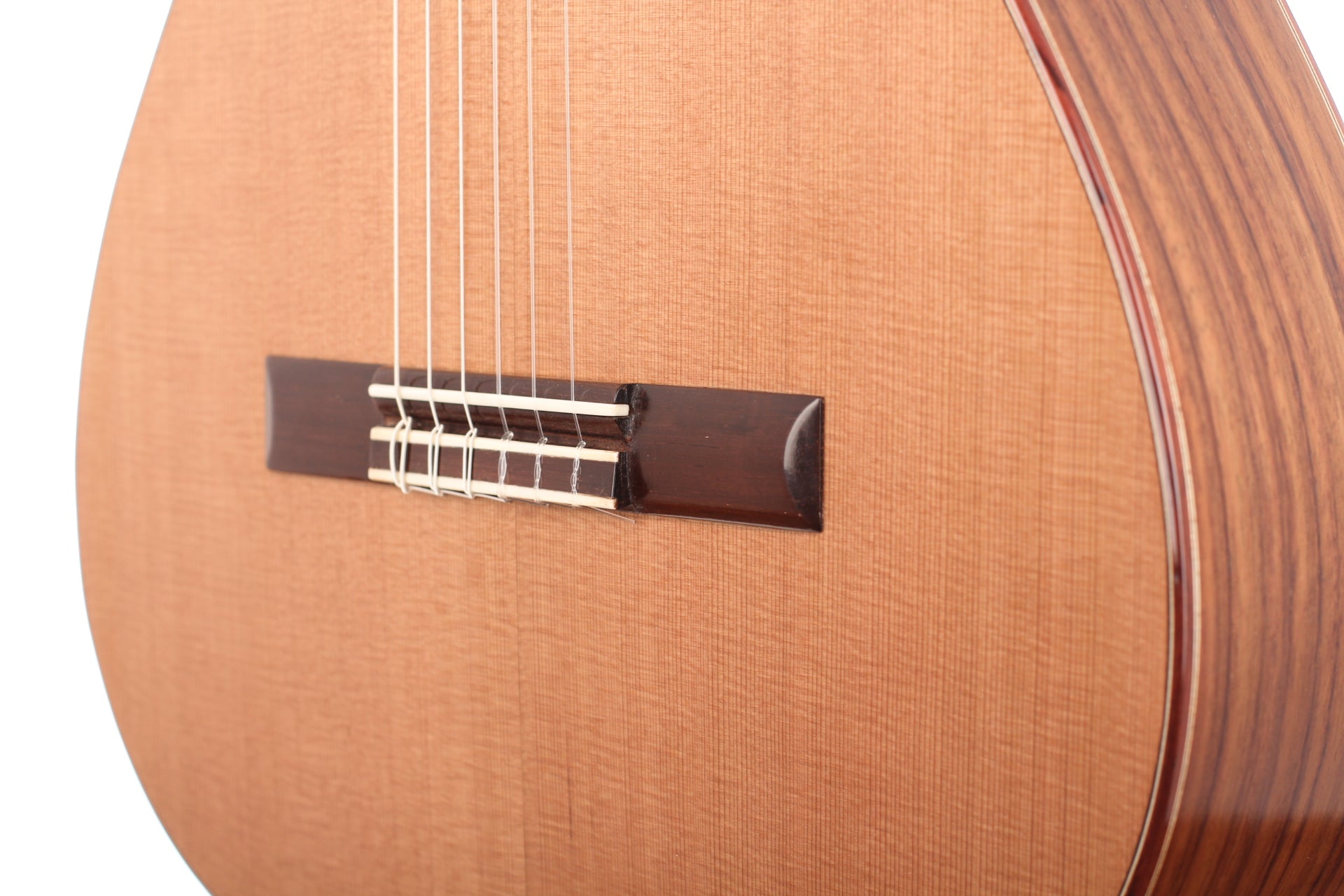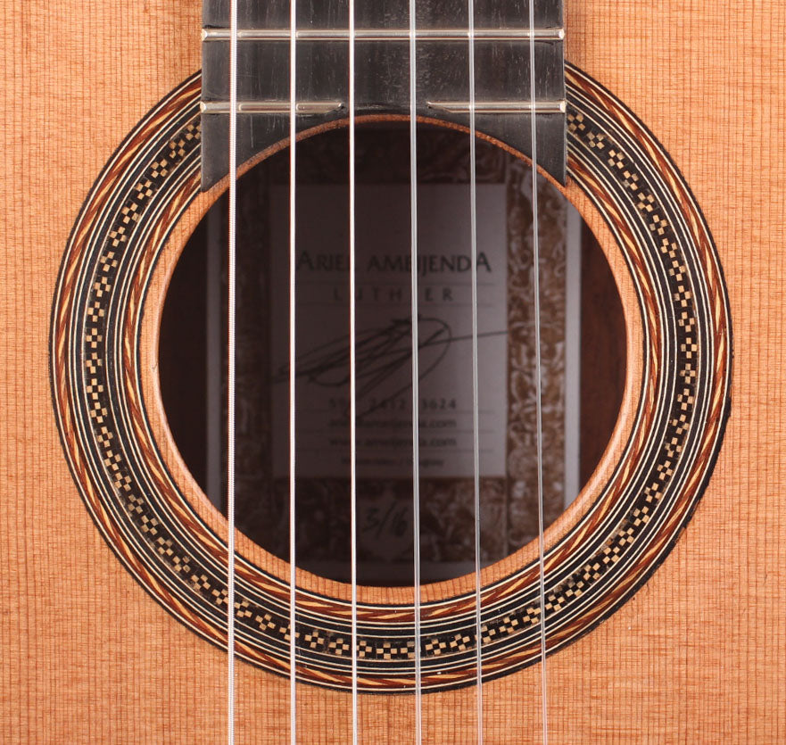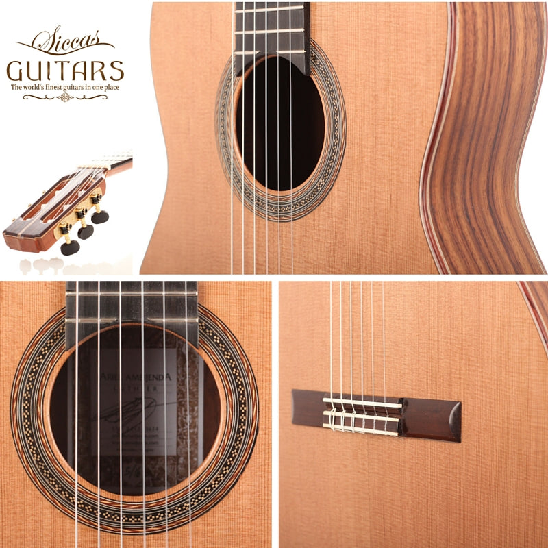 Ariel Ameijenda wurde 1963 in Montevideo (Uruguay) geboren. Er ist der Sohn von Manuel Ameijenda, einem Gitarrenbauer der bei Juan Carlos Santurion den Gitarrenbau erlernte. Santurion war Schüler von Ignacio Fleta. Schon in der Kindheit half Ariel in der Werkstatt des Vaters mit, wo er schon früh Gitarrenbautechniken erlernte. Im Alter von 14 Jahren baute er selbstständig seine ersten Gitarren. 1997 eröffnete Ariel seine erste eigene Werkstatt in Montevideo. Seit 2014 befindet sich seine Wekstatt in Piriapolis, Uruguay. Diese Gitarre wurde 2016 gebaut und hat eine Zederndecke sowie Boden und Zargen aus indischem Palisander. Der Klang ist sehr kräftig und warm, wie man es von einer Zederndeckengitarre erwarten würde. Zugleich ist der Diskant angenehm brillant und hat einen sehr langanhaltendes Sustain. Die Mechaniken sind von Gotoh. Inklusive Hartschalenkoffer.