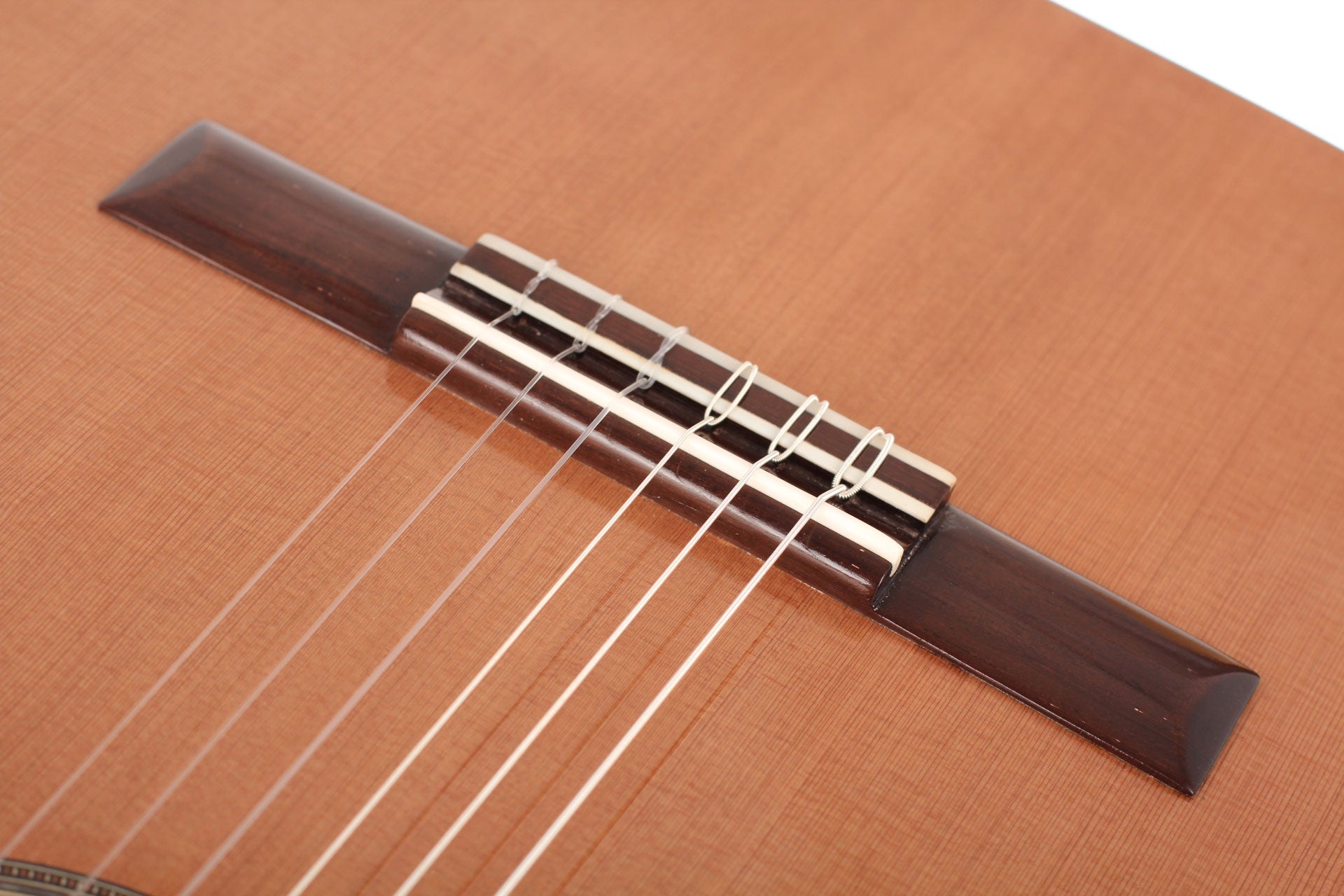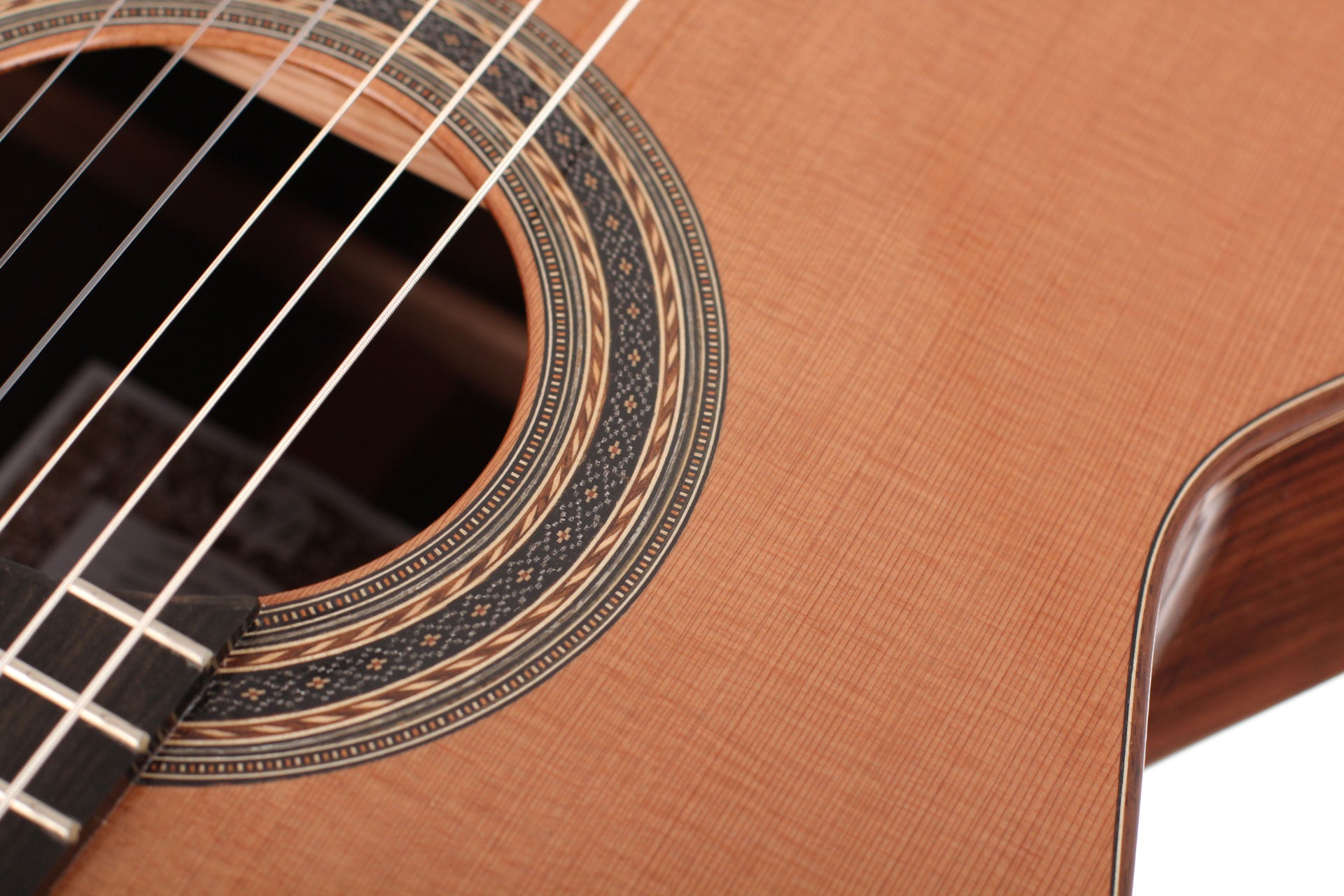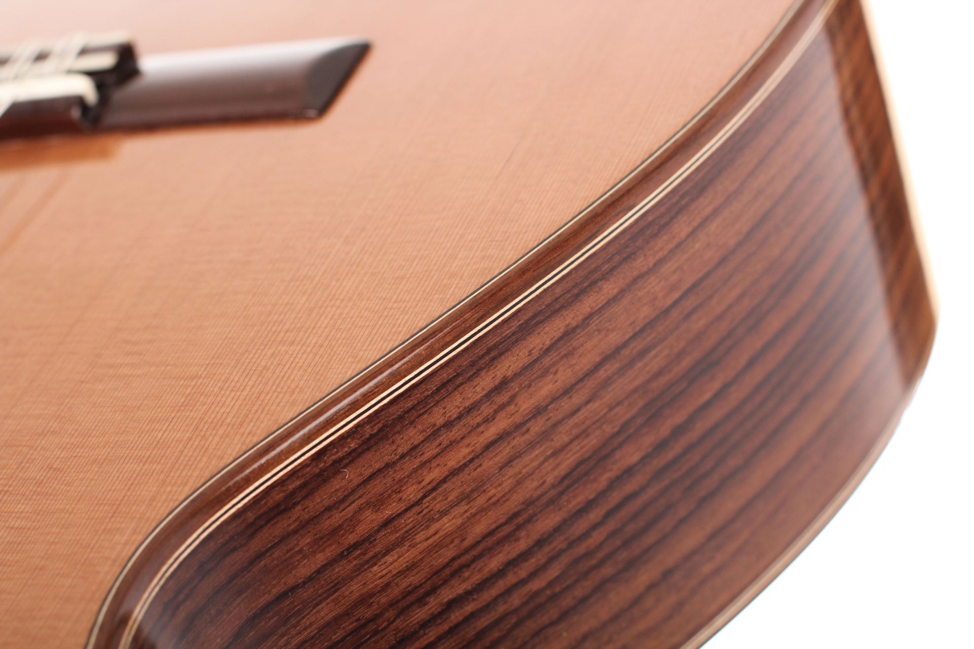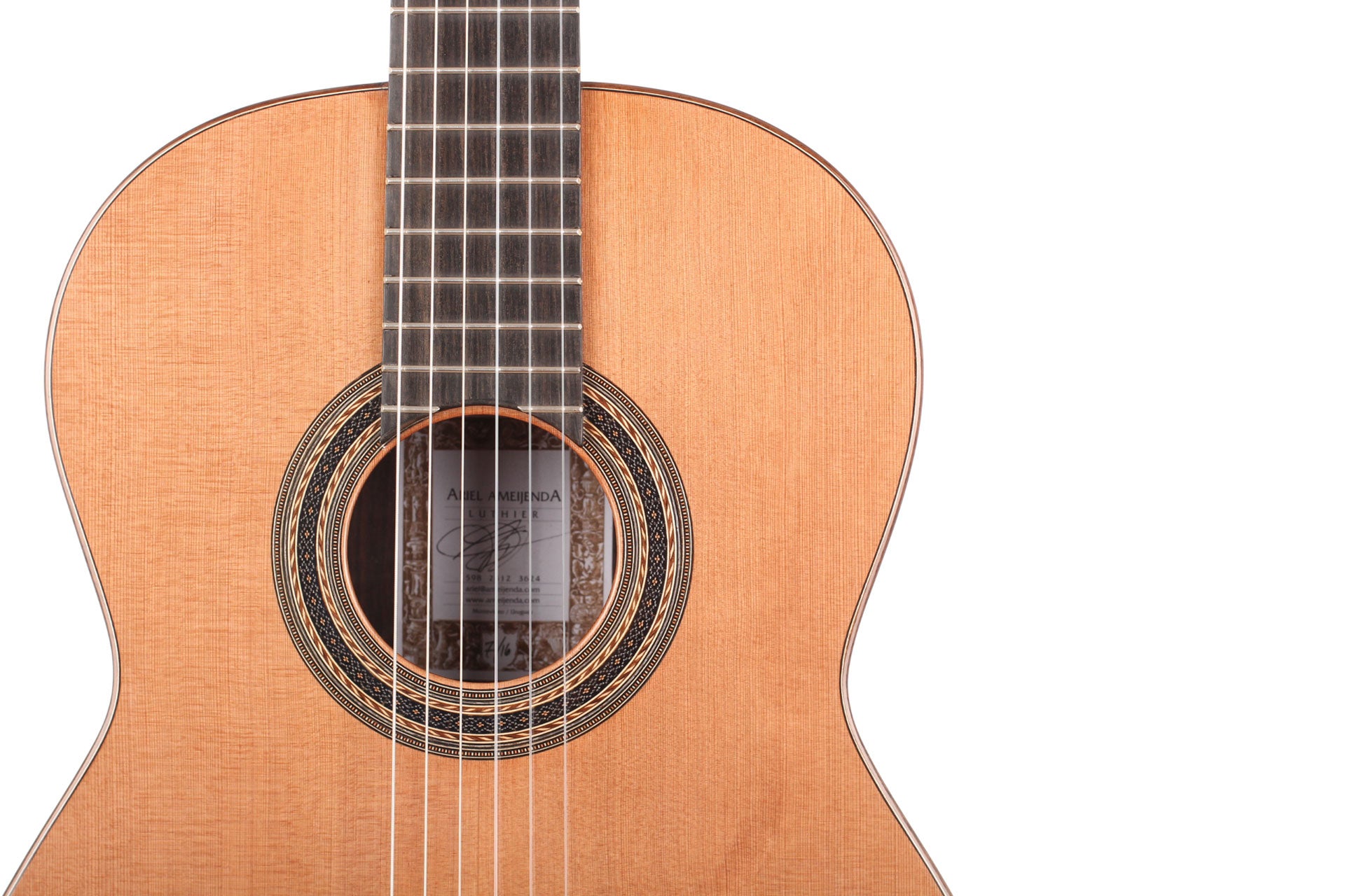 Ariel Ameijenda was born in Montevideo, Uruguay, in 1963, as the son of one the country’s most famous guitar makers, Manuel Ameijenda. Ariel’s father learned this difficult art from Juan Carlos Santurion. Santurion had studied at Fleta’s workshop in Barcelona, Spain in the early 1950’s. the young Ariel who helped in his father’s workshop,learned the finest techniques used by world-class makers of classical guitars and renaissance and baroque string instruments. More importantly, the passion that's necessary for such pursuits came to him quite naturally and very early in life. At the age of 14, under his father’s guidance, Ariel progressed from helping with repairs to the construction of his first instruments. In 1997 Ariel opened his own workshop in Montevideo. Now he sells guitars and period string instruments to musicians all over the world. In 2014, Ariel moved to the heavenly settings of the Cerro de los Burros near the city or Piriapolis at the East Coast of Uruguay to be able to respond to the growing list of orders placed to purchase his guitars and to fully commit to the manufacturing or the finest guitars in a workshop personally designed by him. This guitar has a cedar top and Indian Rosewood back and sides. It provides the warmth and color we would expect from a cedar top guitar. Surprisingly, the pleasant brilliance of the trebles rather remind us of a spruce top. The tuners are made by Gotoh. A hardshell case is included.