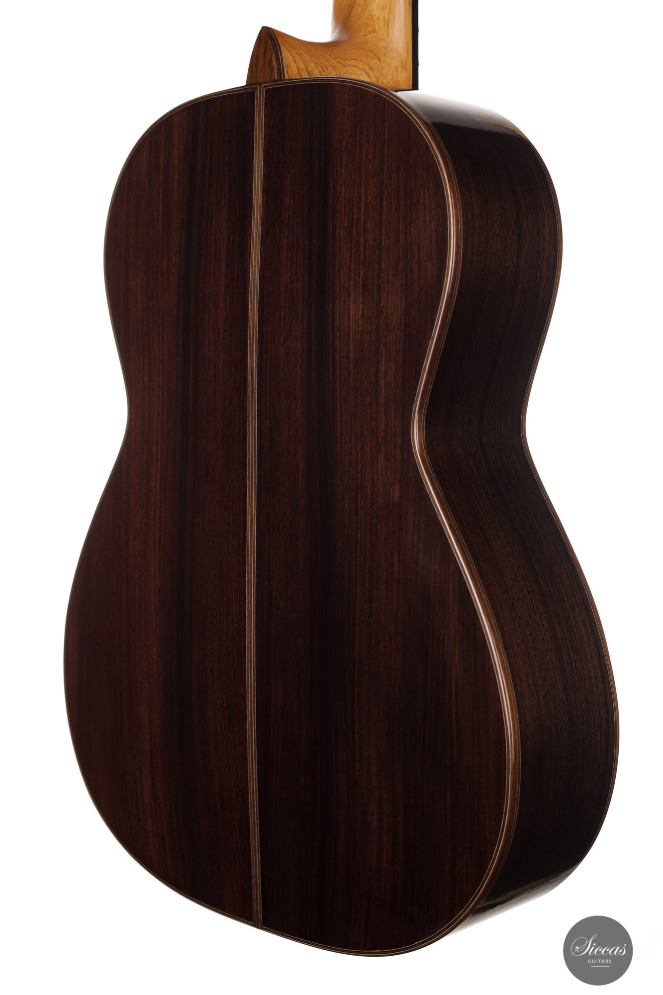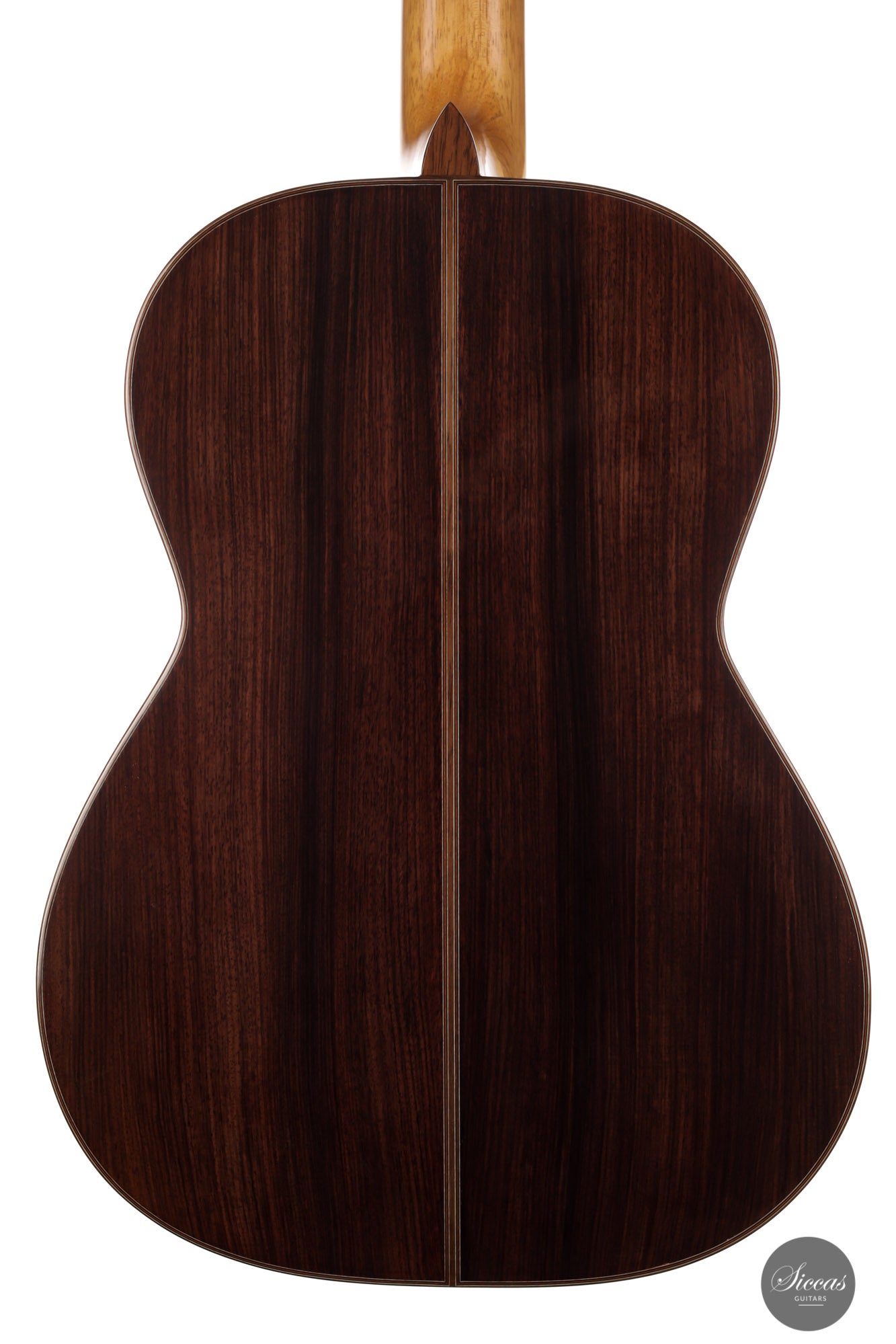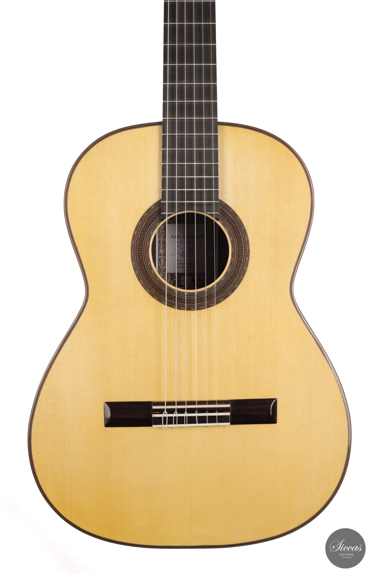 This shorter scale guitar is a particular order from our shop with a focus on sound and playability. Coming directly from Ariel's workshop, it has a 63 cm scale, 2cm shorter than the standard 65 cm scale, making it highly comfortable for the left hand. The bracing is inspired by Antonio de Torres' guitars, making this instrument very responsive, warm, and joyful. In addition, a nice set of dark Indian rosewood was chosen for the back and sides, giving this guitar an elegant and classy appearance.