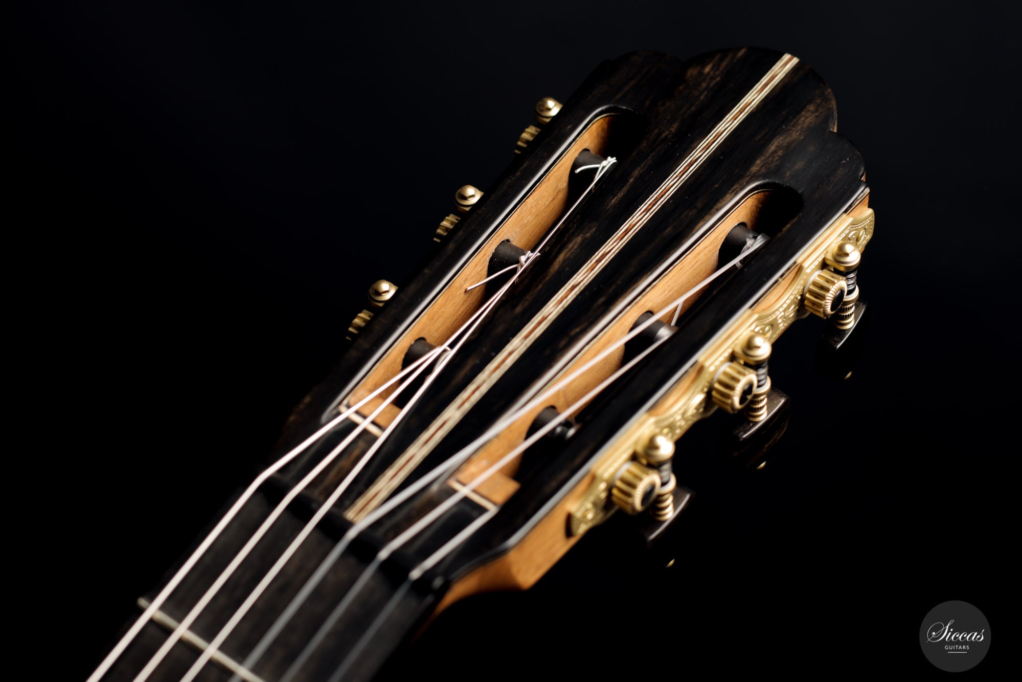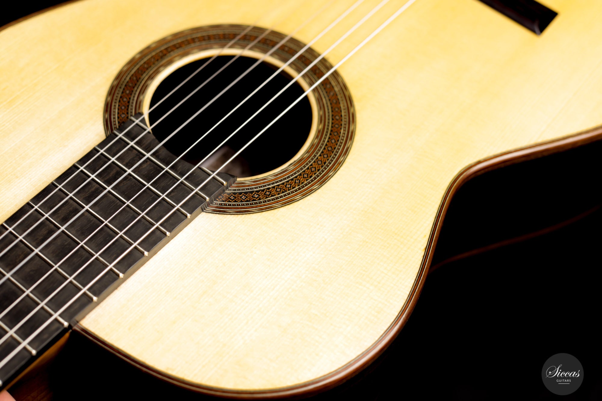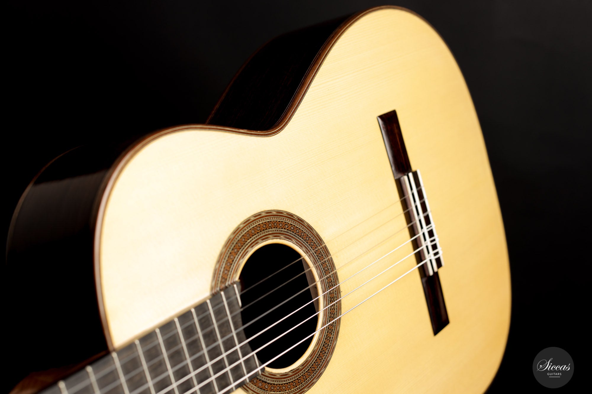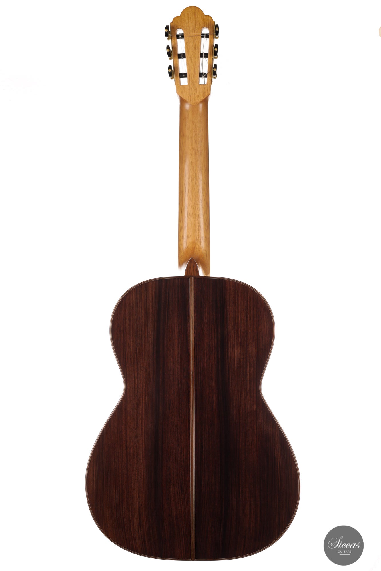 This shorter scale guitar is a particular order from our shop with a focus on sound and playability. Coming directly from Ariel's workshop, it has a 63 cm scale, 2cm shorter than the standard 65 cm scale, making it highly comfortable for the left hand. The bracing is inspired by Antonio de Torres' guitars, making this instrument very responsive, warm, and joyful. In addition, a nice set of dark Indian rosewood was chosen for the back and sides, giving this guitar an elegant and classy appearance.