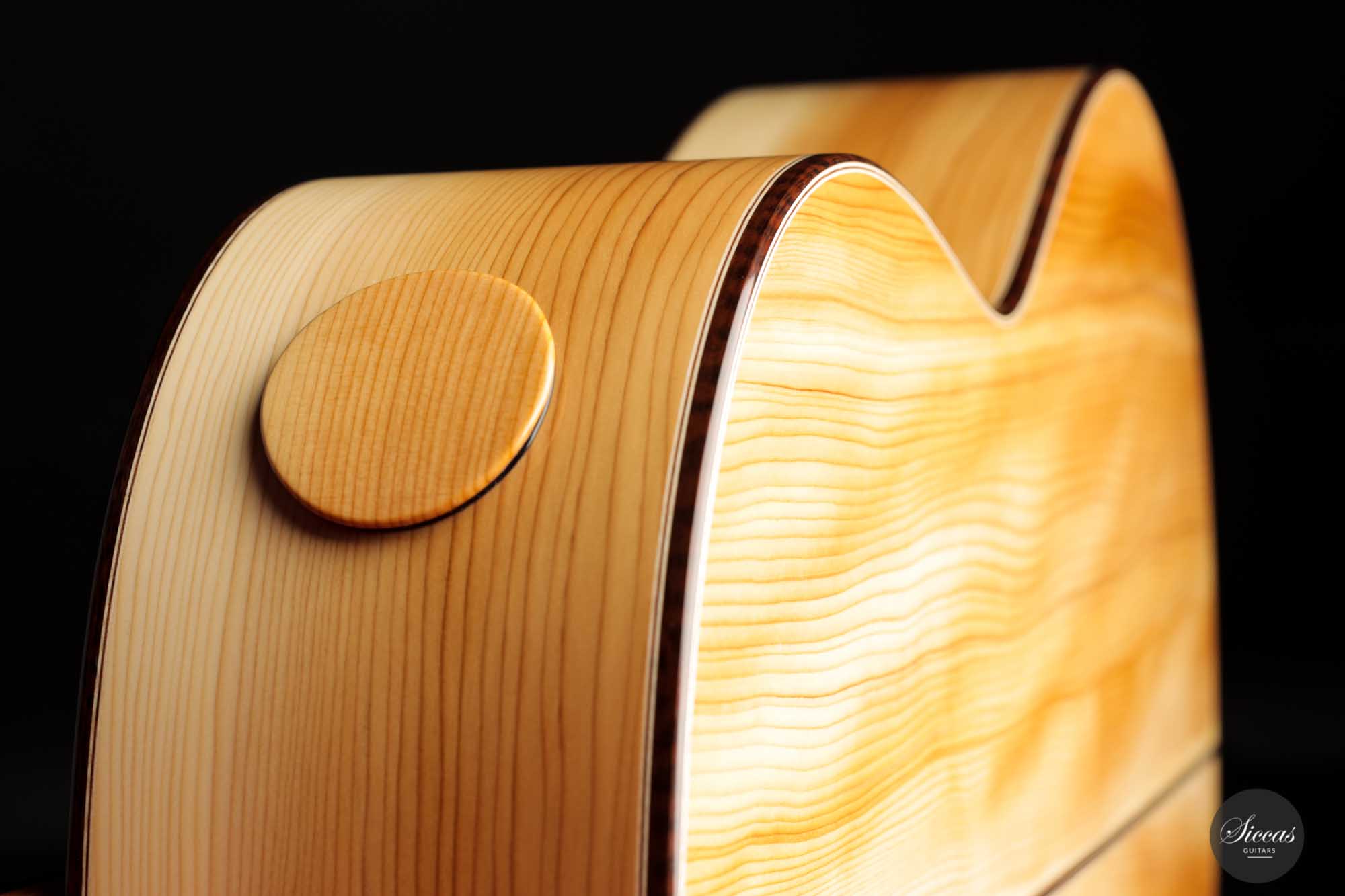 This unique and fascinating guitar is the result of a close and long-lasting partnership with Armin Hanika. It was built especially for Siccas Guitars and we are very pleased to have the opportunity to present this unique instrument exclusively in our shop. Its appearance is captivating due to the stunning European yew wood that was chosen for back and sides. This beautiful wood has a bright colouring and a high density, which provides an excellent sound quality and a fantastic sustain.