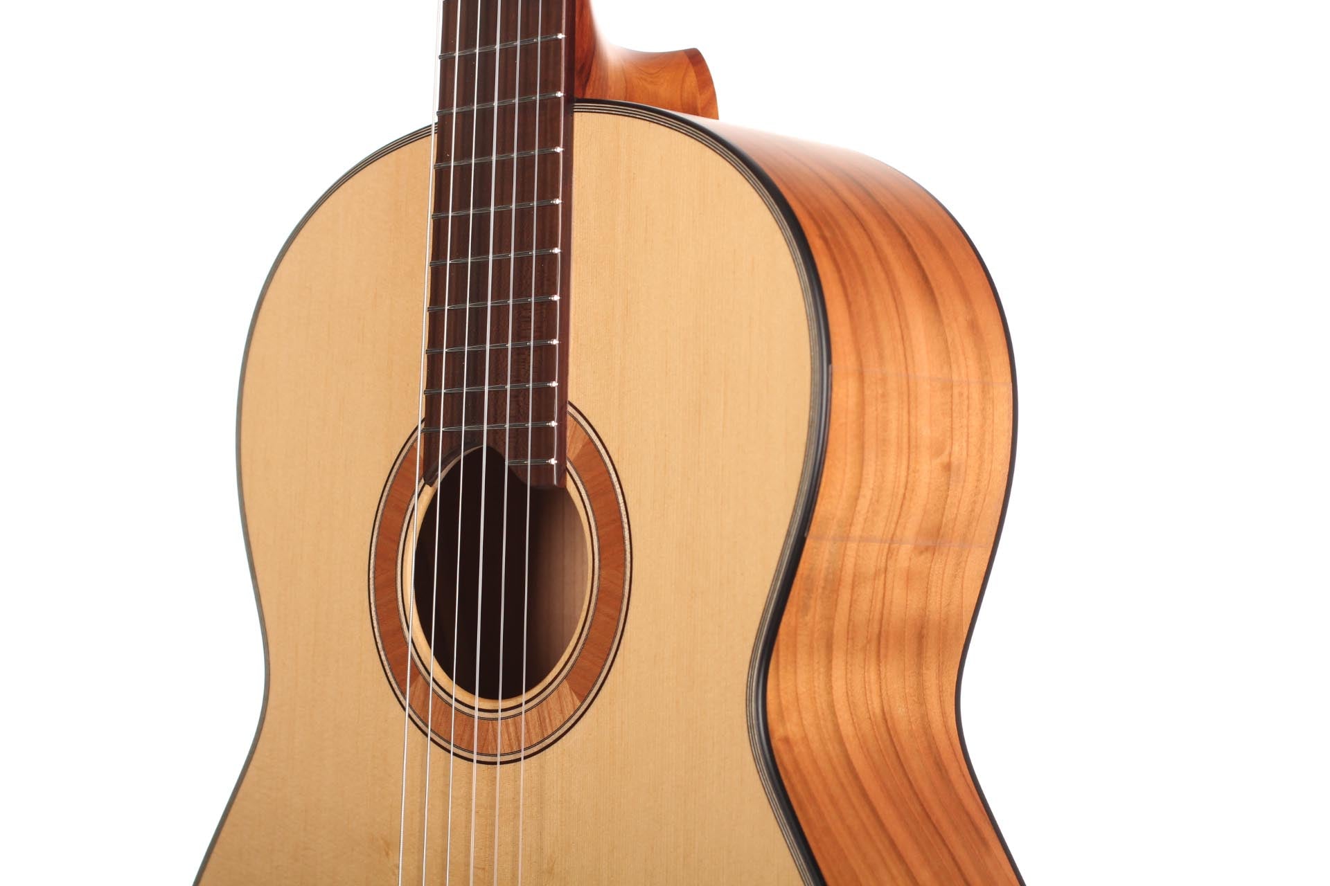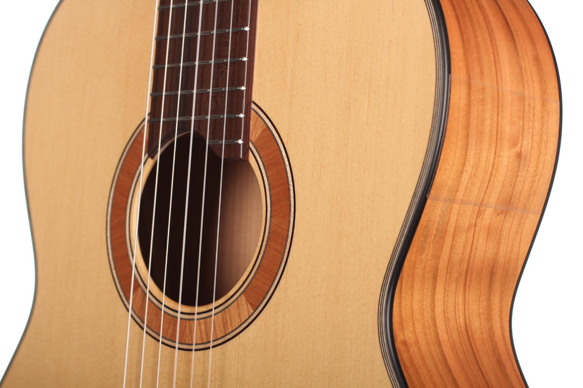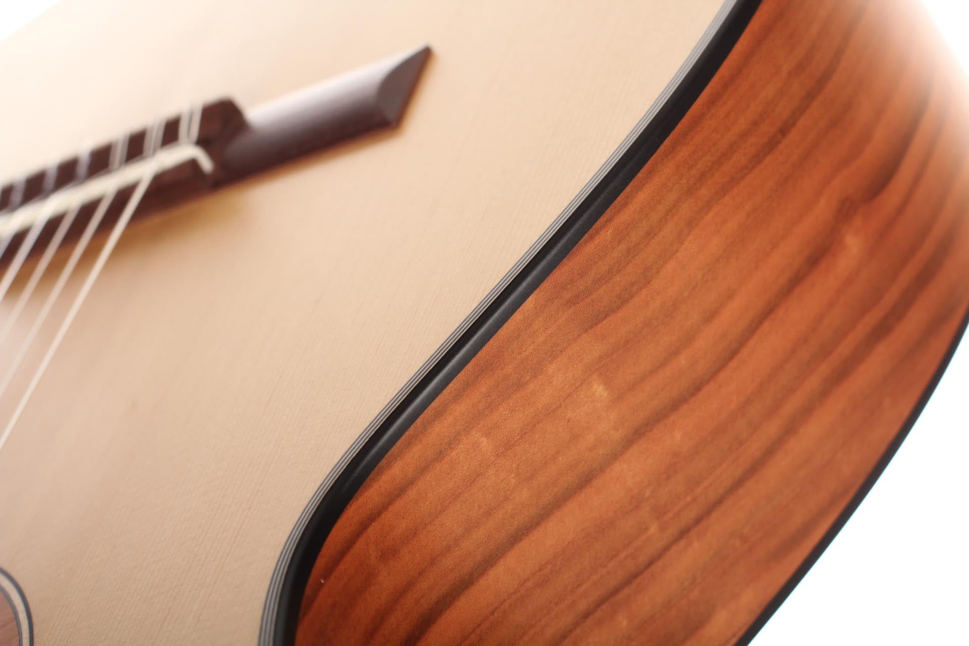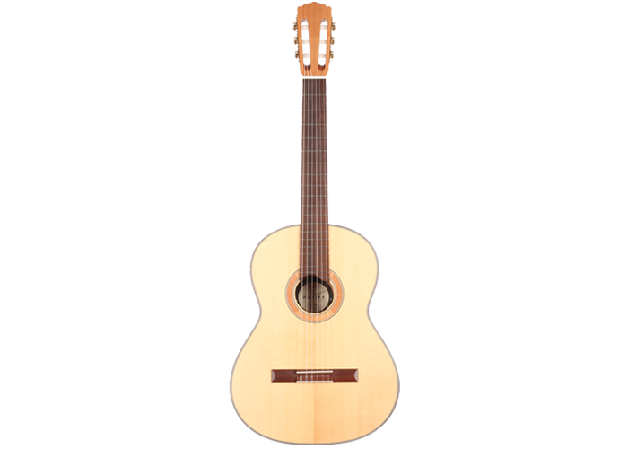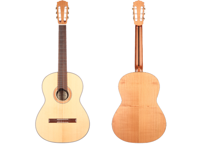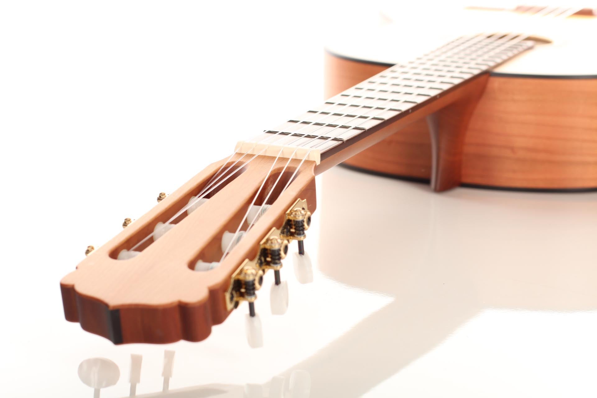 The guitar is made of high quality massive tone woods and has a high gloss finish on back and sides. The Rubner machine heads, the cherry wood neck reinforced with best hardwood, the quality fingerboard show the high quality of 50 KF N. The body has a gloss finish with a UV-curing acrylic lacquer and the top has a matt finish. This guitar is Cites-free (CF).